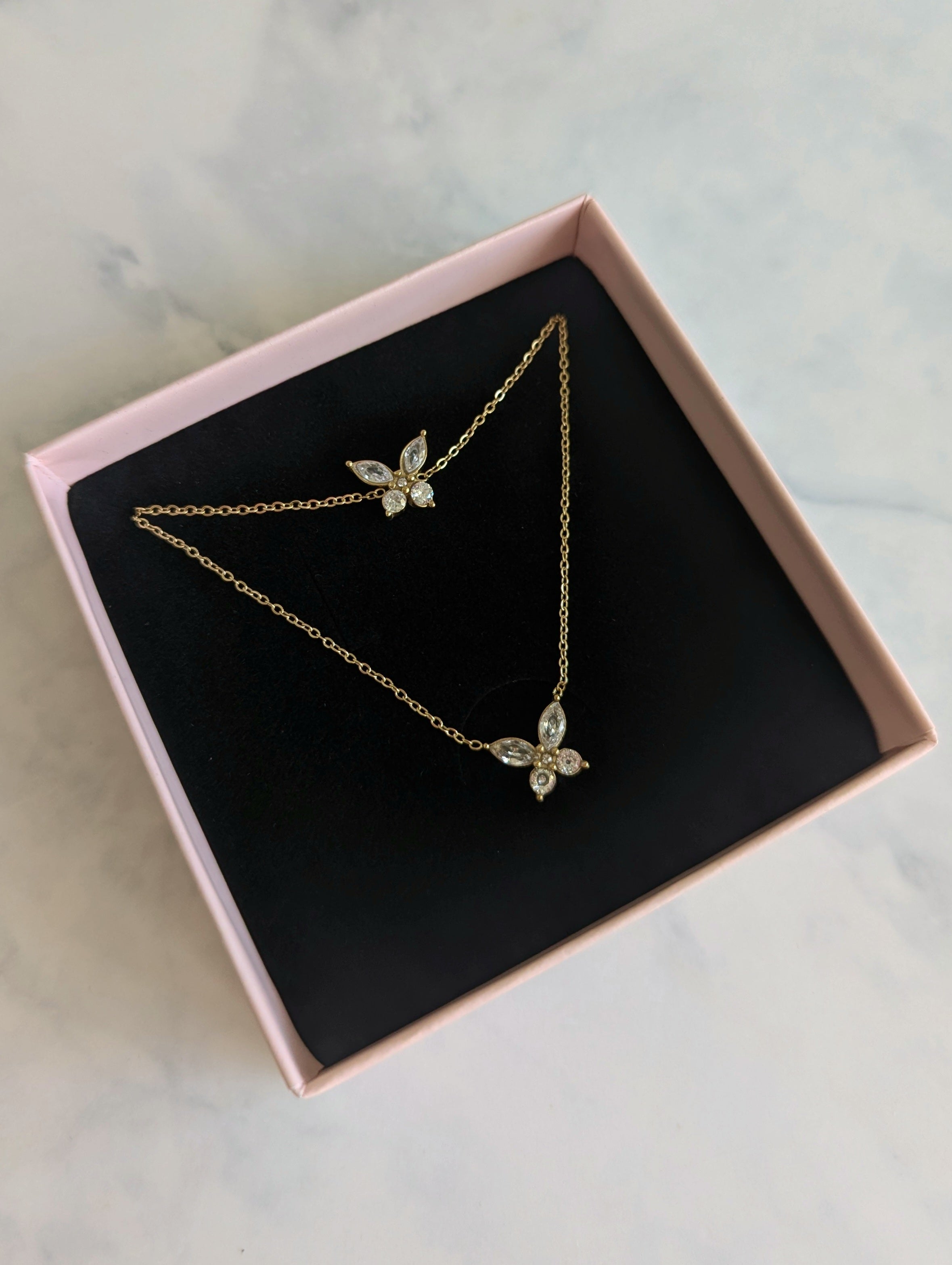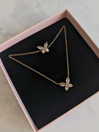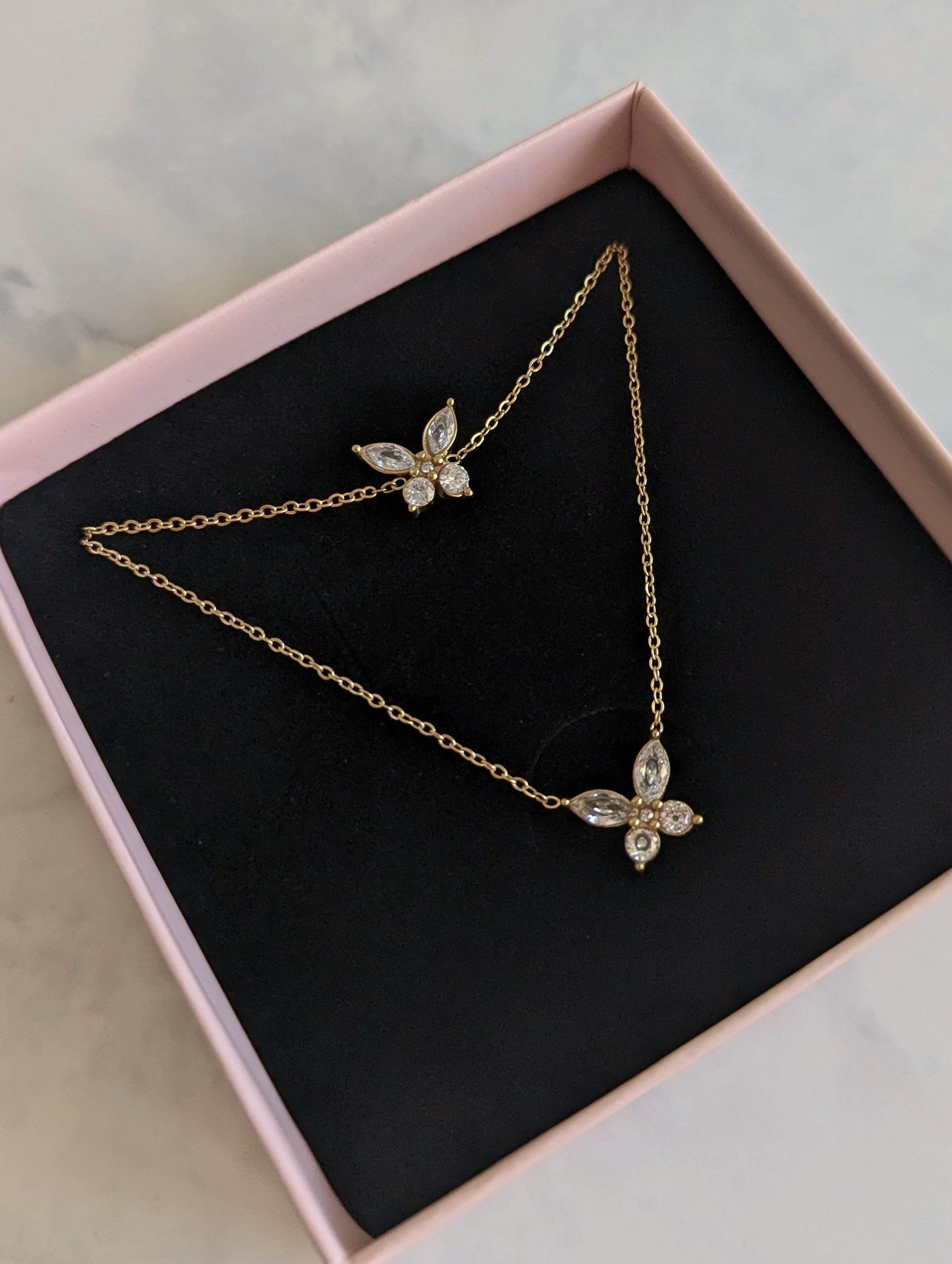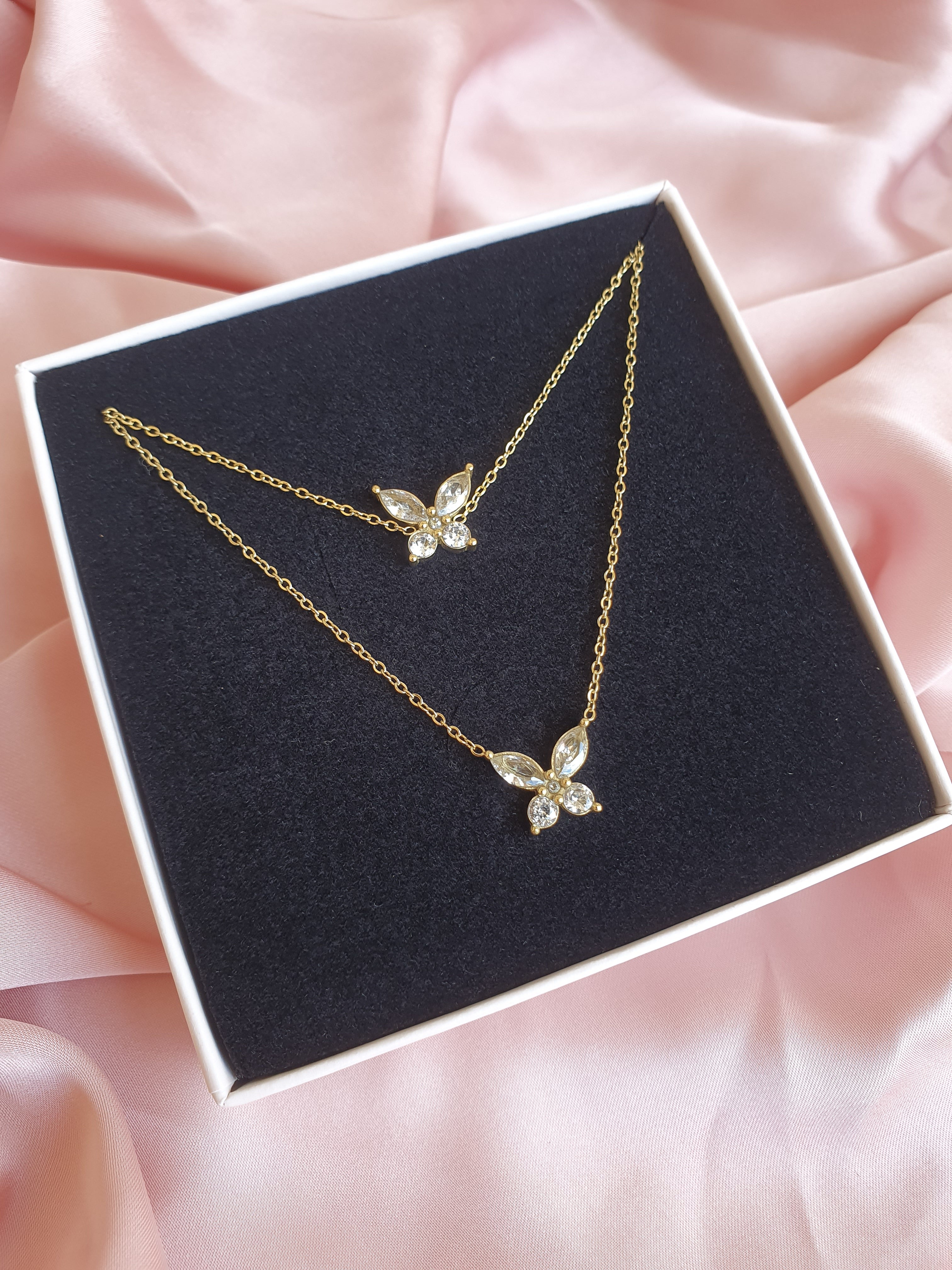 • Sublime parure composée d'un collier et d'un bracelet, tous deux en acier inoxydable doré et zircons blancs véritables dans un magnifique écrin de couleur blanc ou rose poudré.