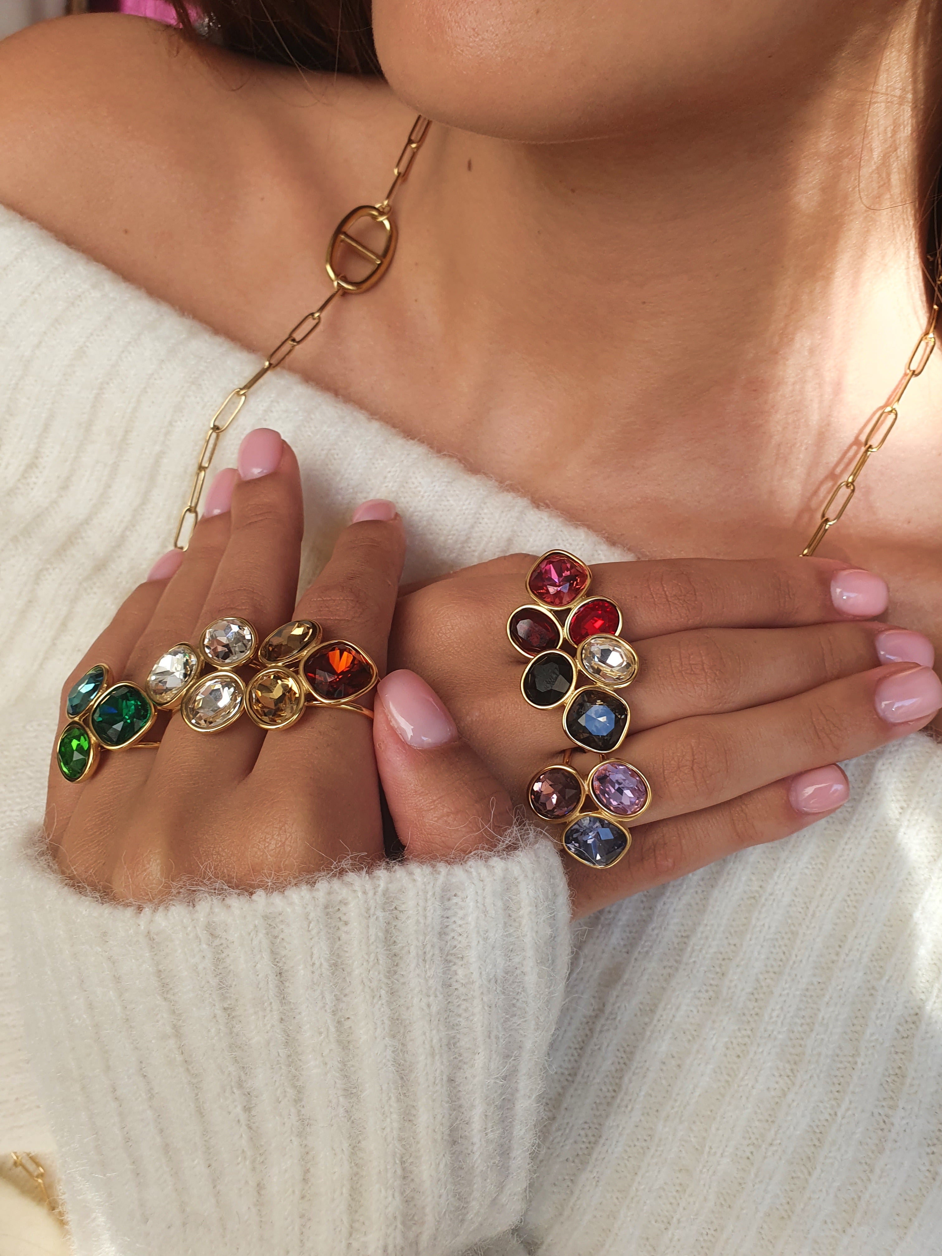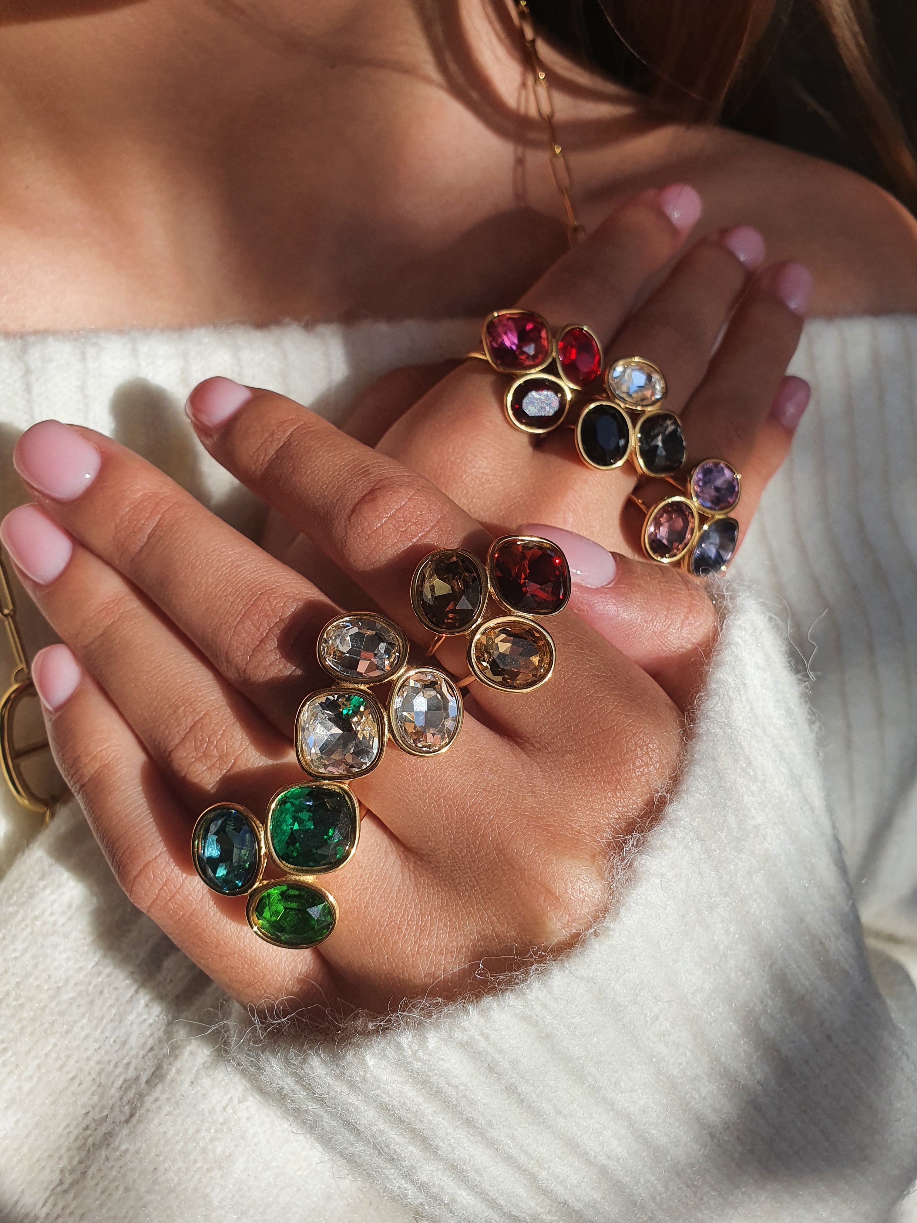 La bague Cristaux d’Hiver met en lumière un cristal étincelant, sublimé par un sertissage doré qui accroche la lumière sous tous les angles. Cette bague en cristal se décline en plusieurs teintes iconiques. Son design élégant en fait un bijou festif idéal pour la saison de Noël.