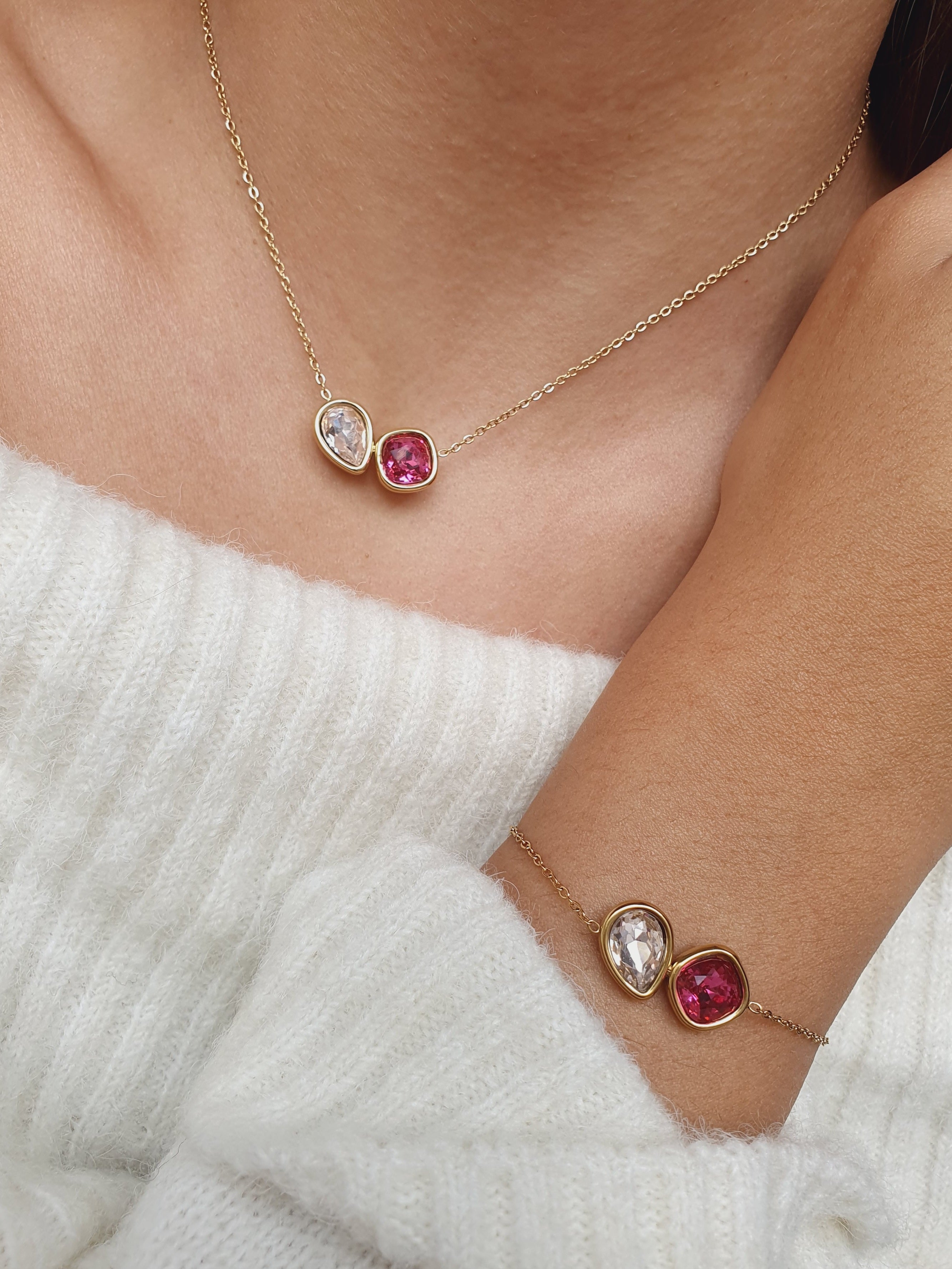 Le bracelet et le collier Cristaux d’Hiver dévoilent deux cristaux délicatement sertis dans une monture dorée, créant un jeu de lumières subtil et harmonieux.