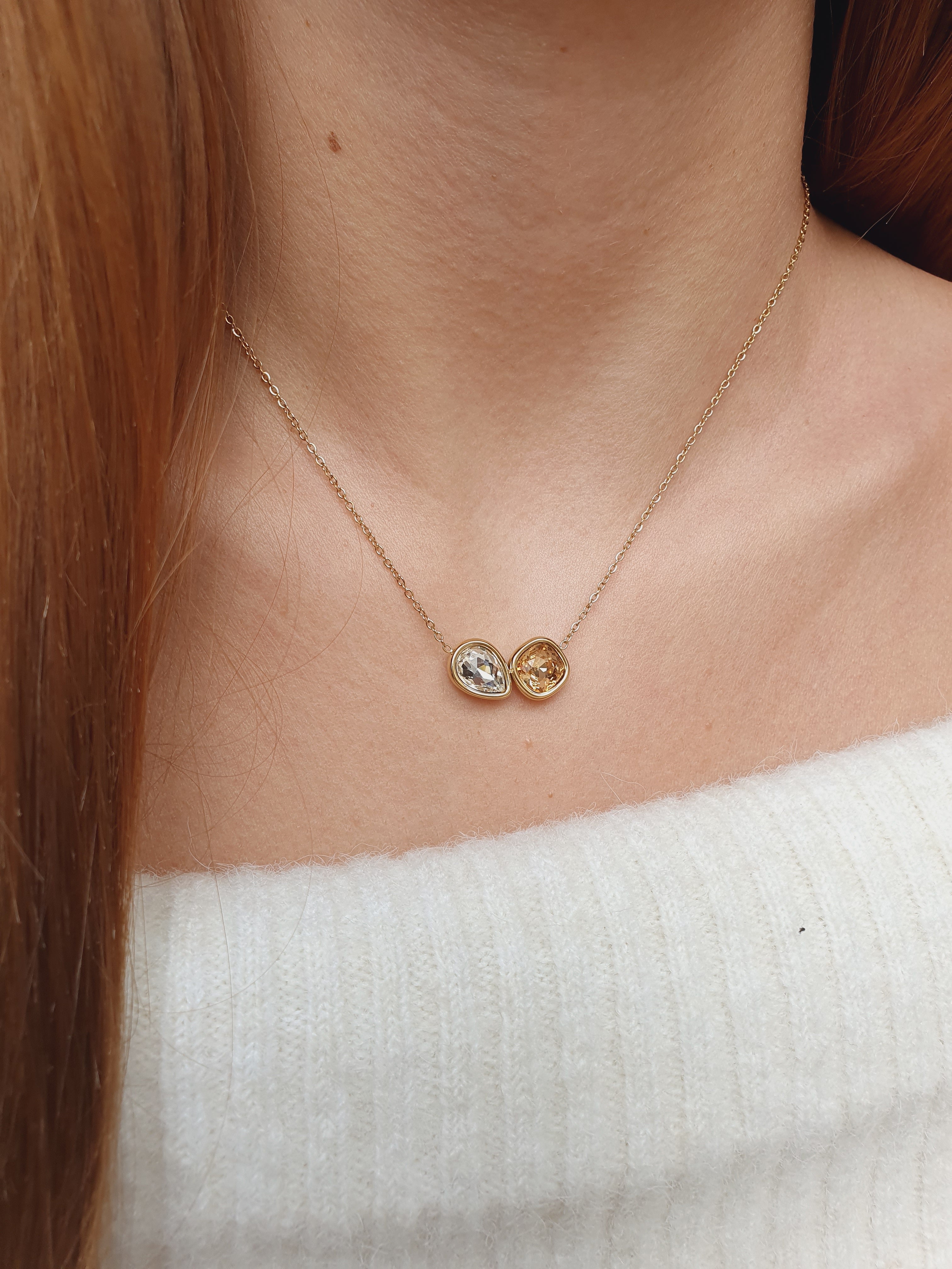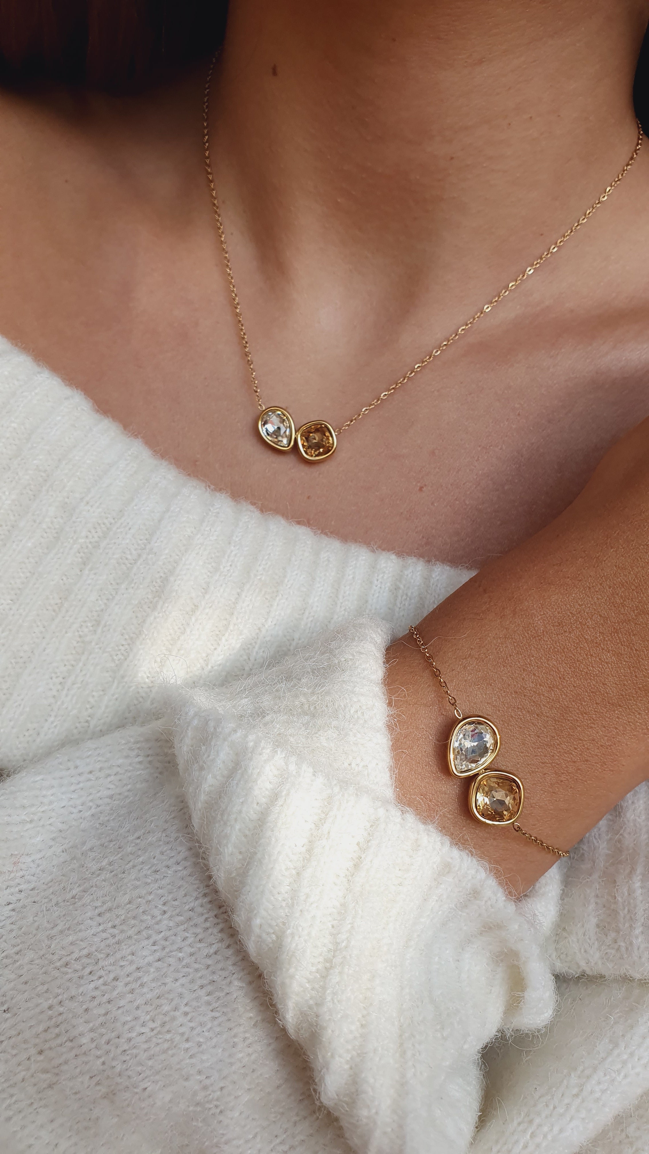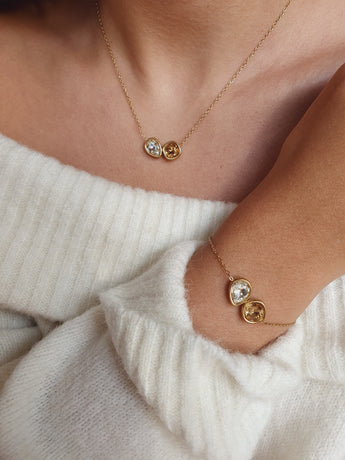 Le bracelet et le collier Cristaux d’Hiver dévoilent deux cristaux délicatement sertis dans une monture dorée, créant un jeu de lumières subtil et harmonieux.