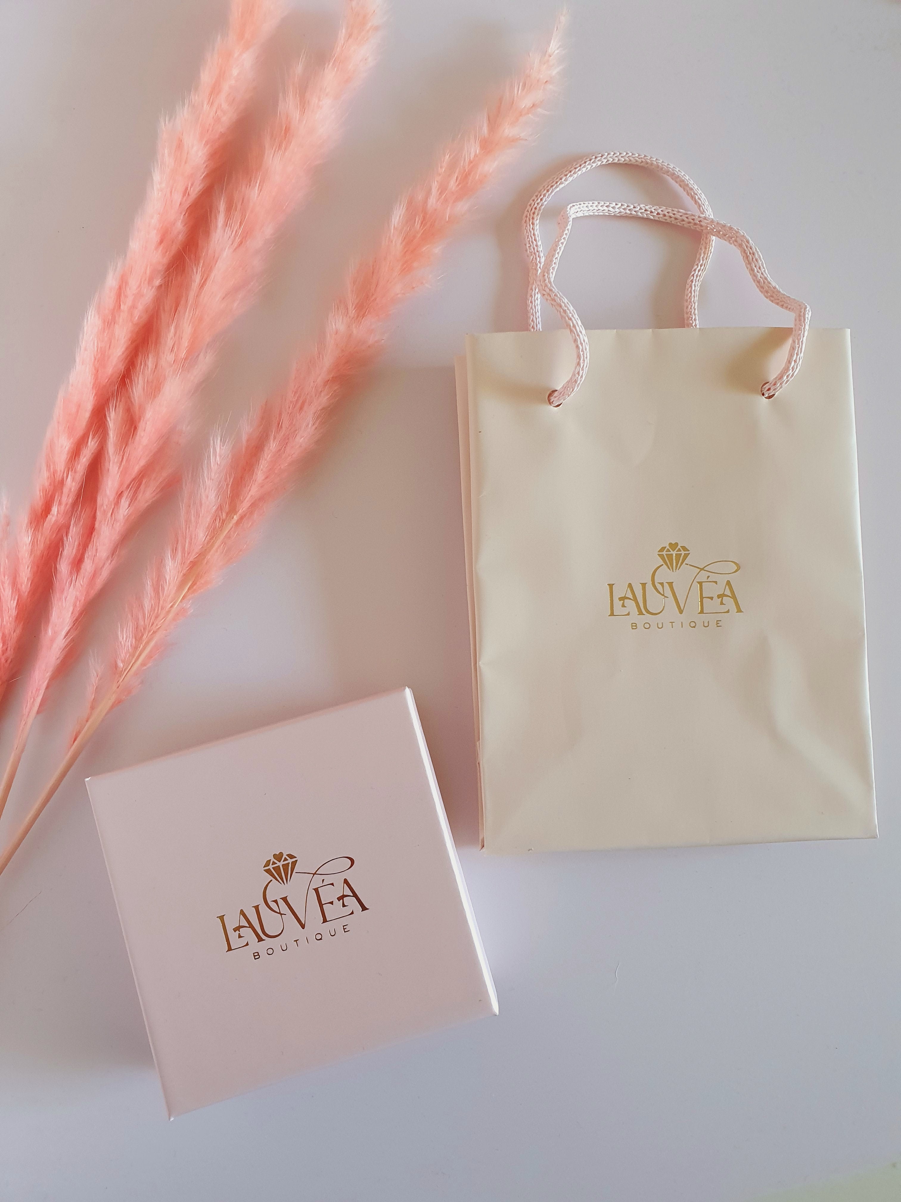 Cette option d’emballage associe un écrin rigide et un sac assorti, tous deux dans une teinte rose poudré douce et féminine, ornés du logo doré LauVéA Boutique.