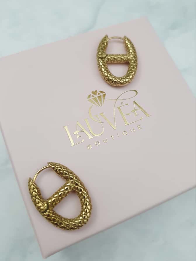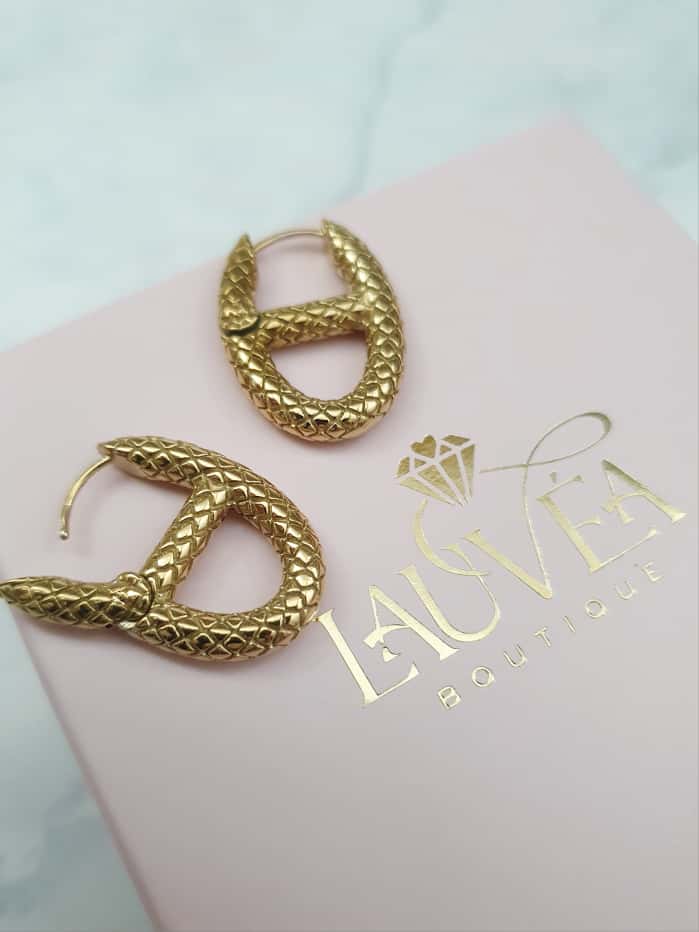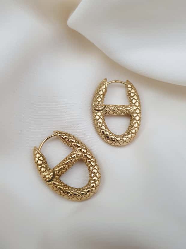 Ces boucles d’oreilles dorées au design tressé s’inspirent de l’élégance des textures serpent. Leur forme sculptée, à la fois originale et intemporelle, capte la lumière et apporte un style affirmé sans jamais être trop chargé.