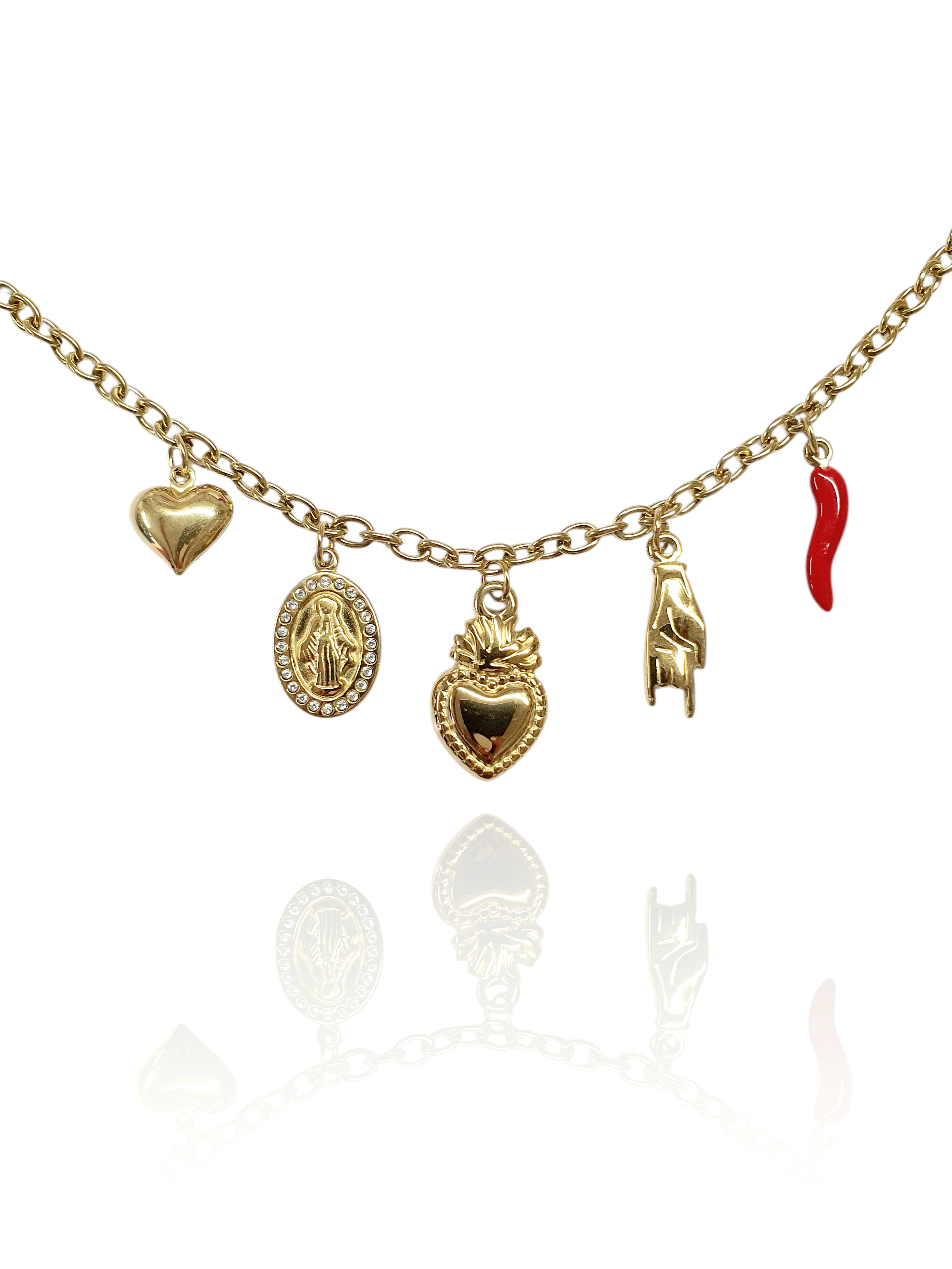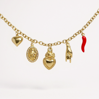 Un collier chargé de symboles, pensé comme un porte-bonheur à porter au quotidien. Sa chaîne en acier inoxydable accueille des breloques iconiques en acier inoxydable également. Un mélange de spiritualité et de style, pour celles qui aiment les bijoux qui racontent une histoire et veillent sur elles.
