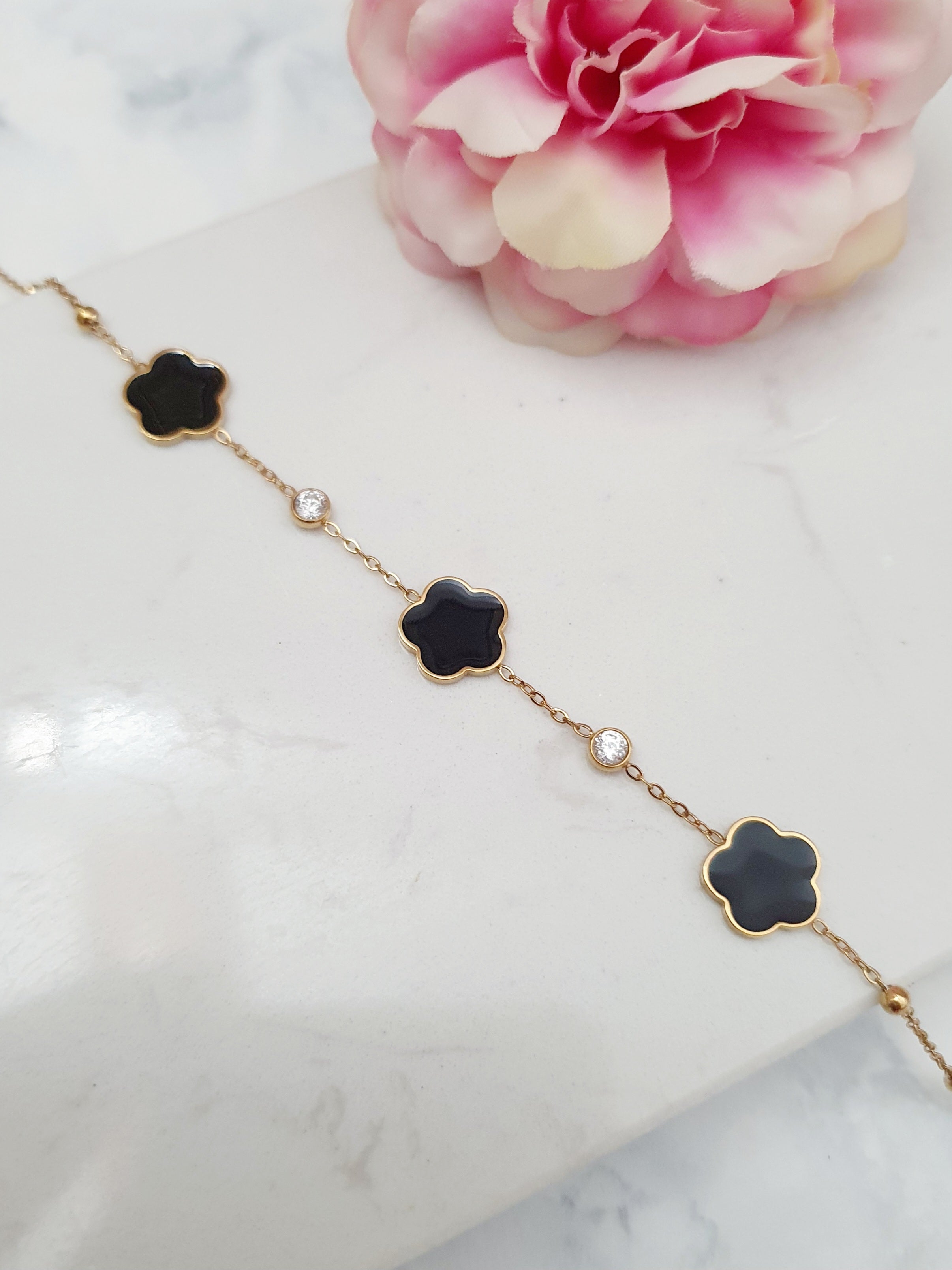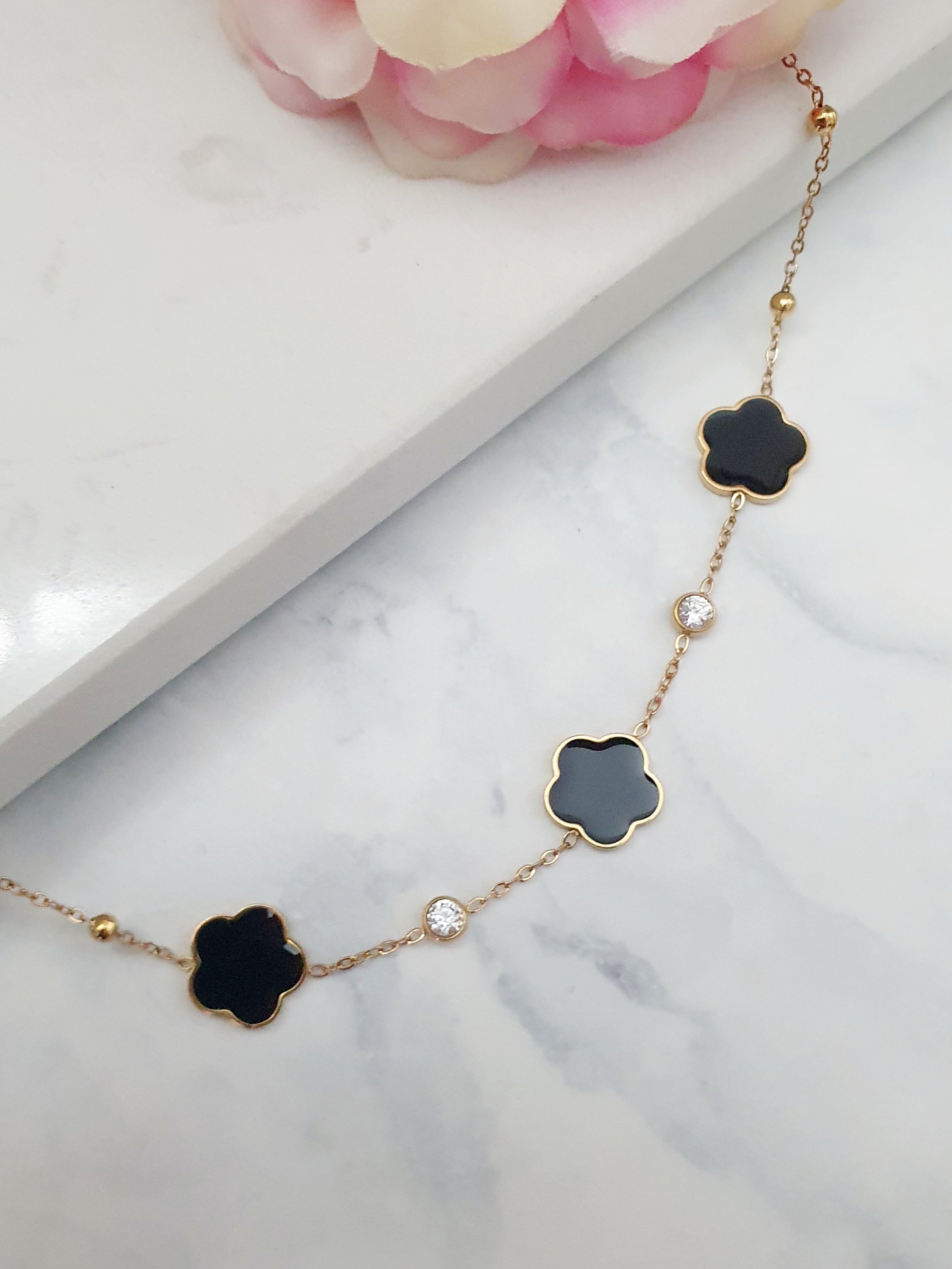 Bracelet fleur noire & zircons - doré