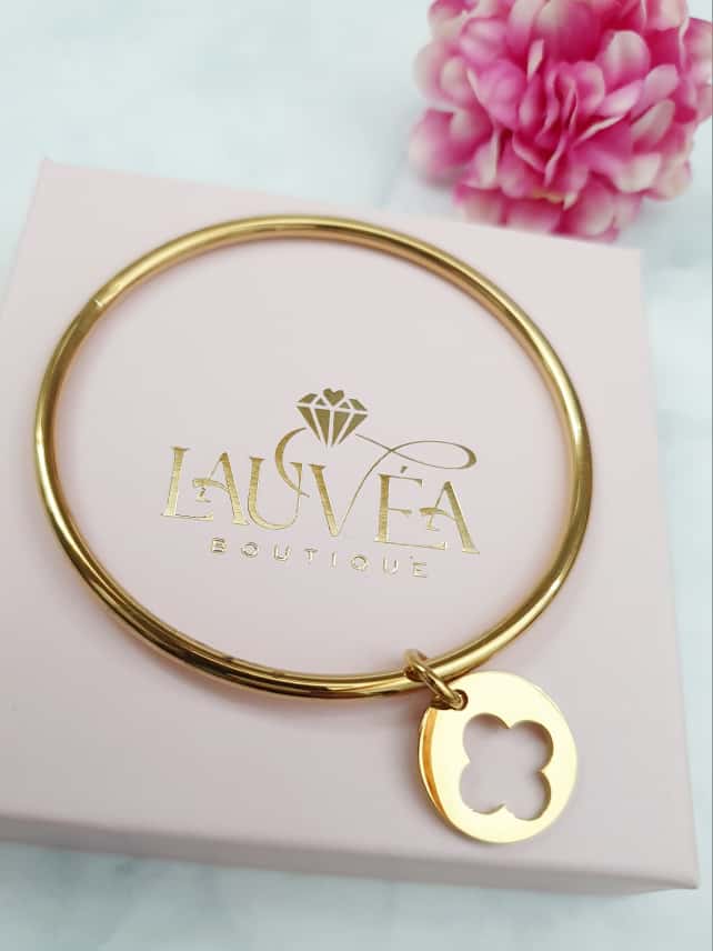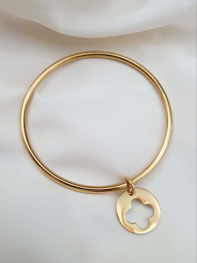 Succombez à notre magnifique jonc en acier inoxydable avec breloque en forme de trèfle à 4 feuilles.