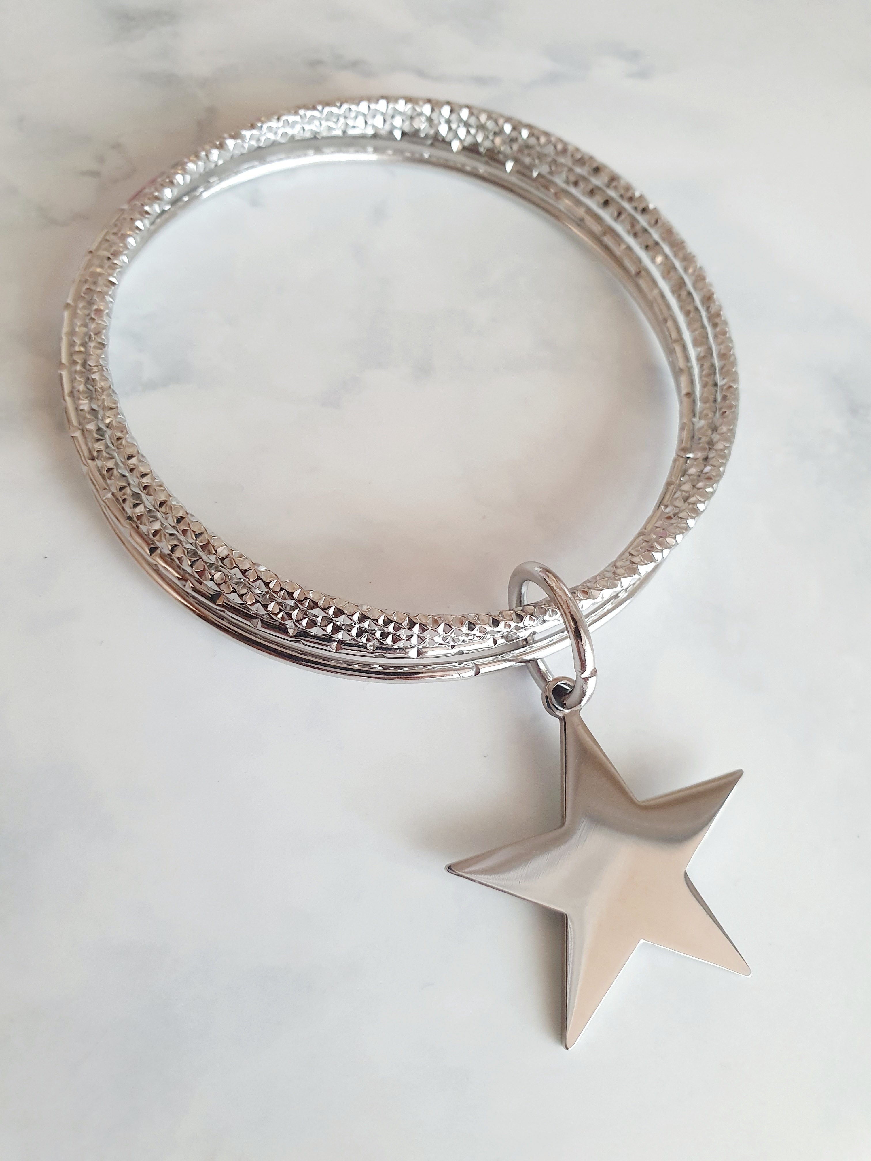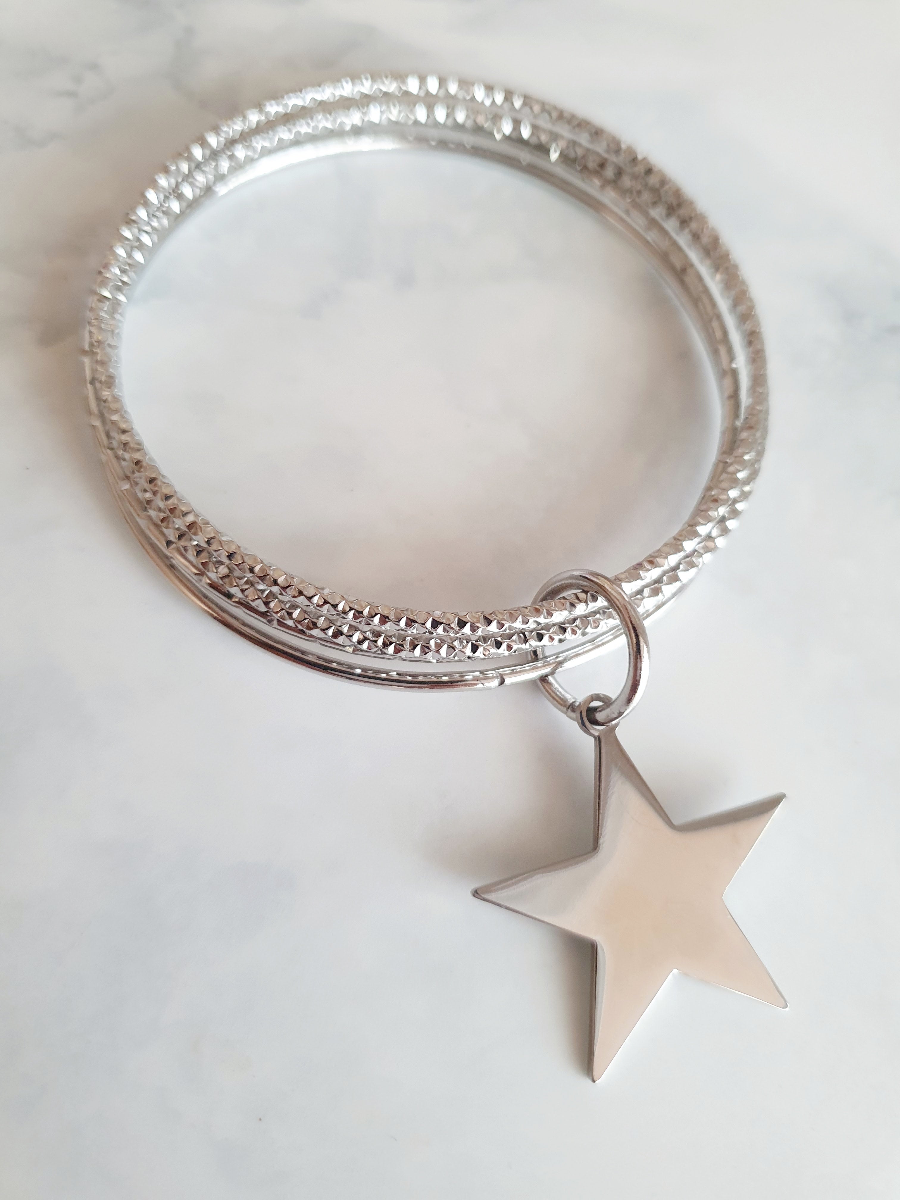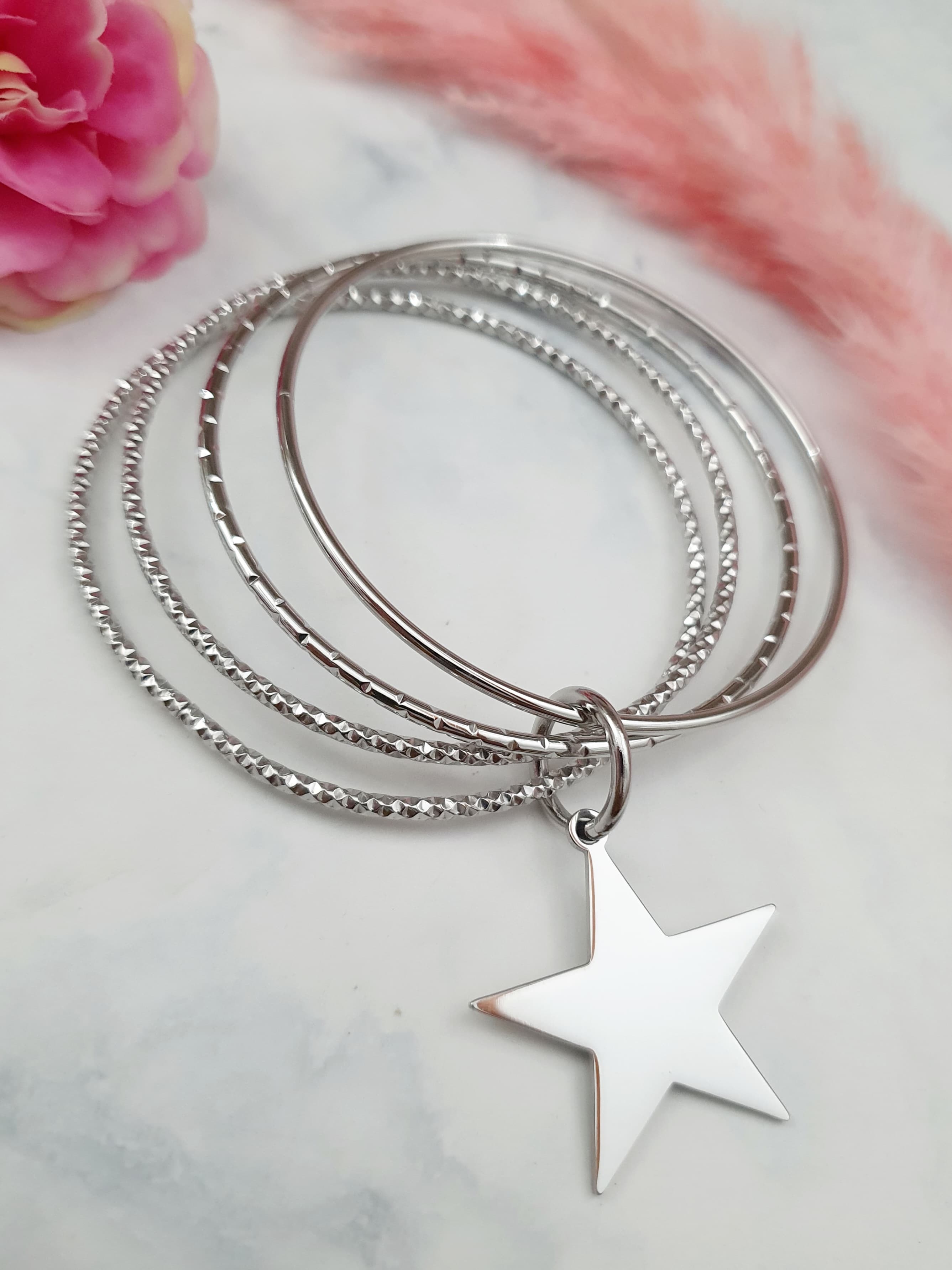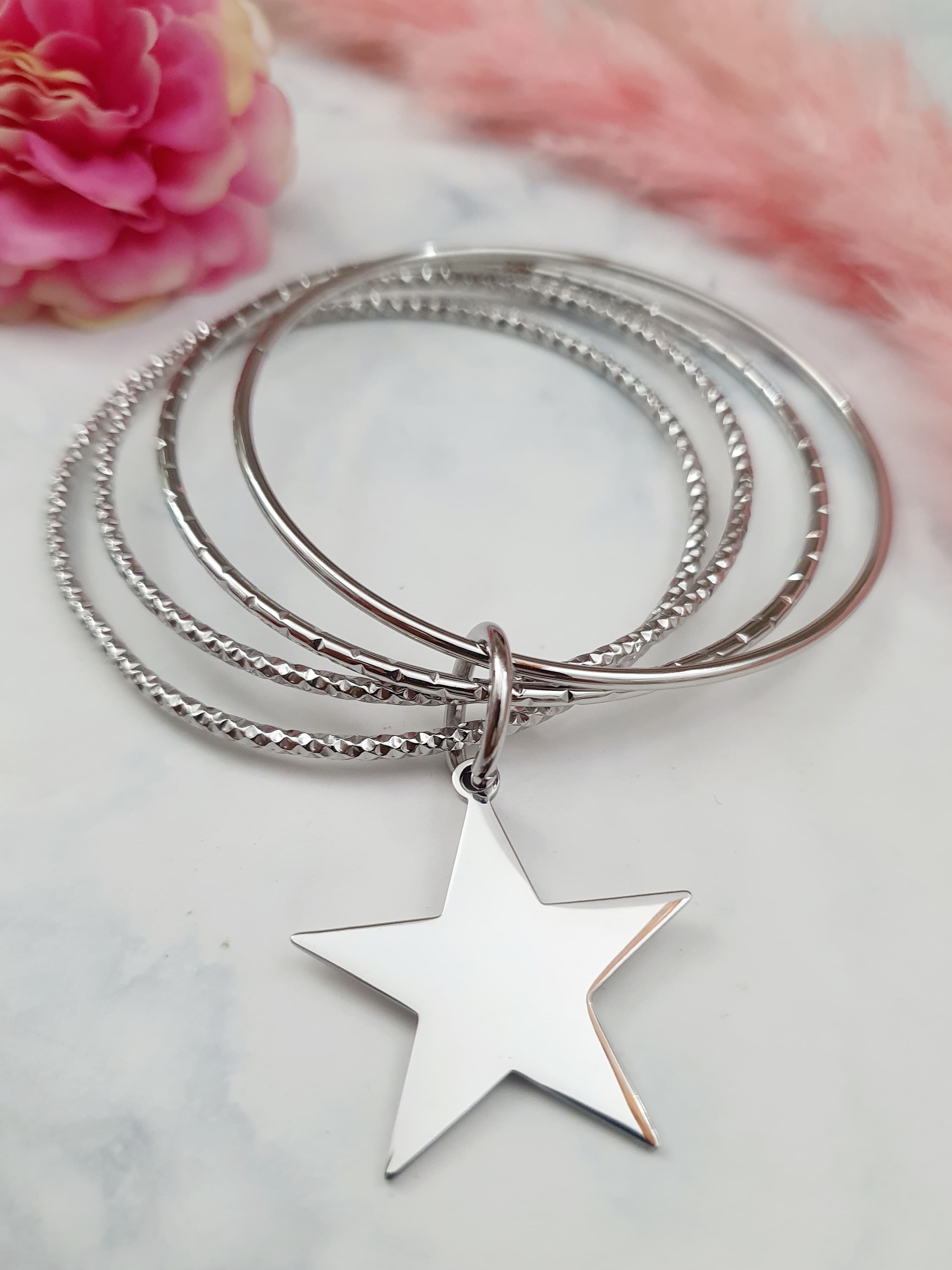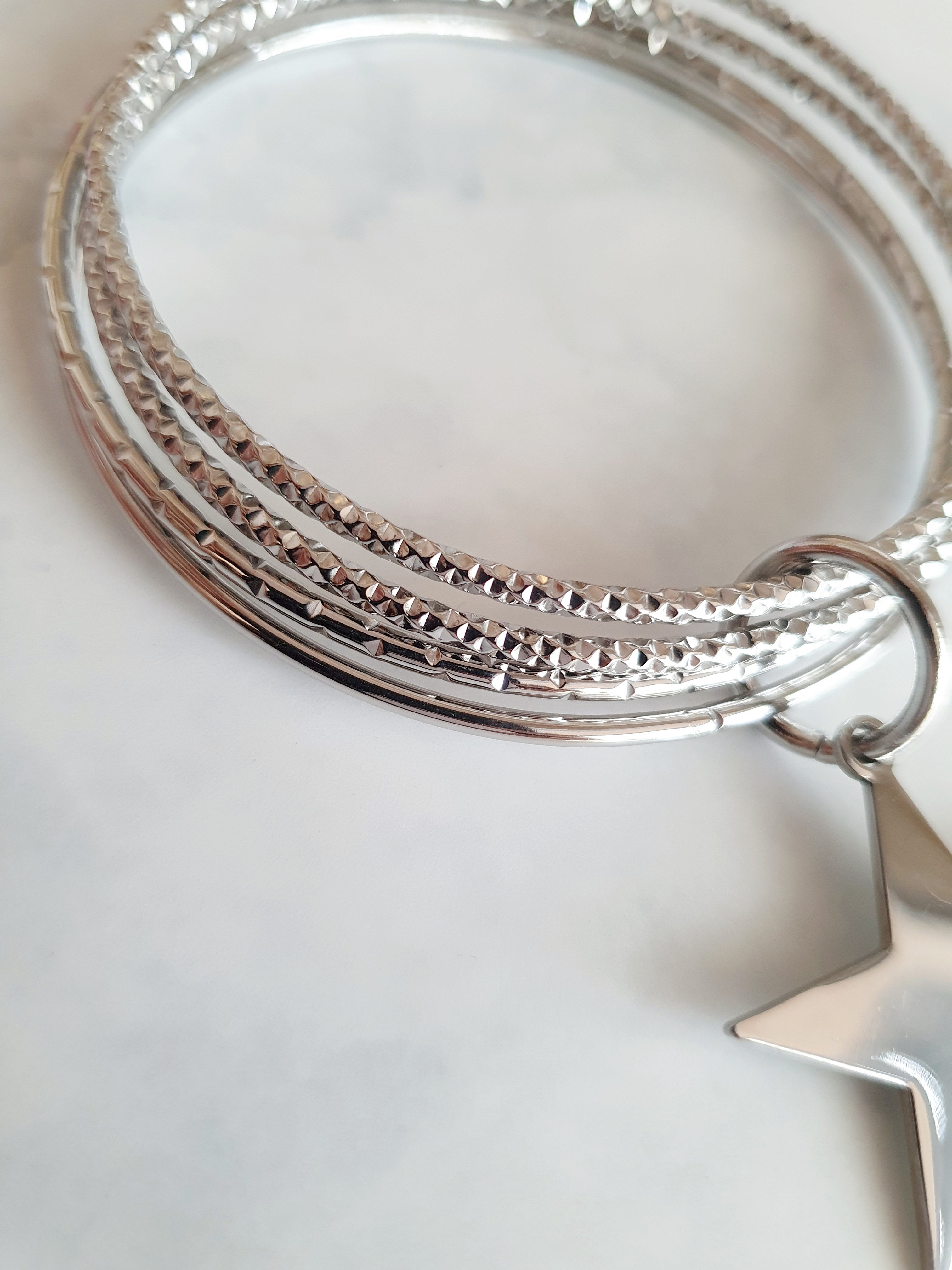 Magnifique bracelet composé de 4 joncs striés en acier inoxydable argenté avec breloque en forme d'étoile.