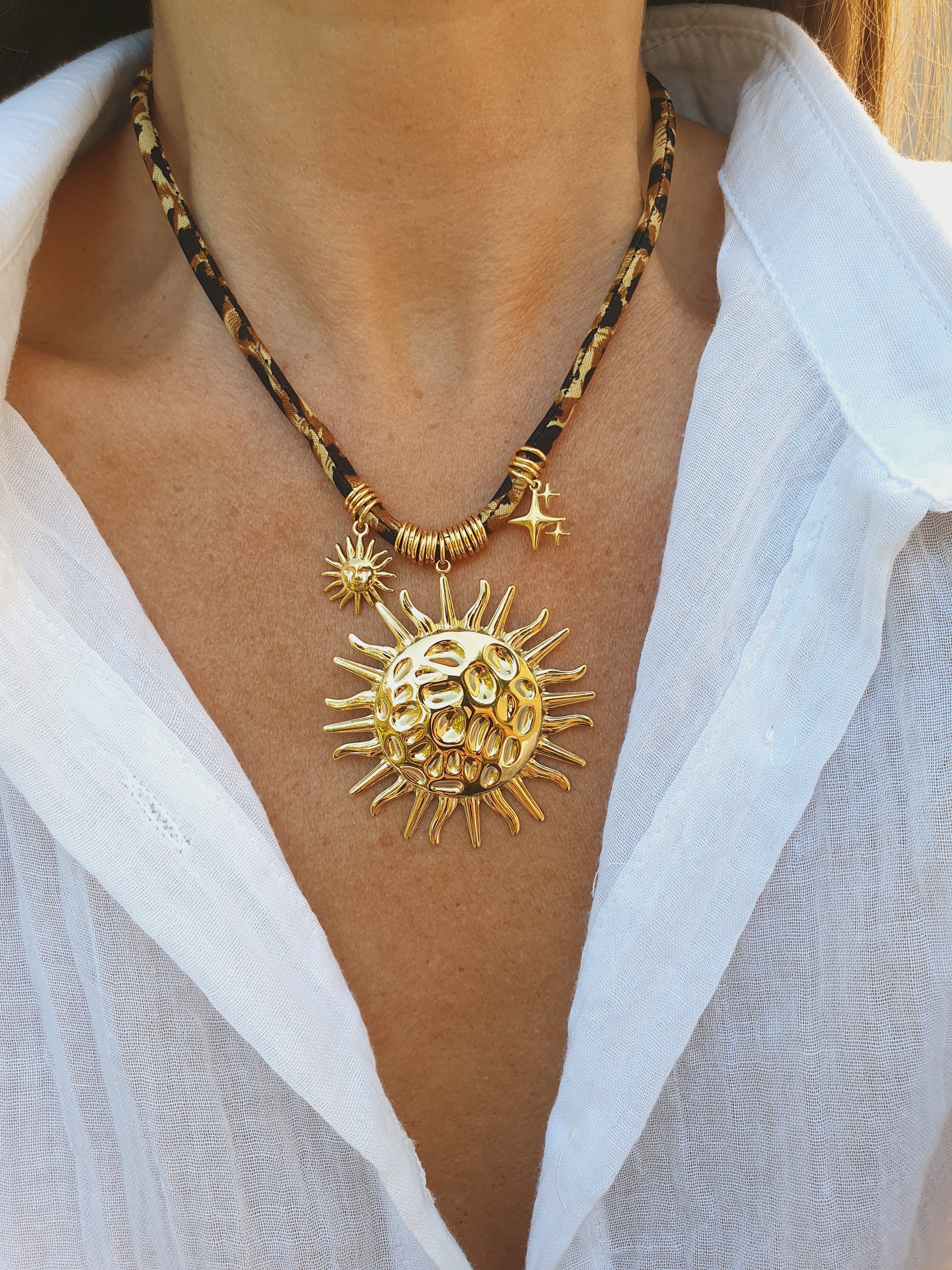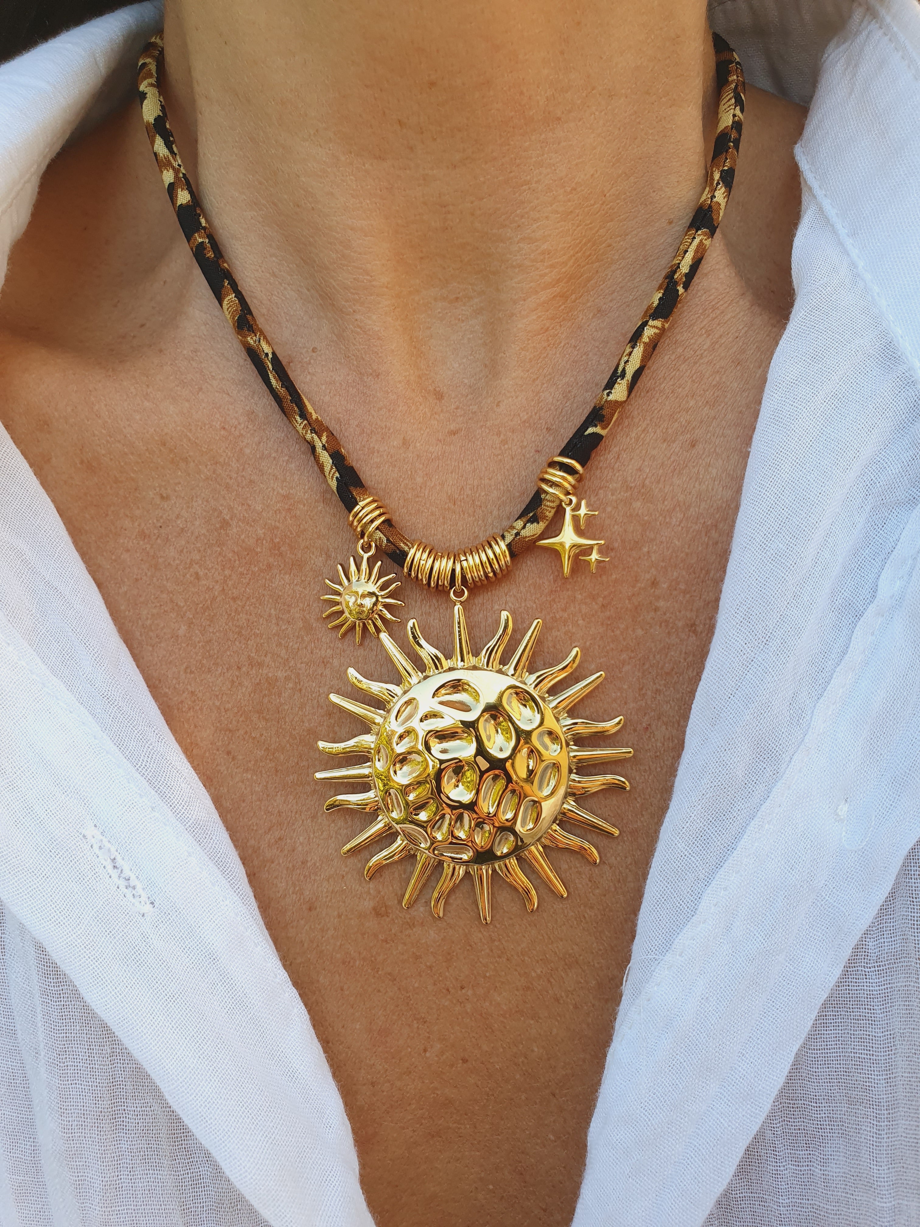 Ces colliers sont composés d’un cordon rigide imprimé Léopard, pensé pour garder sa forme et maintenir les breloques en valeur.