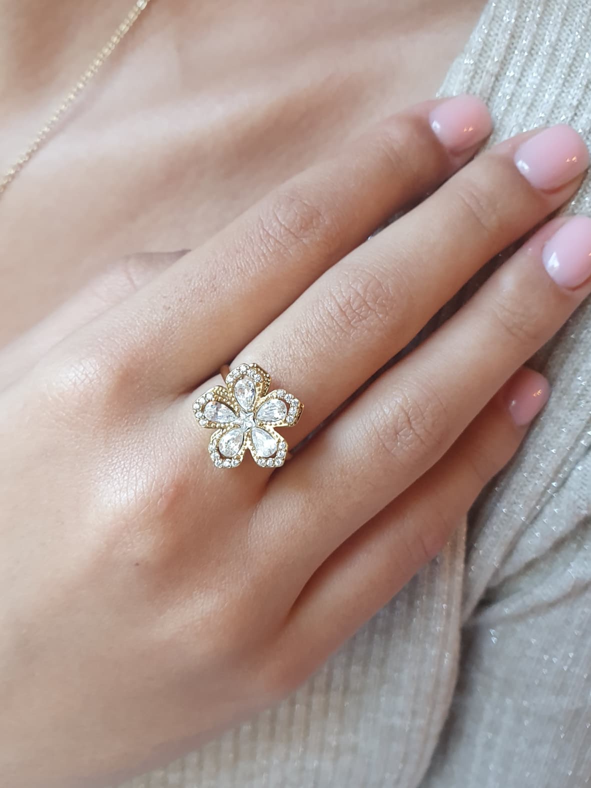 - Design floral élégant : une fleur à cinq pétales serties de pierres brillantes