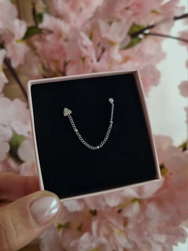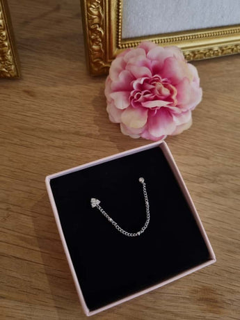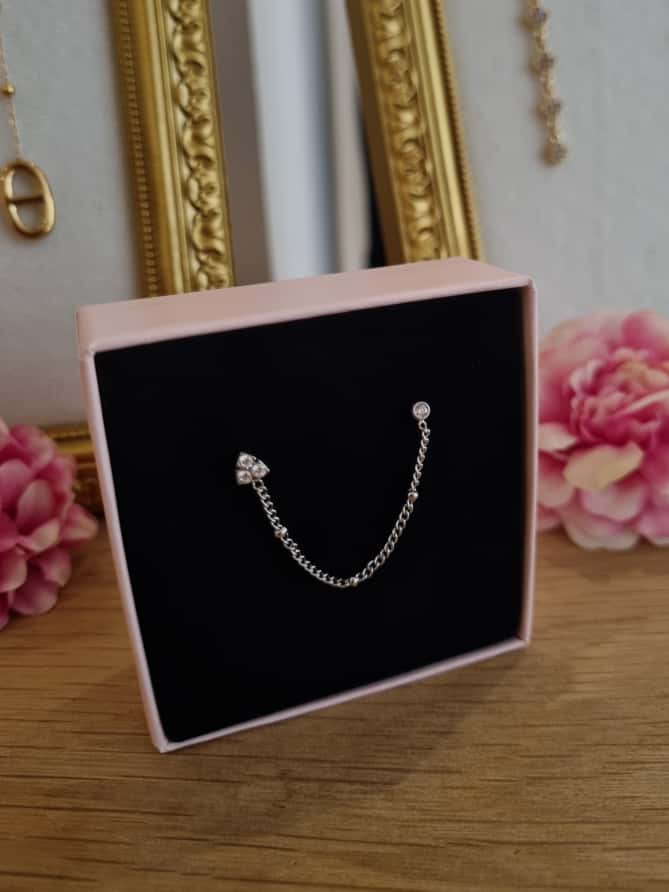 La boucle Mira est une pièce moderne et élégante, pensée pour apporter une touche tendance et minimaliste à votre look. Un trio de zircons blancs éclatants orne le lobe, tandis qu’une fine chaîne argentée vient se fixer sur un second point, créant un effet asymétrique chic et délicat.