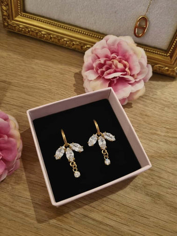 Les boucles Averia combinent plusieurs feuilles de zircons taillés façon marquise, assemblées pour créer un motif délicat et lumineux. Un petit pendentif en zircon complète l’ensemble pour un rendu chic, élégant et très féminin.