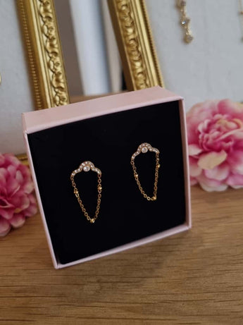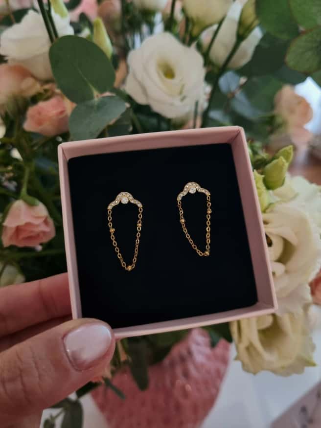 Les boucles Elena sont serties de zircons brillants, associés à une chaîne délicate pour un rendu original et élégant. Ce design en forme d’arche fine encadre subtilement le lobe et apporte un effet moderne tout en restant très doux.