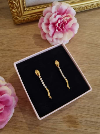Chaque boucle présente une ligne verticale de zircons blancs éclatants, qui se prolonge vers une corne dorée à la silhouette fluide et raffinée.