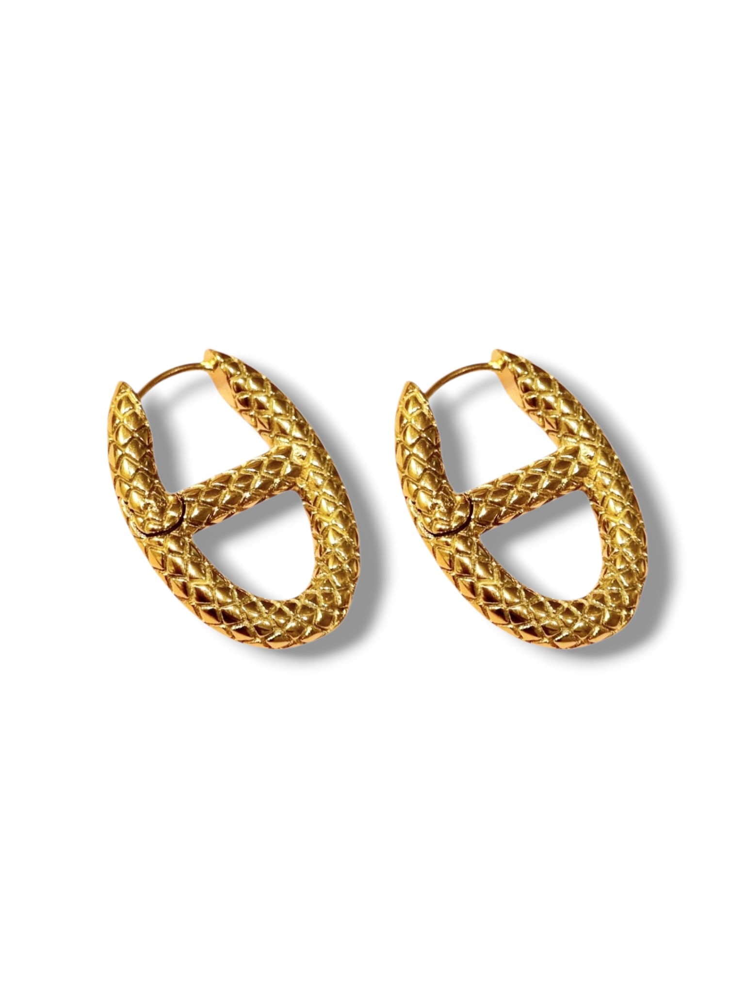 Ces boucles d’oreilles dorées au design tressé s’inspirent de l’élégance des textures serpent. Leur forme sculptée, à la fois originale et intemporelle, capte la lumière et apporte un style affirmé sans jamais être trop chargé.