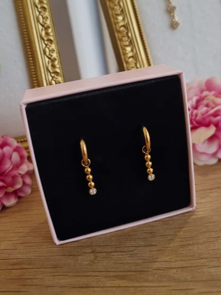 Les boucles d’oreilles Mila allient minimalisme et raffinement : trois petites billes dorées descendent en cascade, terminées par un zircon blanc éclatant.