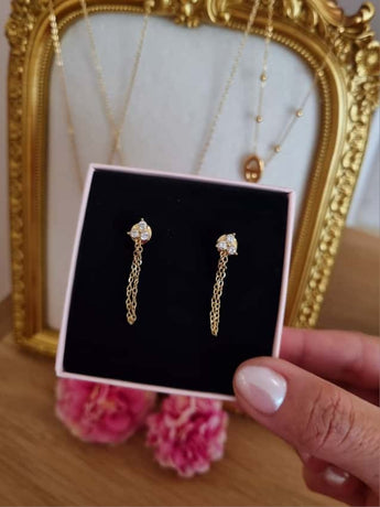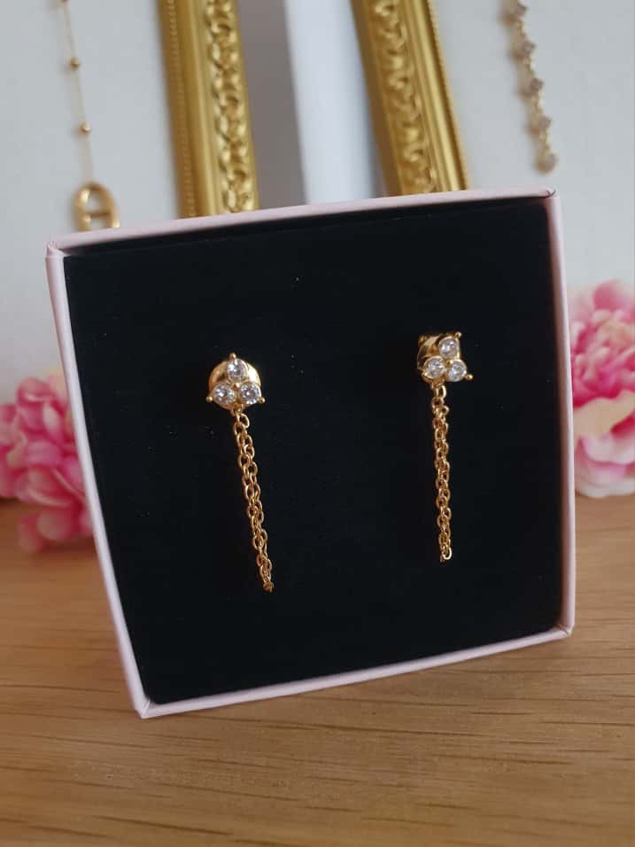 Les boucles d’oreilles Naya dévoilent un trio de zircons blancs étincelants, délicatement montés sur une base dorée d’une finesse remarquable. De là descend une petite chaîne souple qui apporte grâce, légèreté et féminité au bijou.