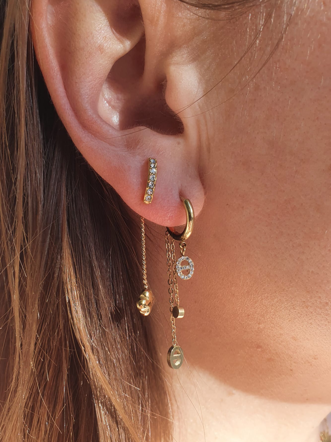 Les boucles pendantes maille marine et zircons associent subtilement modernité et finesse : une créole dorée légère, deux petites breloques maille marine dont une sertie de zircons, et un zircon blanc qui scintillent délicatement.