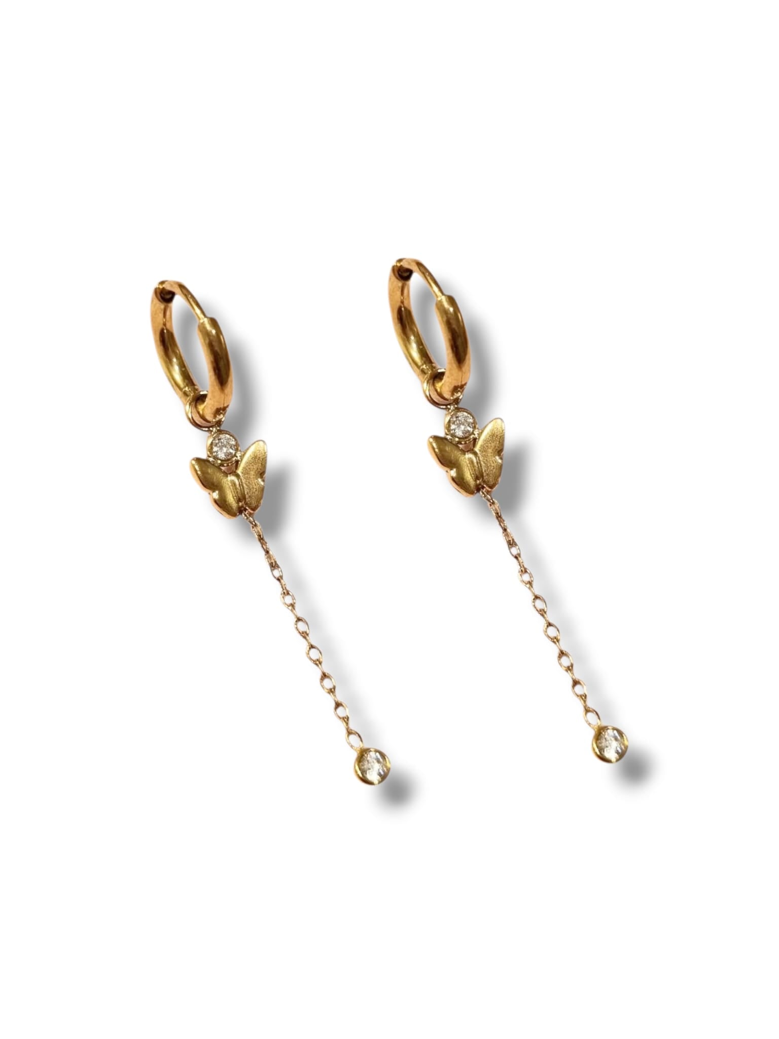 Ces boucles d’oreilles en acier inoxydable se distinguent par leur petit papillon doré orné d’un zircon blanc. La chaîne délicate crée un mouvement élégant et aérien, apportant une touche féminine et raffinée.