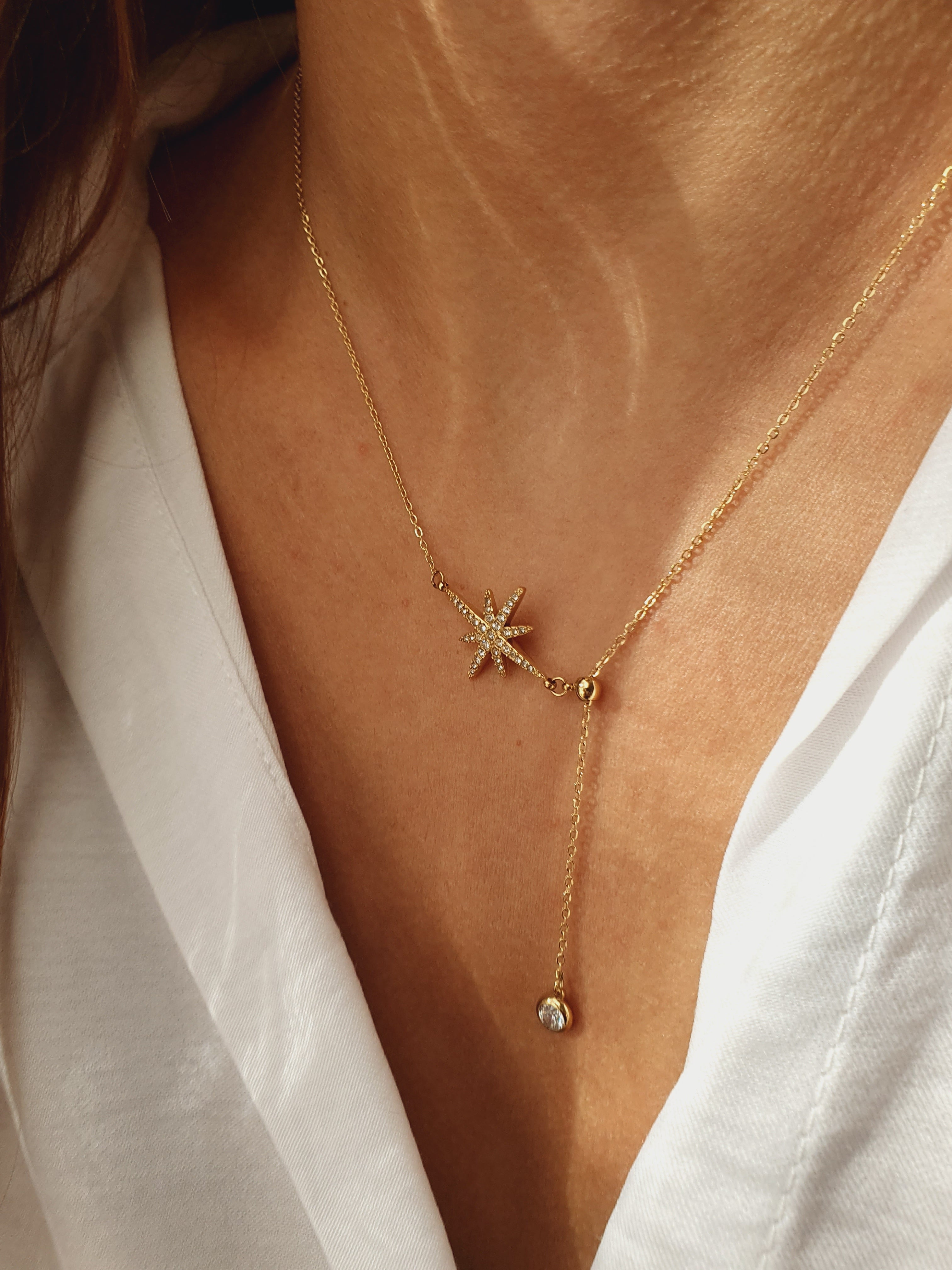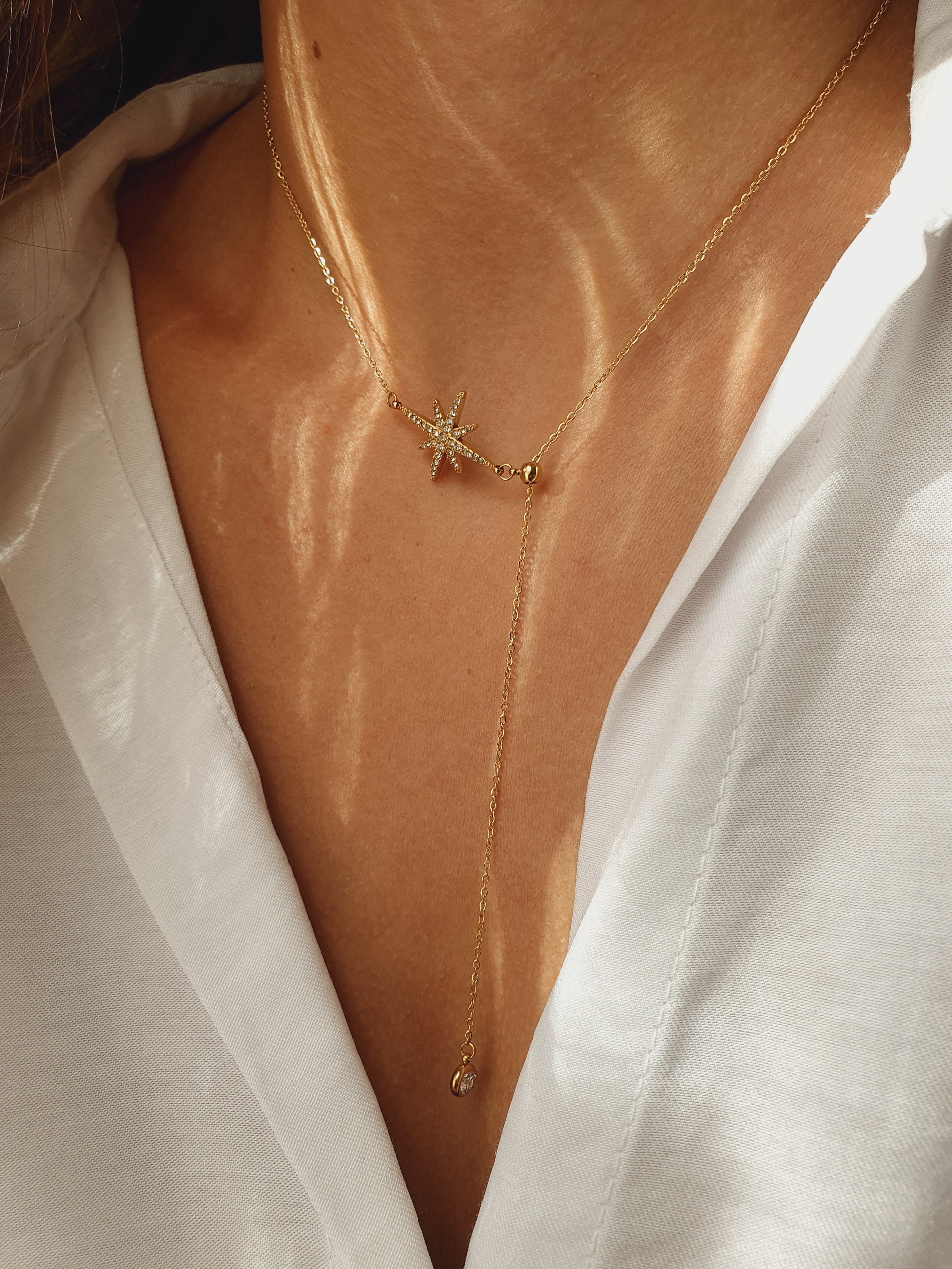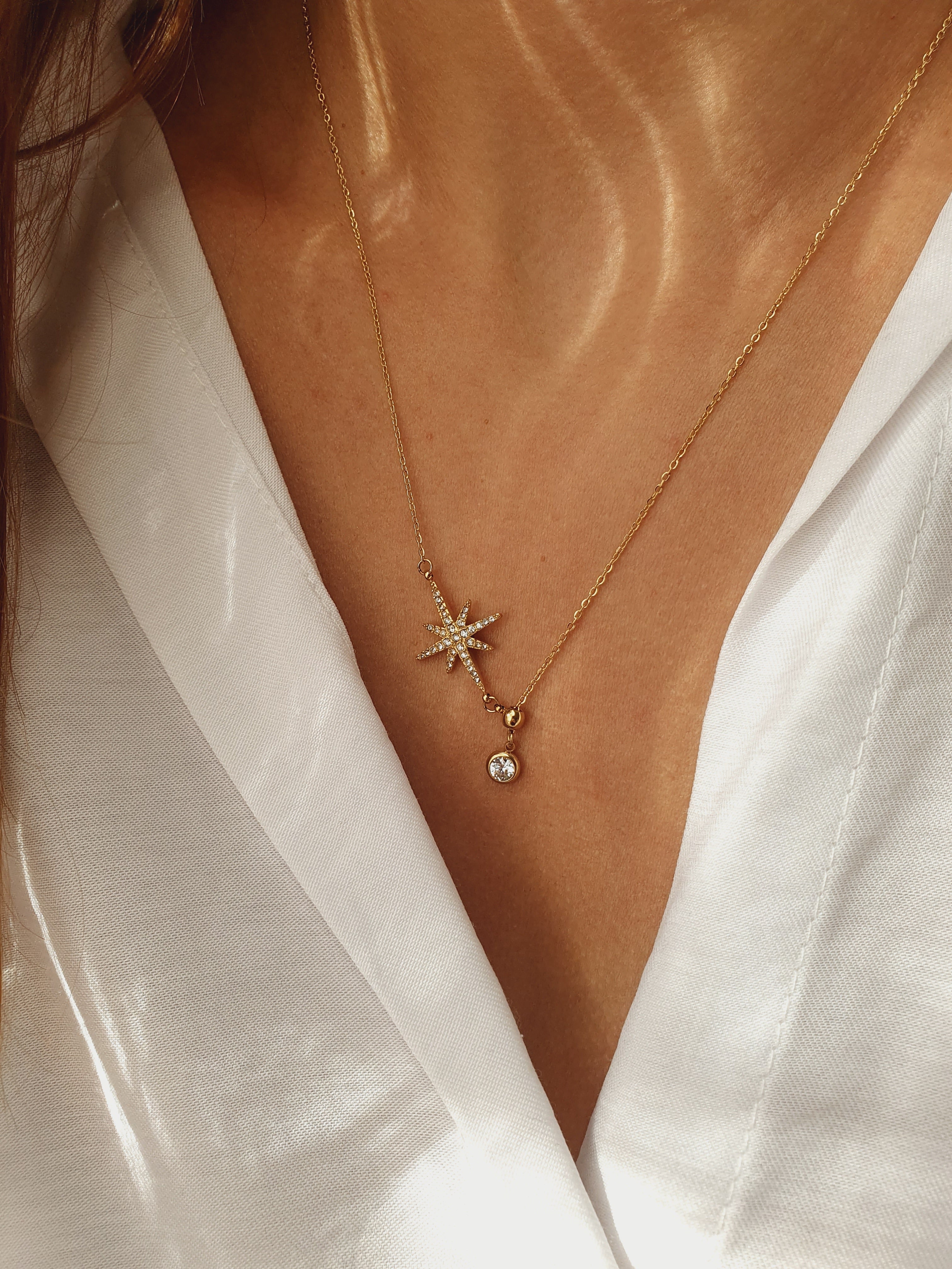 Son pendentif en forme d’étoile scintillante pavée de zircons, accompagné d’un cristal lumineux suspendu, capte la lumière et attire les regards. L’éclat doré de l’acier inoxydable, waterproof, hypoallergénique, qui ne rouille pas et ne change pas de couleur, garantit durabilité et élégance au quotidien.