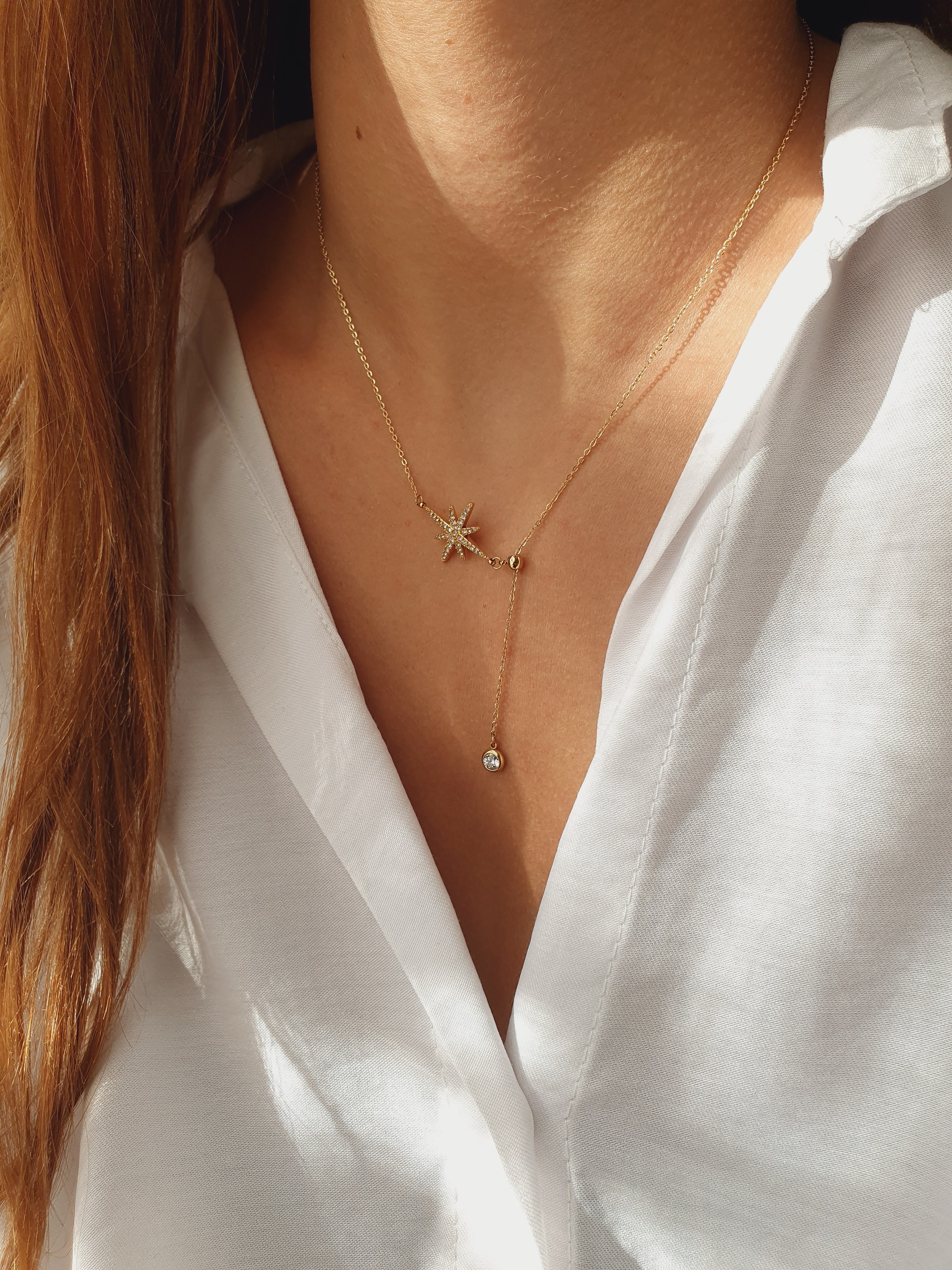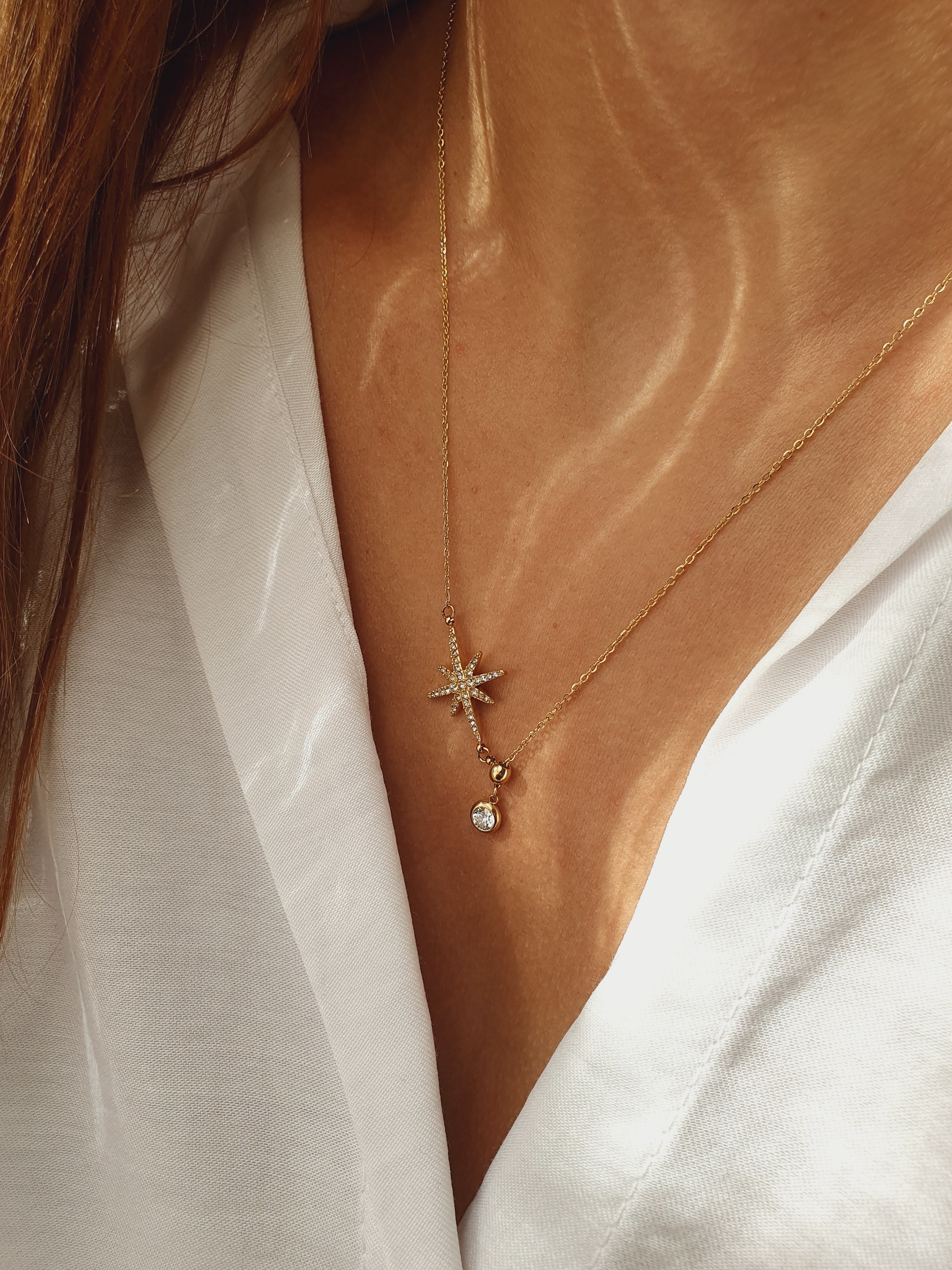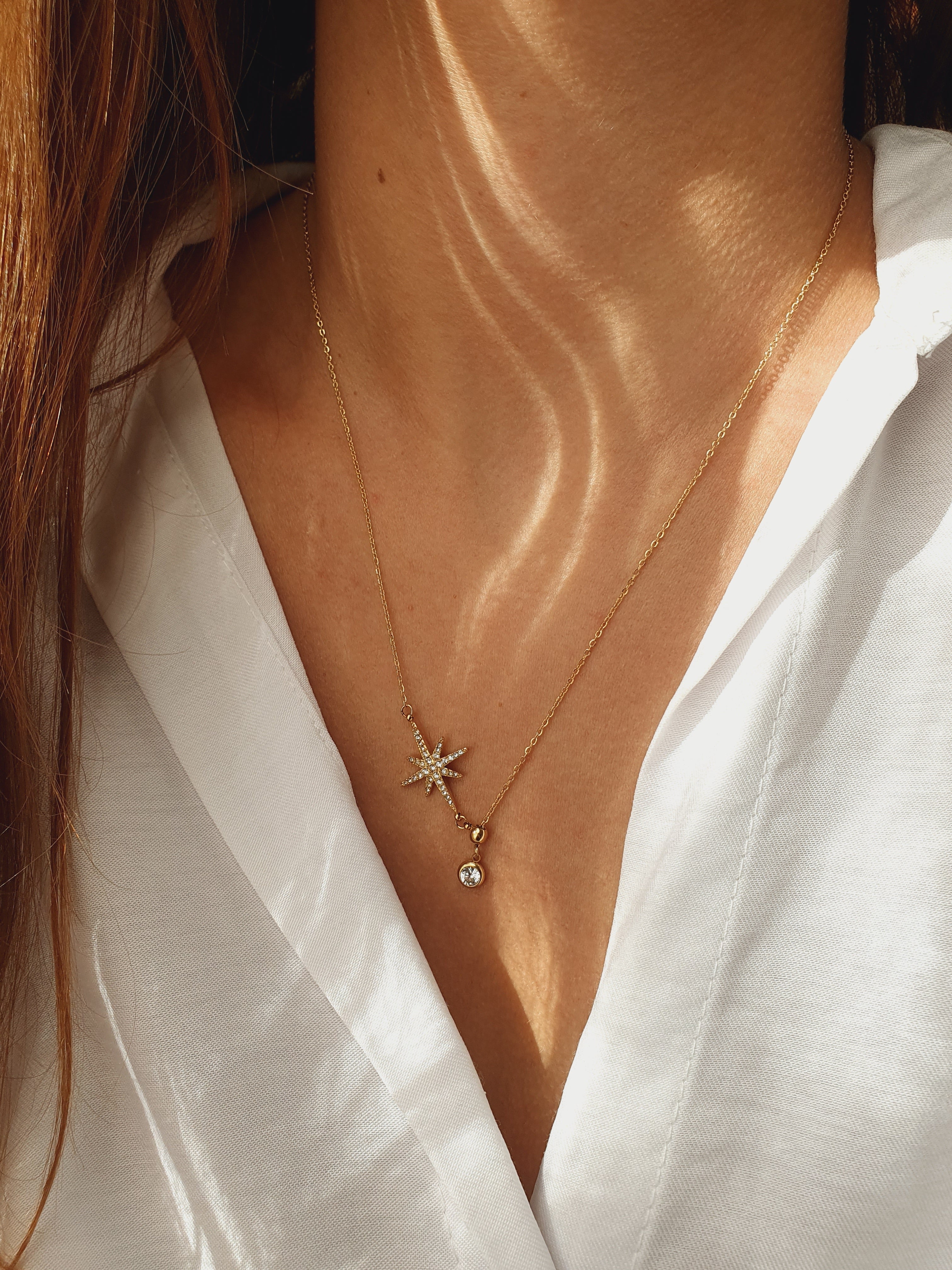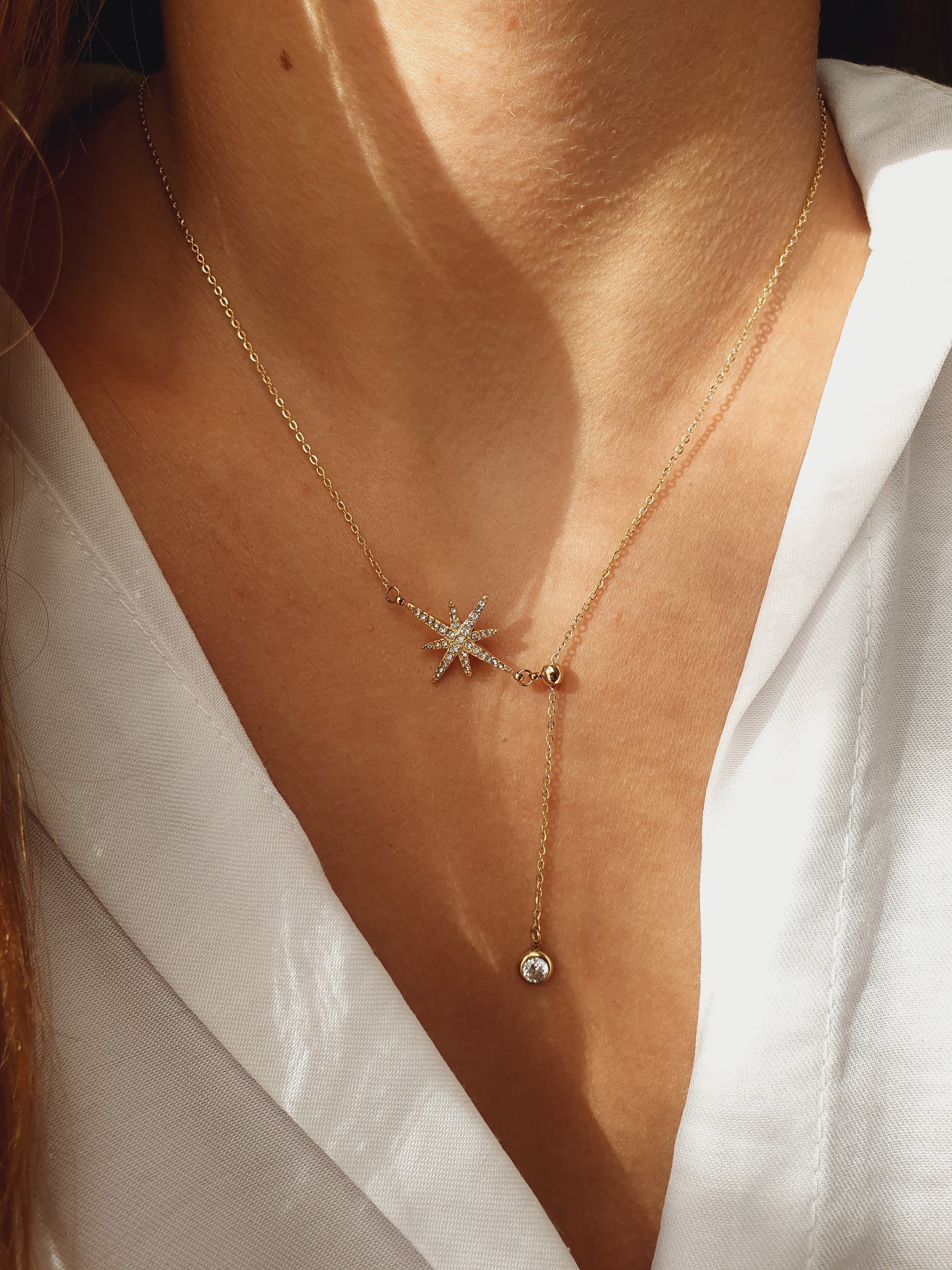 Son pendentif en forme d’étoile scintillante pavée de zircons, accompagné d’un cristal lumineux suspendu, capte la lumière et attire les regards. L’éclat doré de l’acier inoxydable, waterproof, hypoallergénique, qui ne rouille pas et ne change pas de couleur, garantit durabilité et élégance au quotidien.