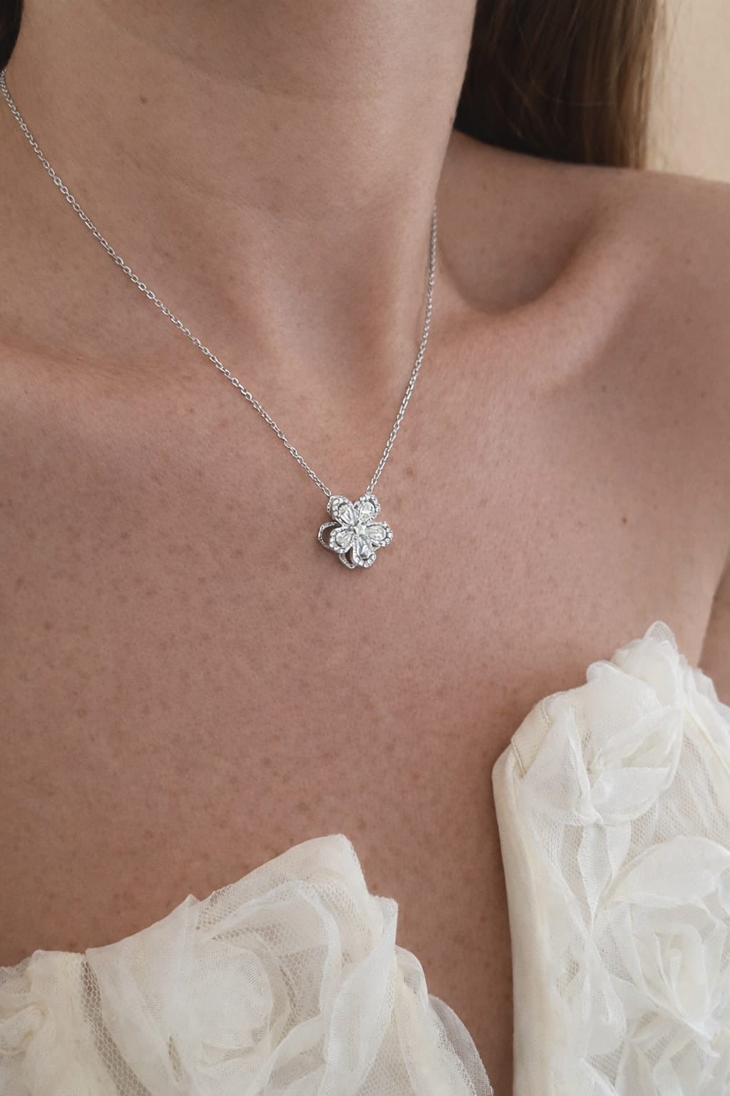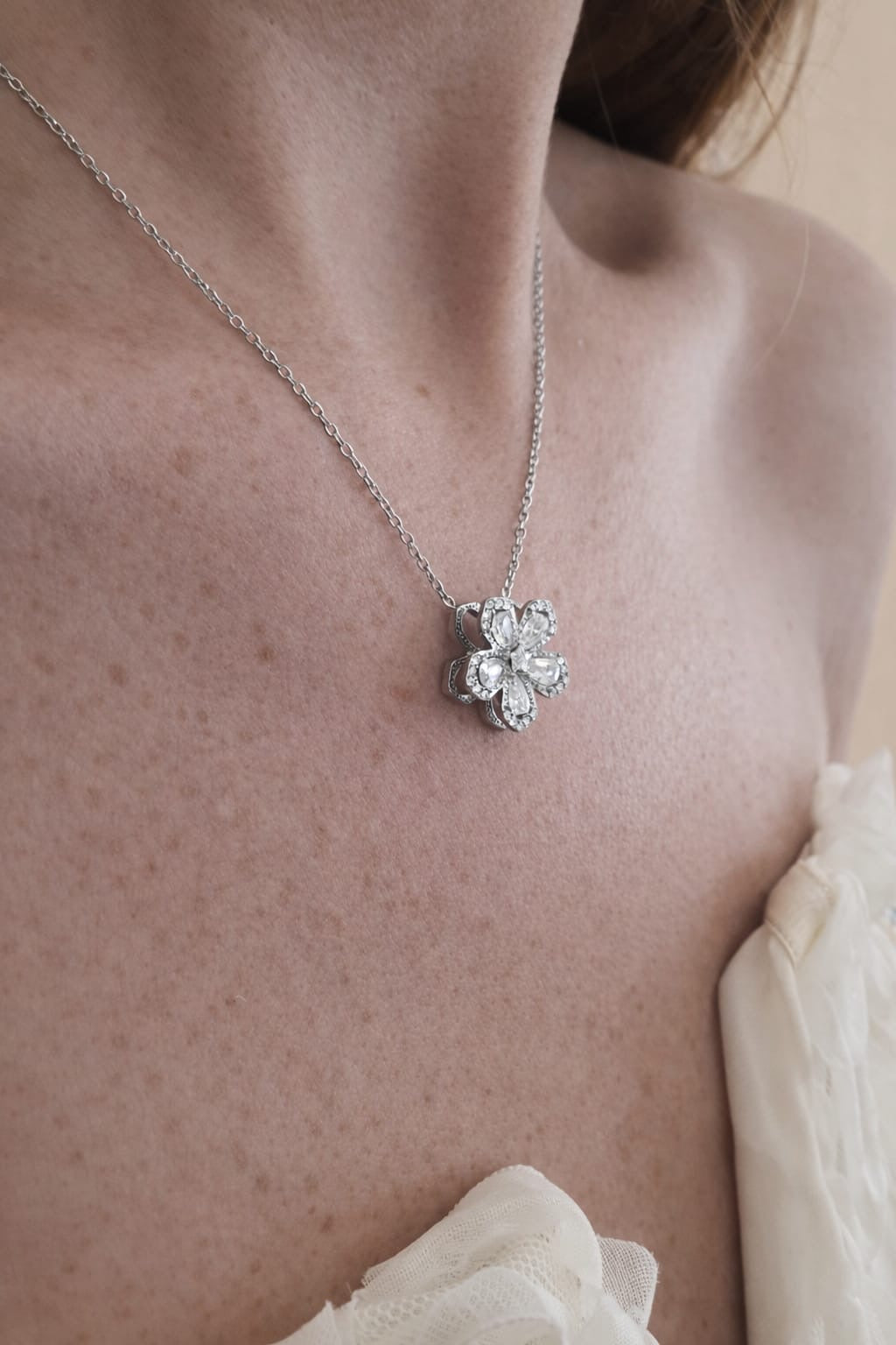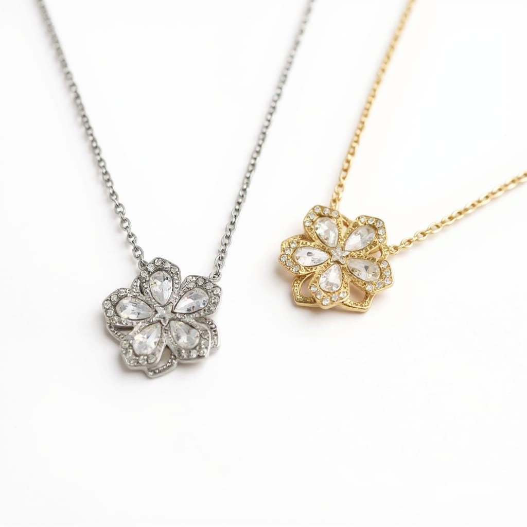 - Design floral élégant : une fleur à quatre pétales sertis de pierres brillantes