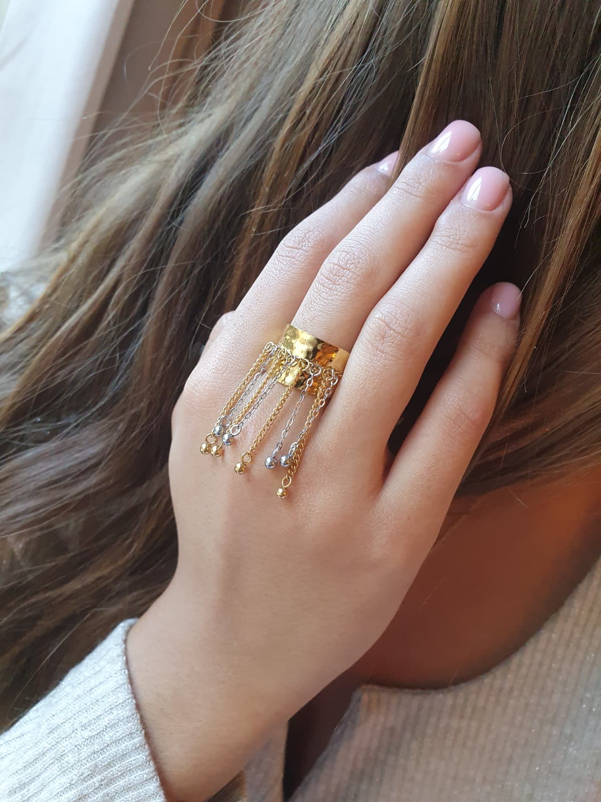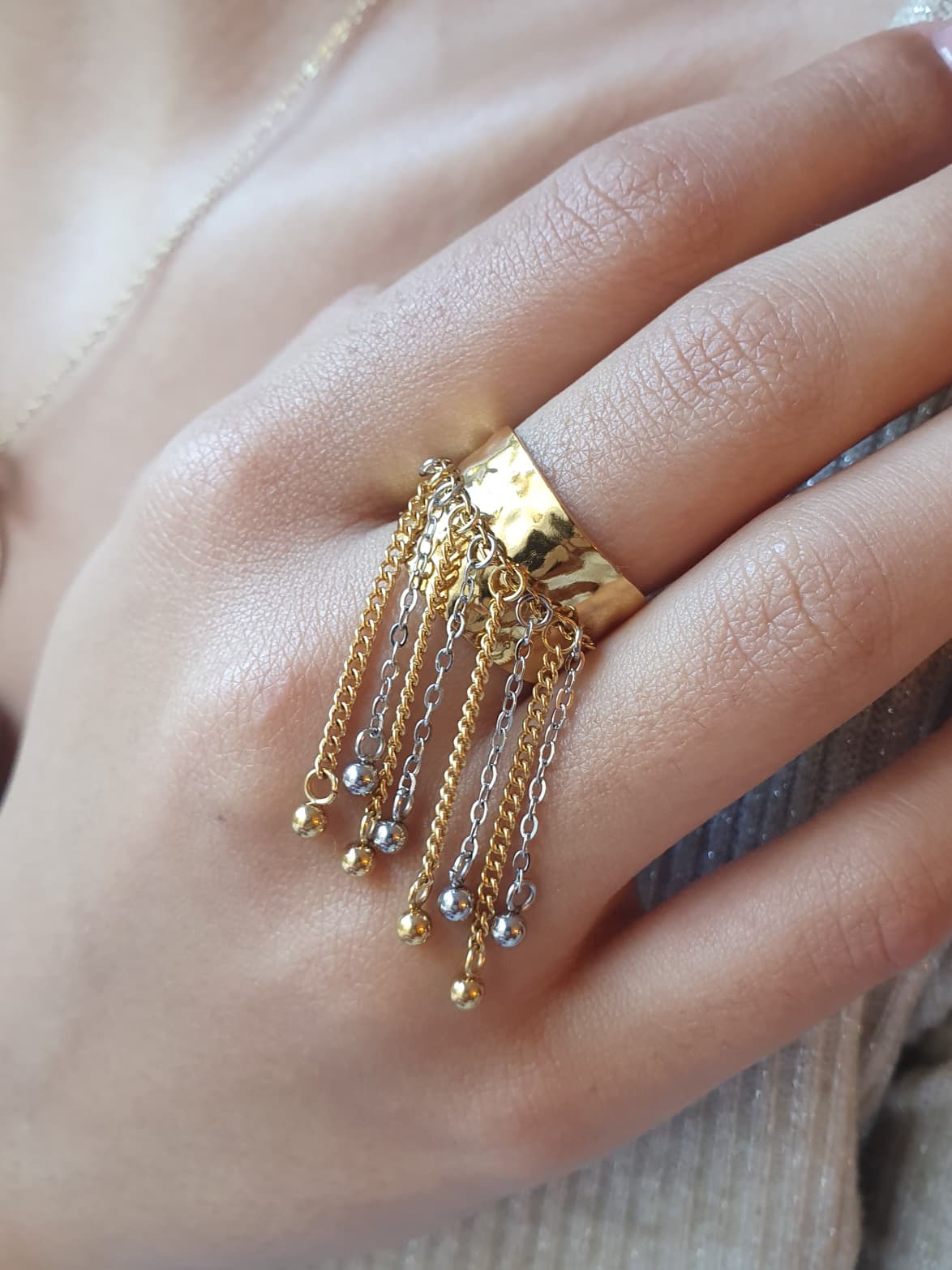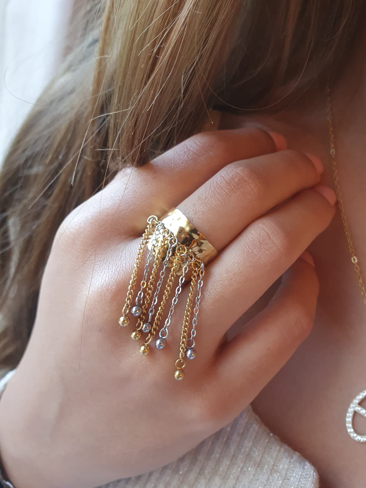 La Bague Cascade Étoilée se distingue par son design spectaculaire : un anneau doré martelé d’où s’échappent de fines chaînes en mélange doré et argenté, ponctuées de petites billes scintillantes. Ce contraste bicolore, résolument tendance, crée un jeu de lumière raffiné et moderne.
