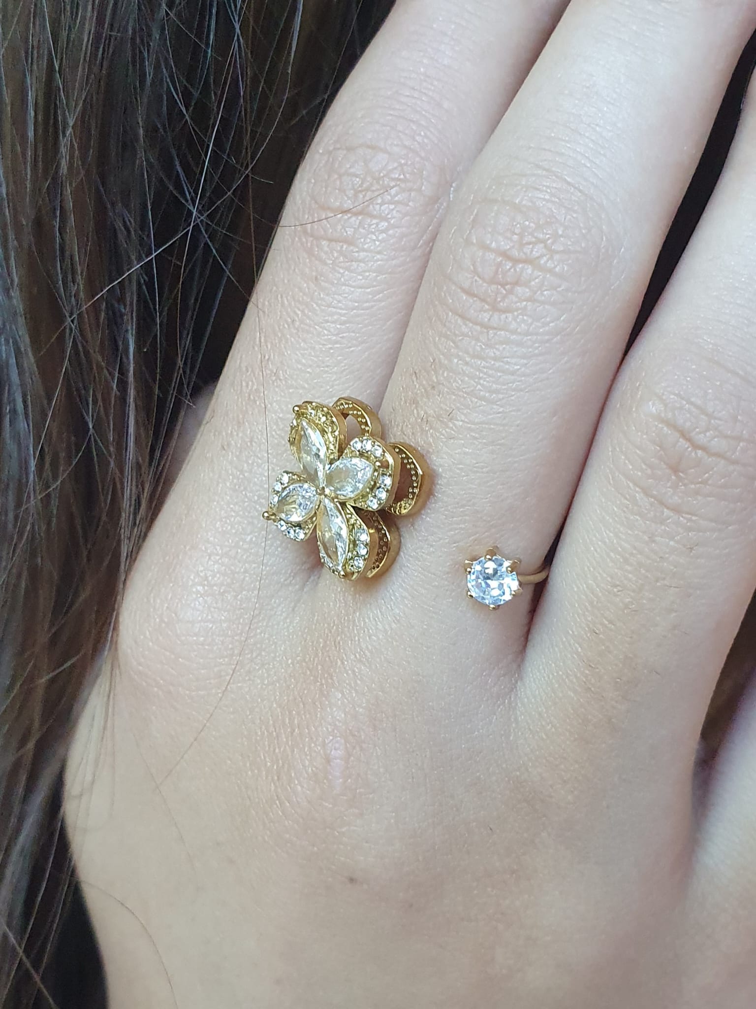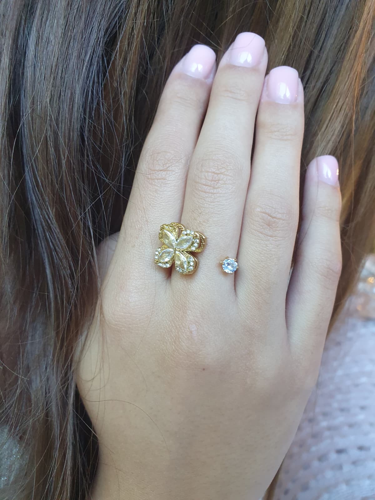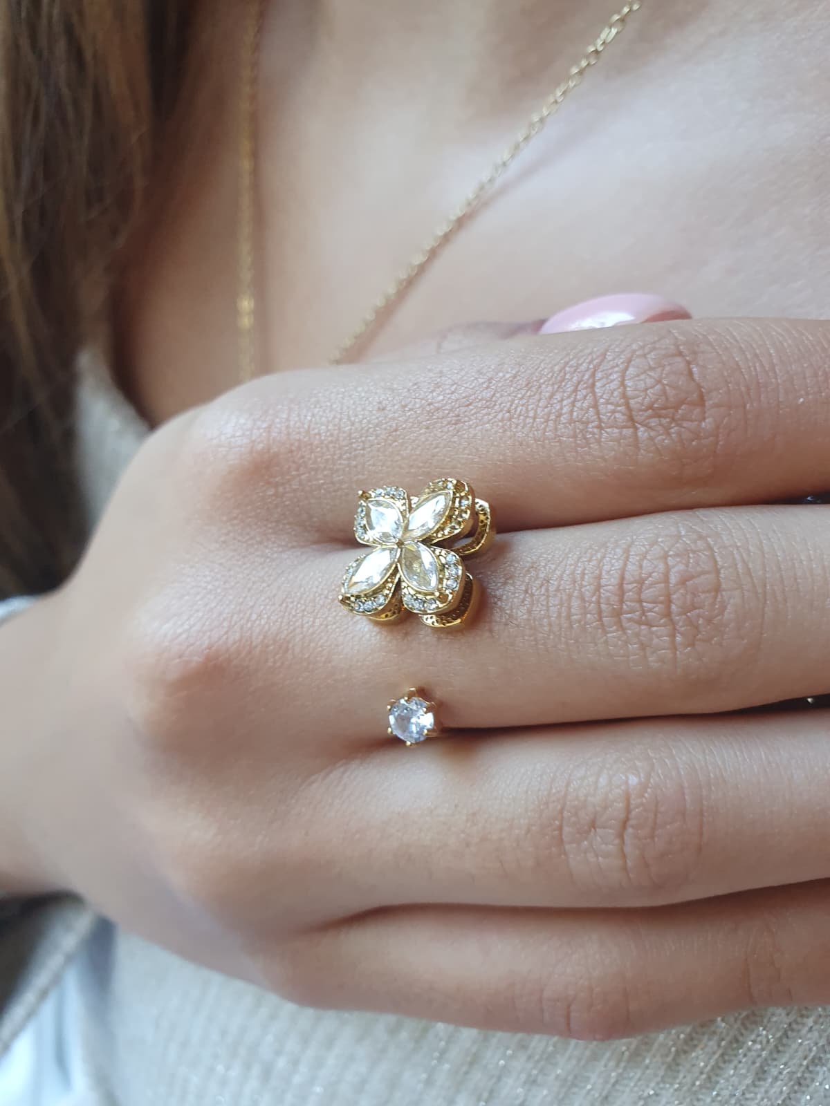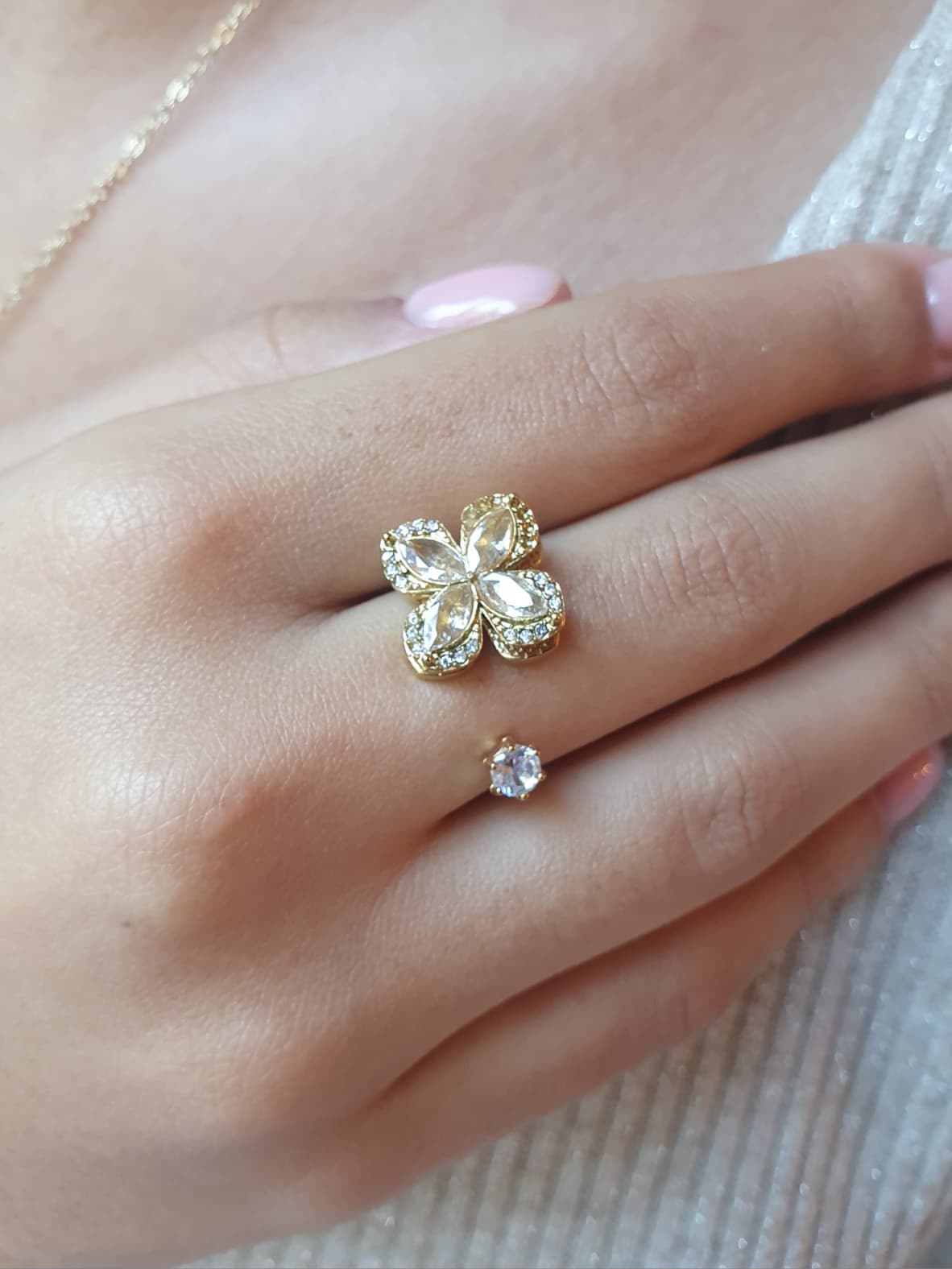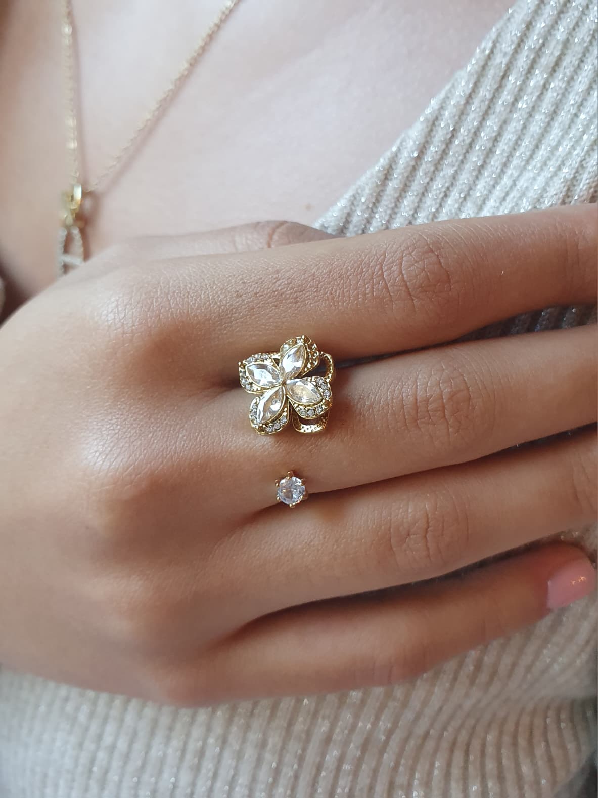 La Bague Floréa associe élégance et sérénité dans un design singulier. Sa structure de double bague ouverte surprend par son originalité, tandis que sa fleur dorée, délicatement ornée de zircons sertis, brille d’un éclat raffiné.