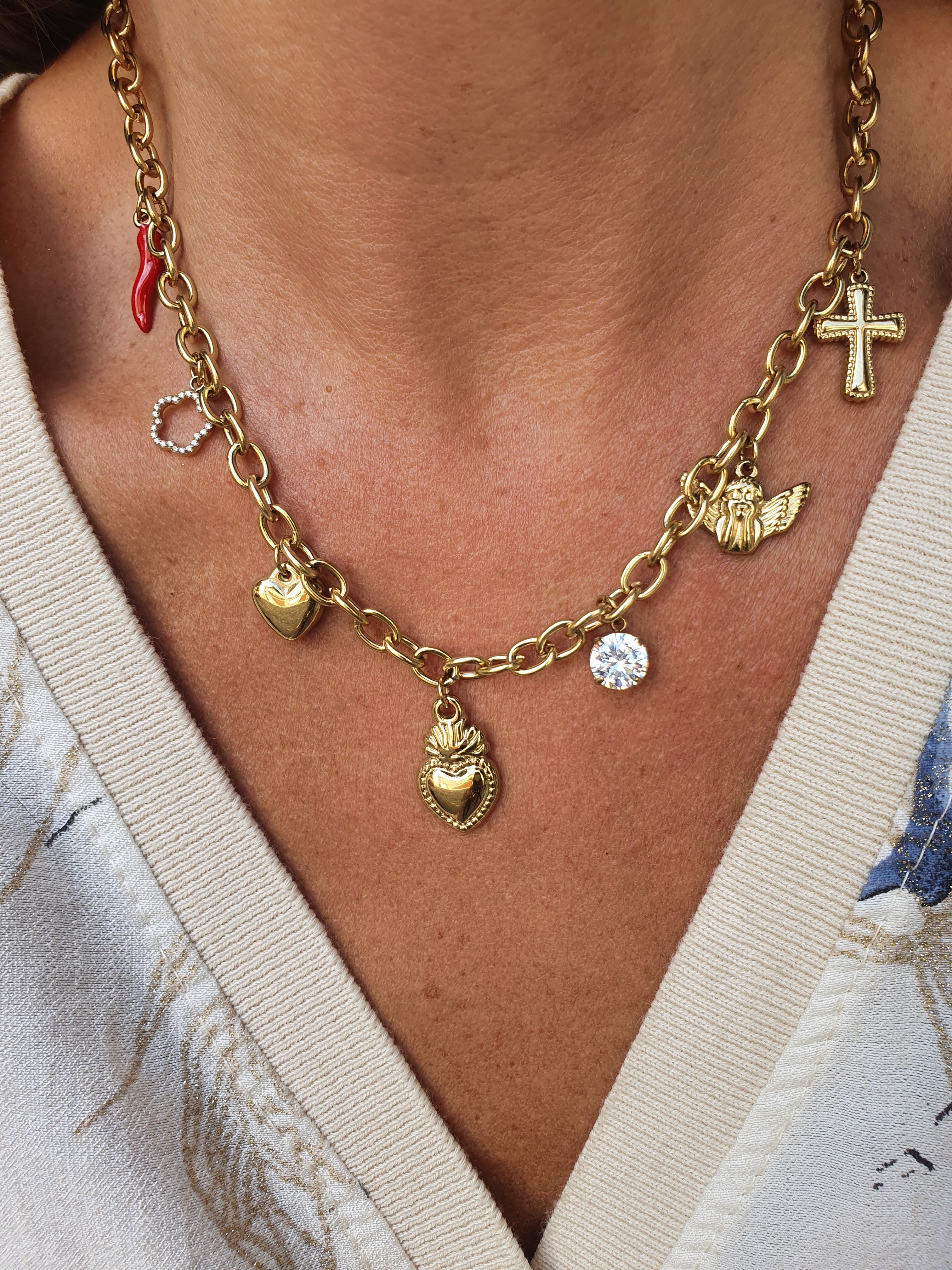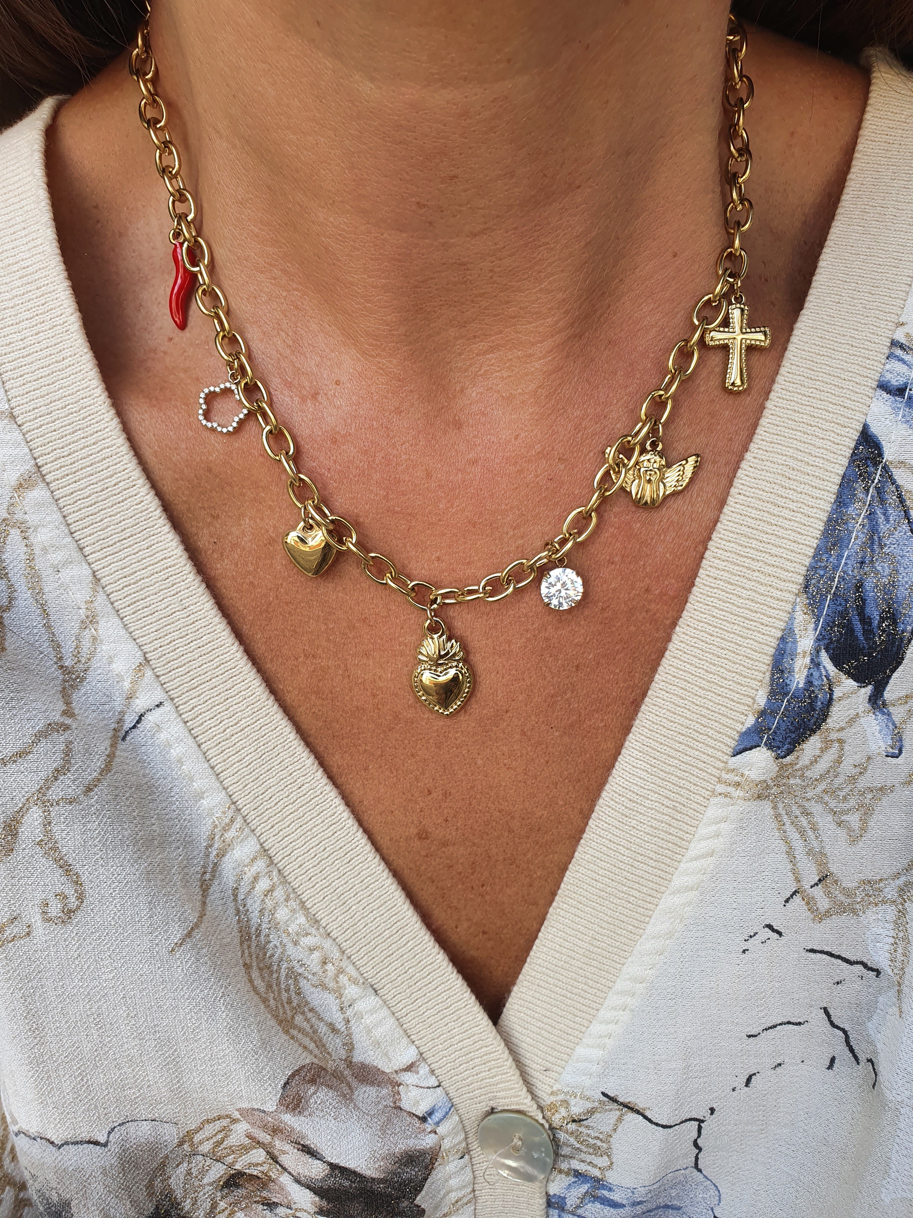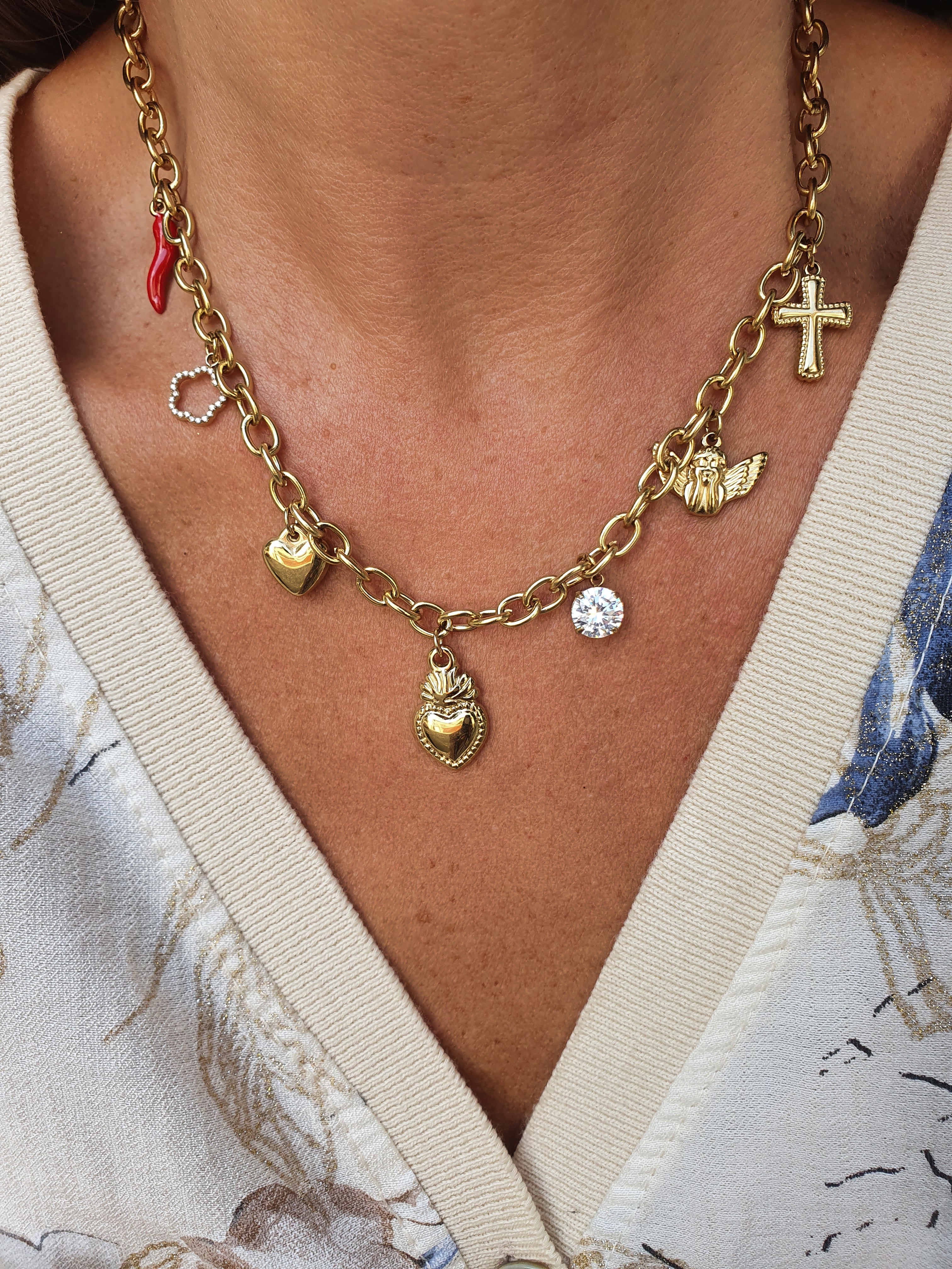 Un collier chargé de symboles, pensé comme un porte-bonheur à porter au quotidien. Sa chaîne en acier inoxydable accueille des breloques iconiques en acier inoxydable également. Un mélange de spiritualité et de style, pour celles qui aiment les bijoux qui racontent une histoire et veillent sur elles.