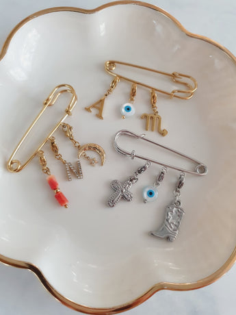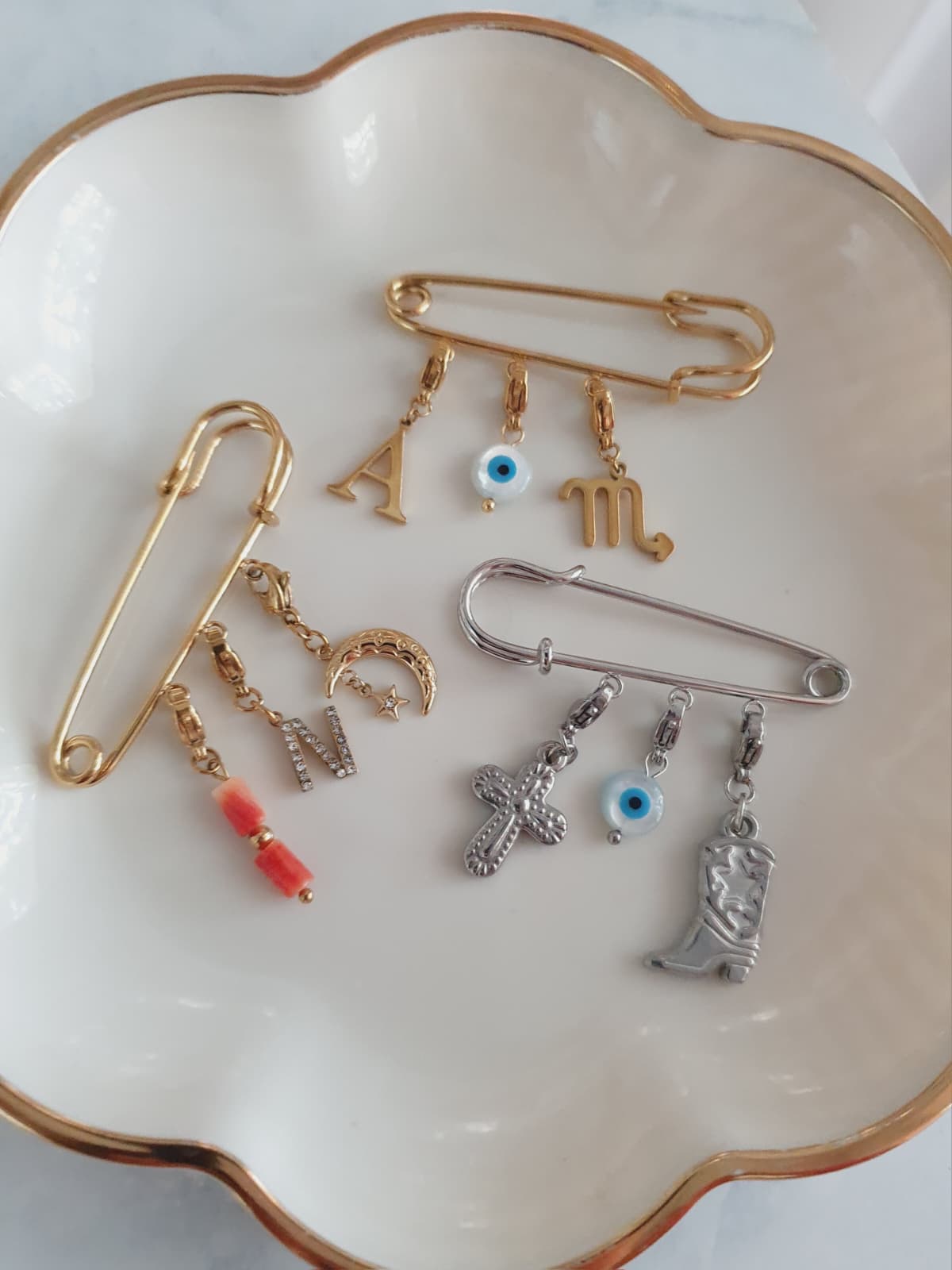 Chaque détail raconte une histoire : une lettre scintillante, une pierre naturelle, un symbole céleste… La broche devient ainsi une pièce unique, qui peut évoluer au fil du temps en changeant ou ajoutant des charms.