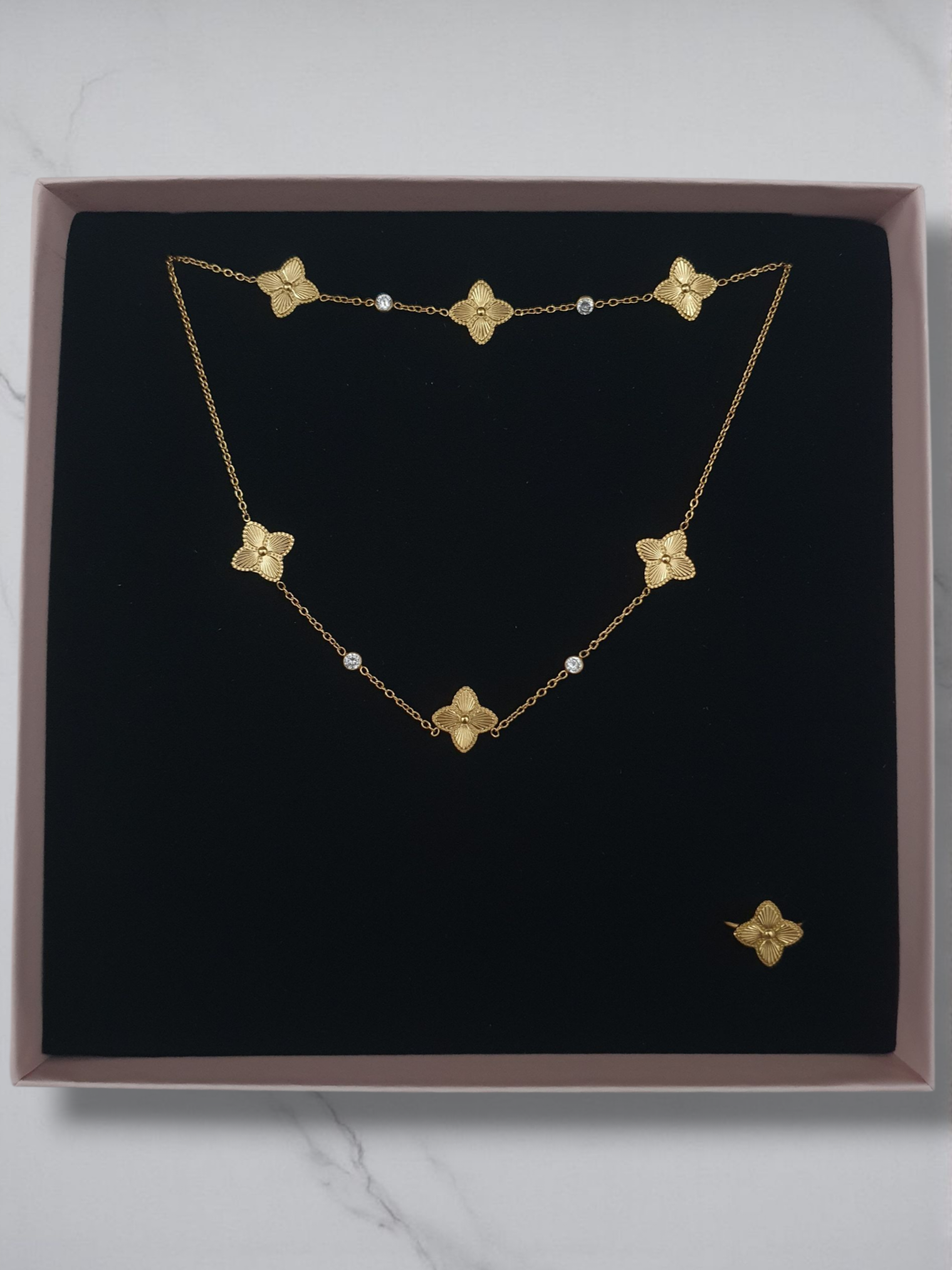 • Parure 3 pièces composée d’un collier, d’un bracelet et d’une bague ajustable assortie
