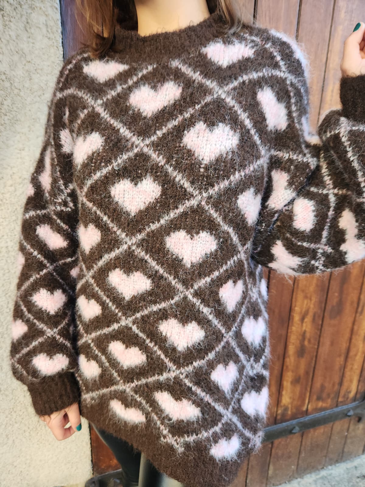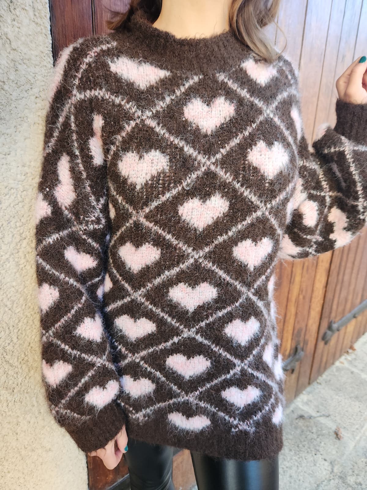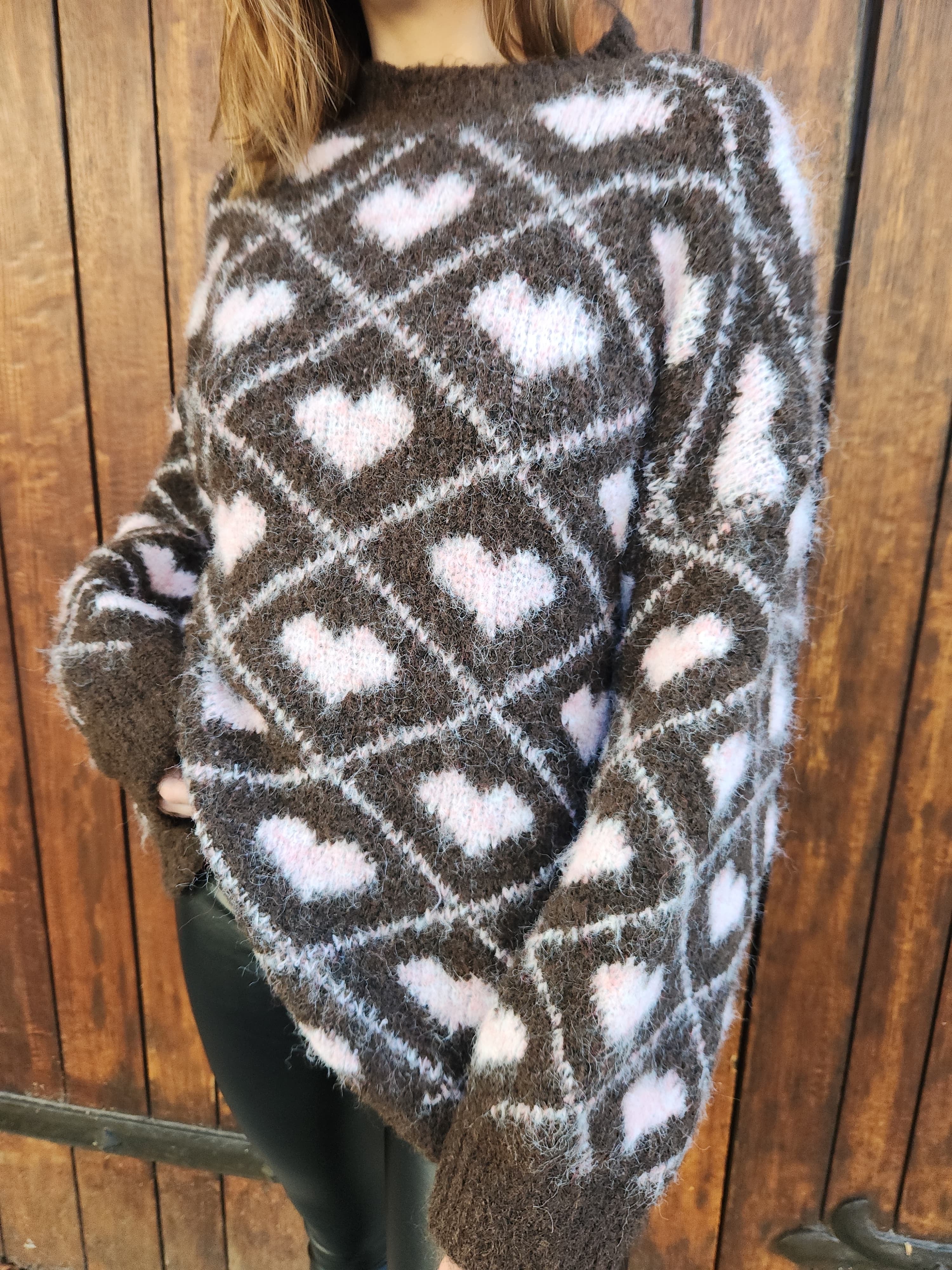 Pull en alpaga marron cœurs roses