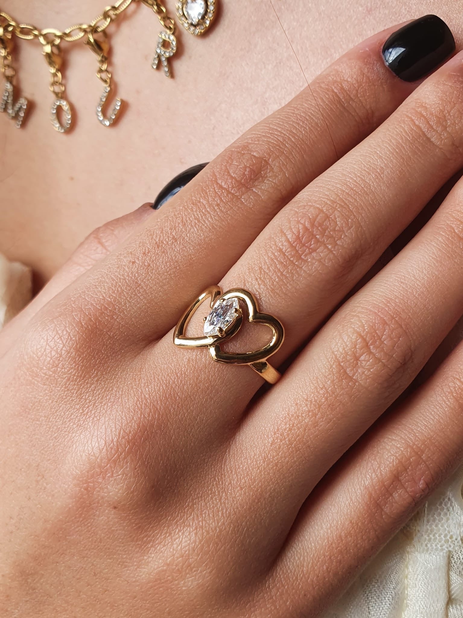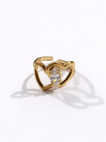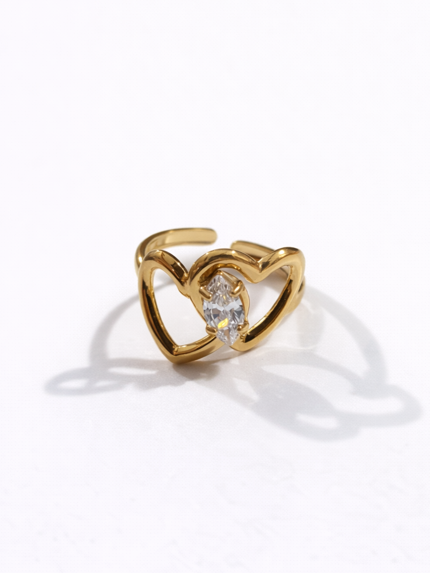• Bague fine avec deux cœurs entrelacés et un zircon central.