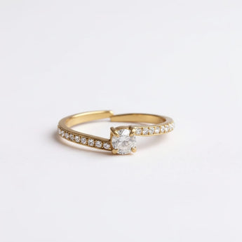 • Bague ajustable au design fin et élégant, composée d’un anneau délicatement pavé de zircons blancs, surmonté d’un zircon central rond serti de griffes, apportant un volume équilibré et un style intemporel