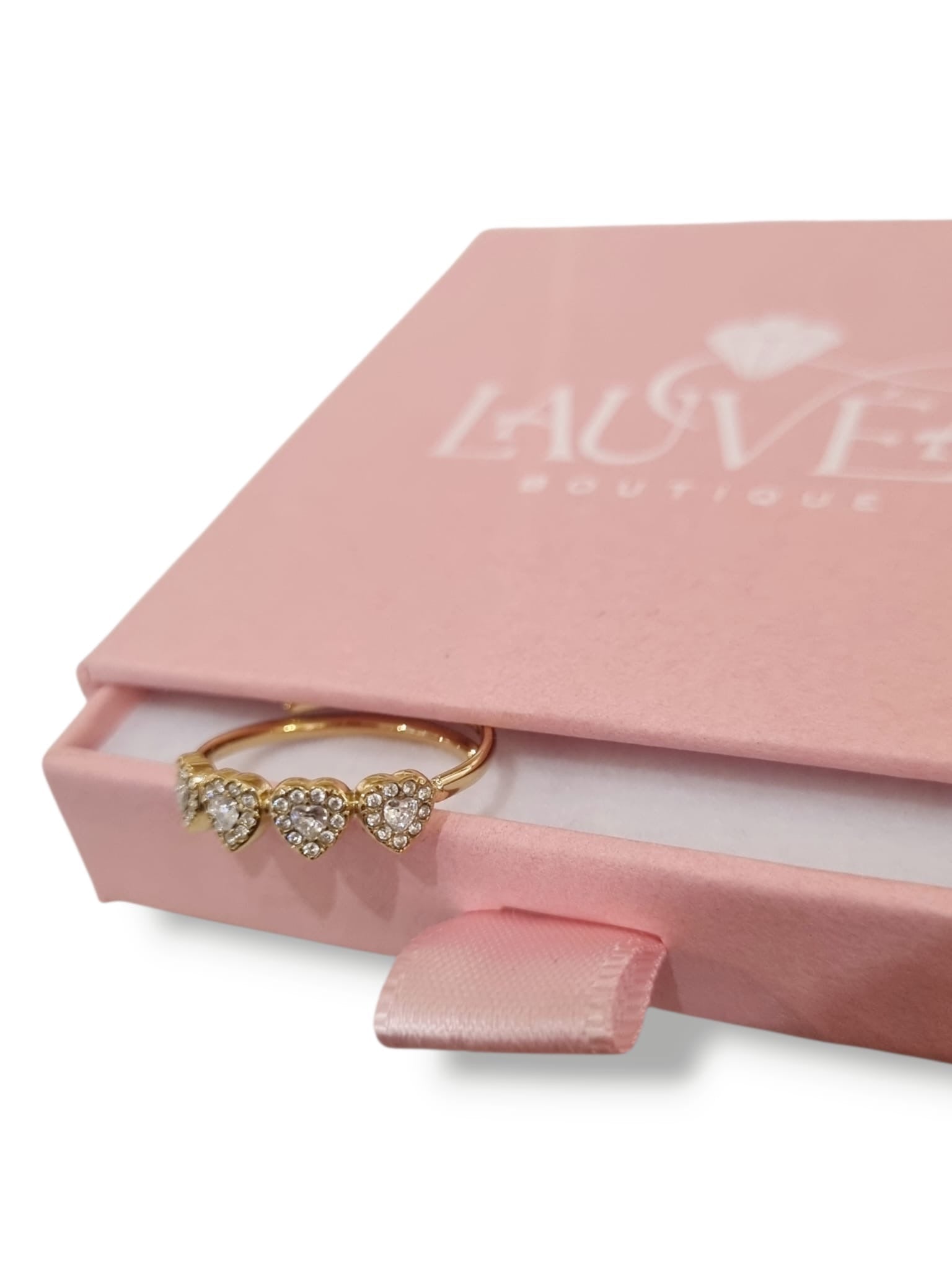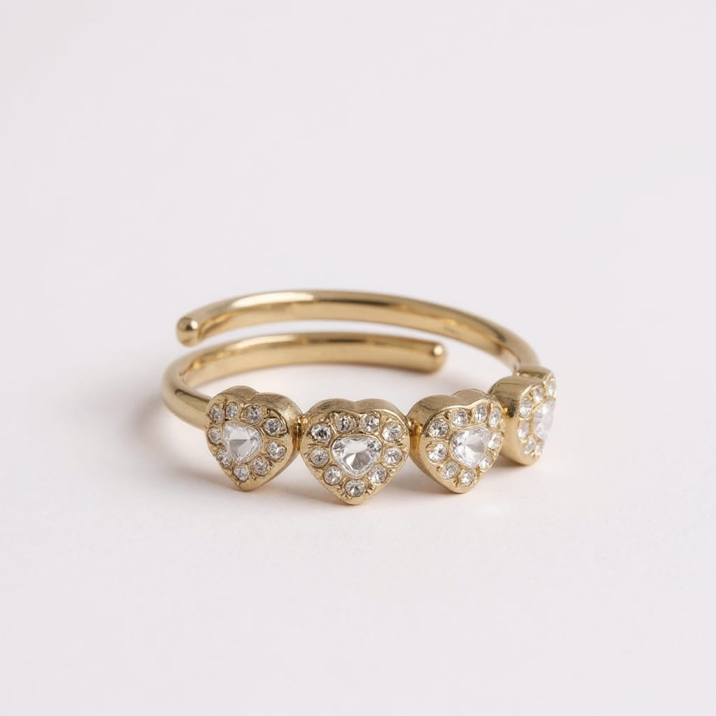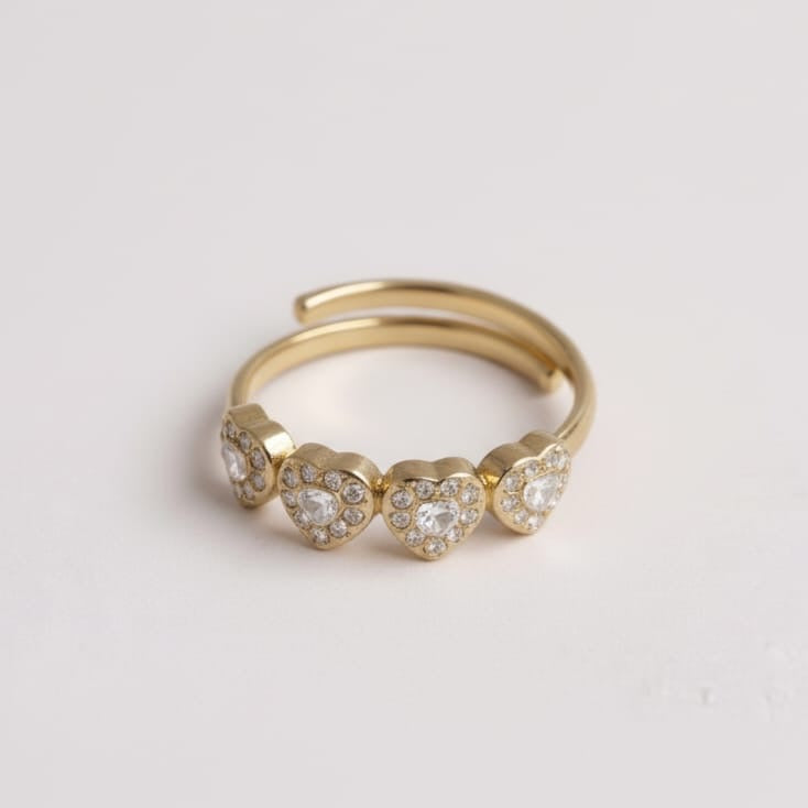 • Bague ajustable au design iconique et romantique, composée de quatre motifs cœur alignés, chacun serti d’un zircon central entouré de petits zircons blancs, offrant un volume harmonieux et un style affirmé