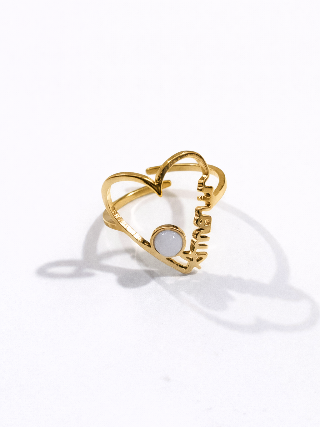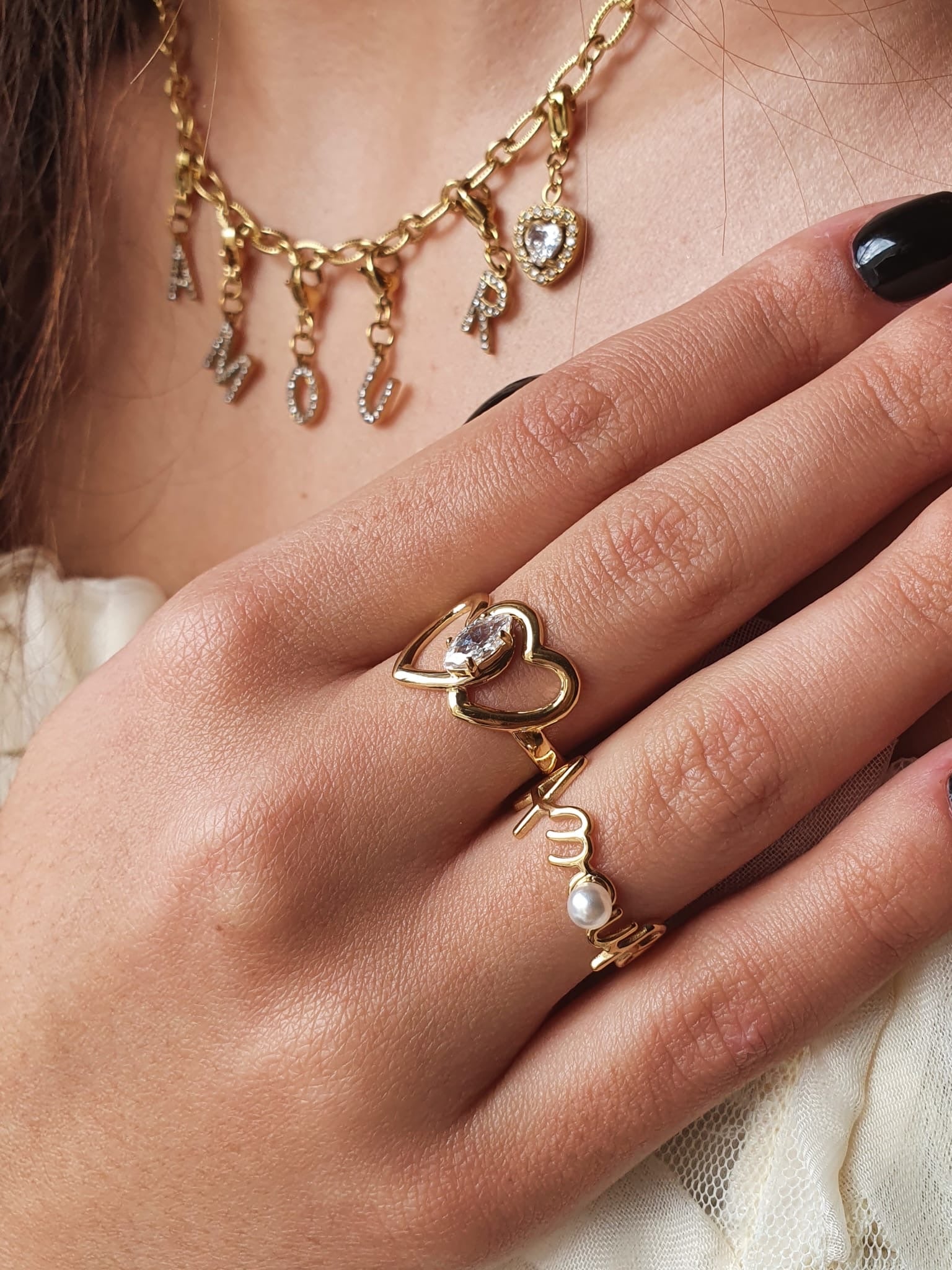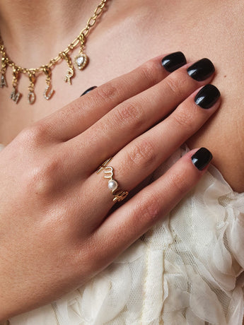 • Bague représentant le mot « amour », avec une perle blanche positionnée au centre de la lettre « O », apportant une touche douce et originale au bijou