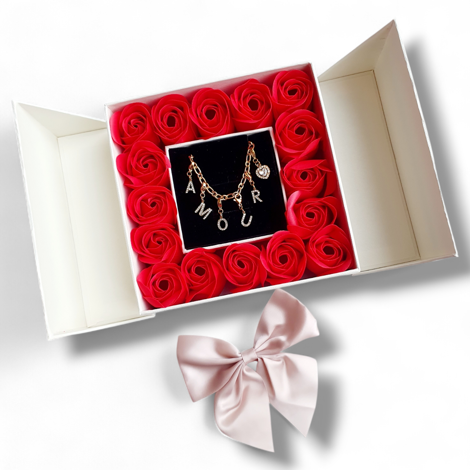 La box se compose d’une boîte aimantée qui se ferme délicatement grâce à un nœud rose poudré, fixé avec un aimant à la boîte pour une finition raffinée.