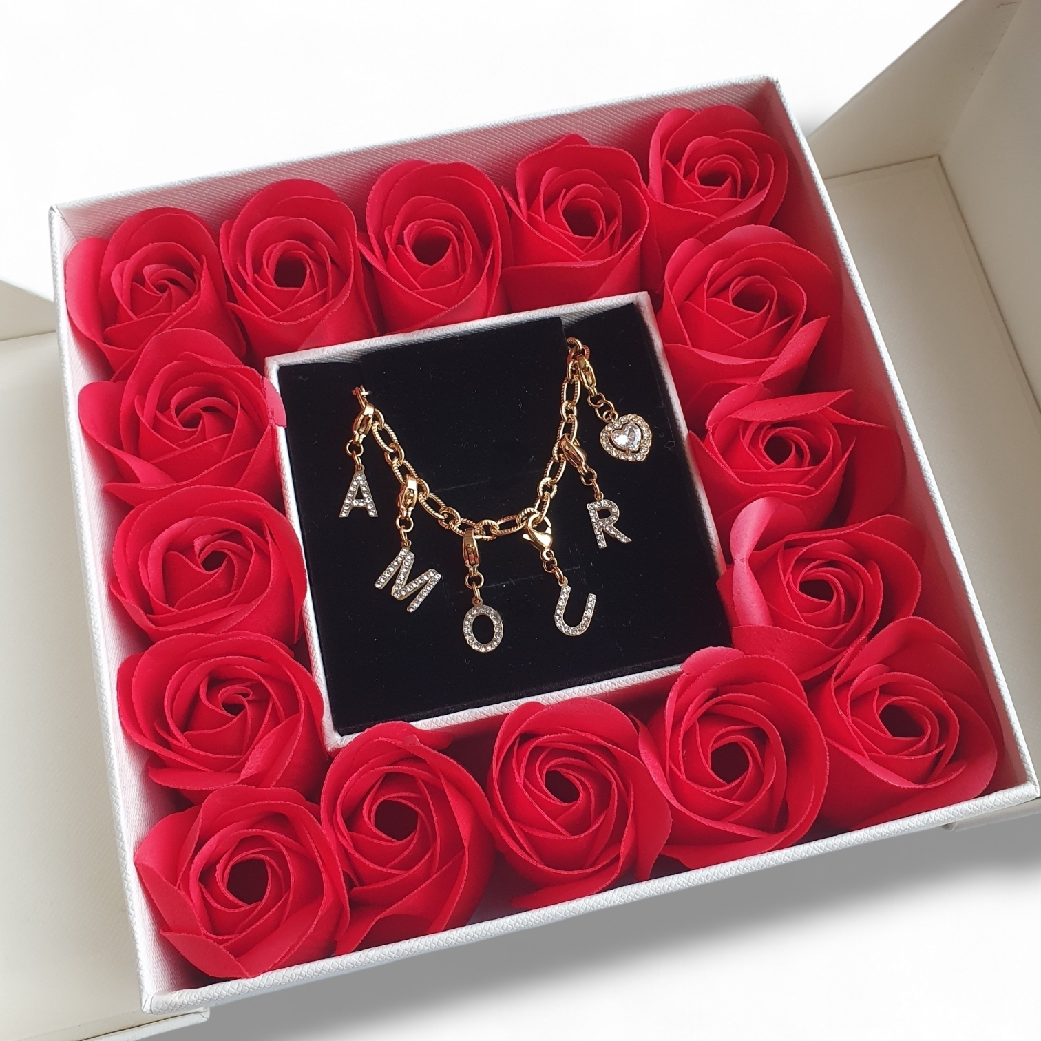Le tout est sublimé par plusieurs fleurs rouges artificielles, apportant une touche romantique et passionnée.