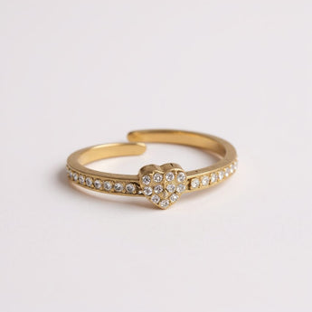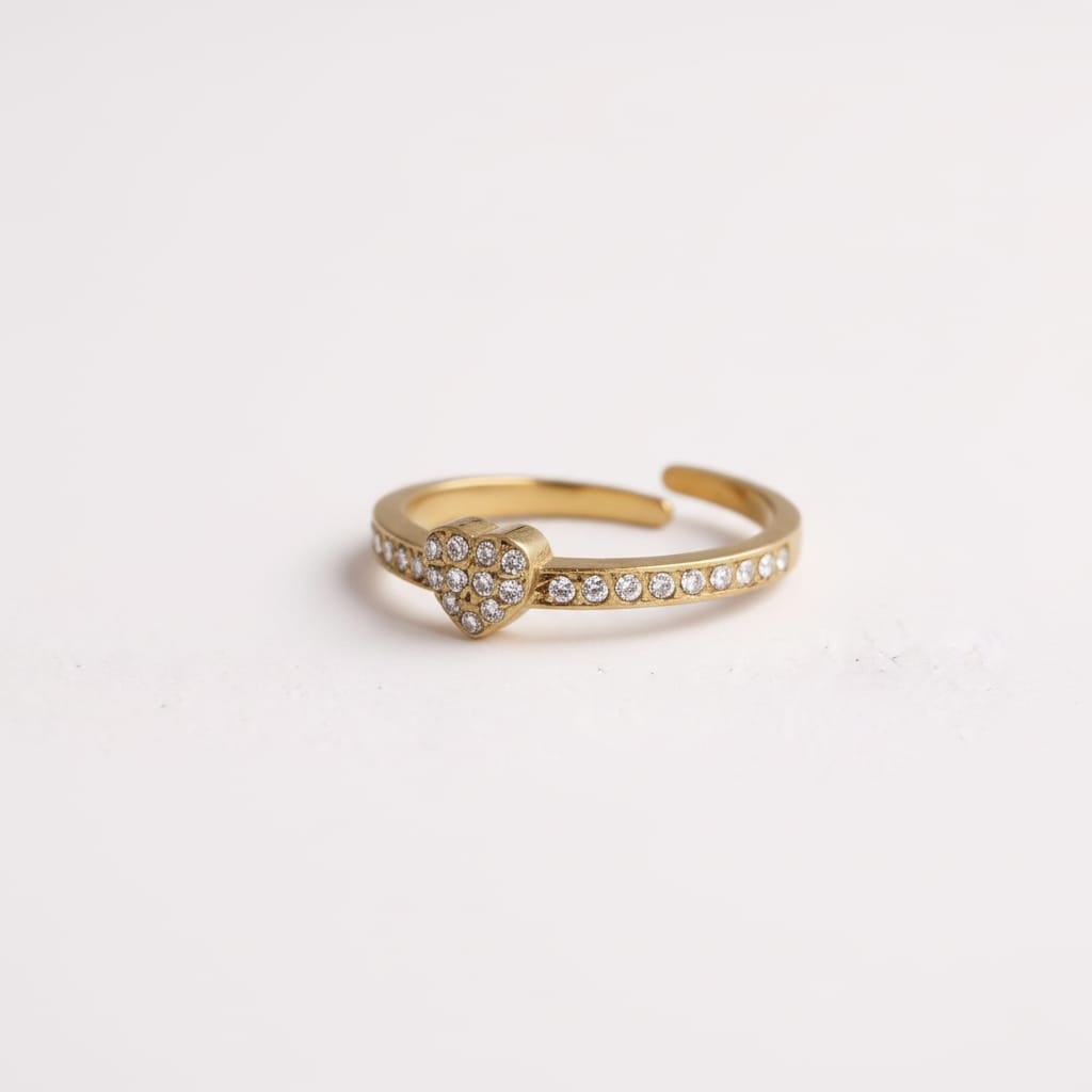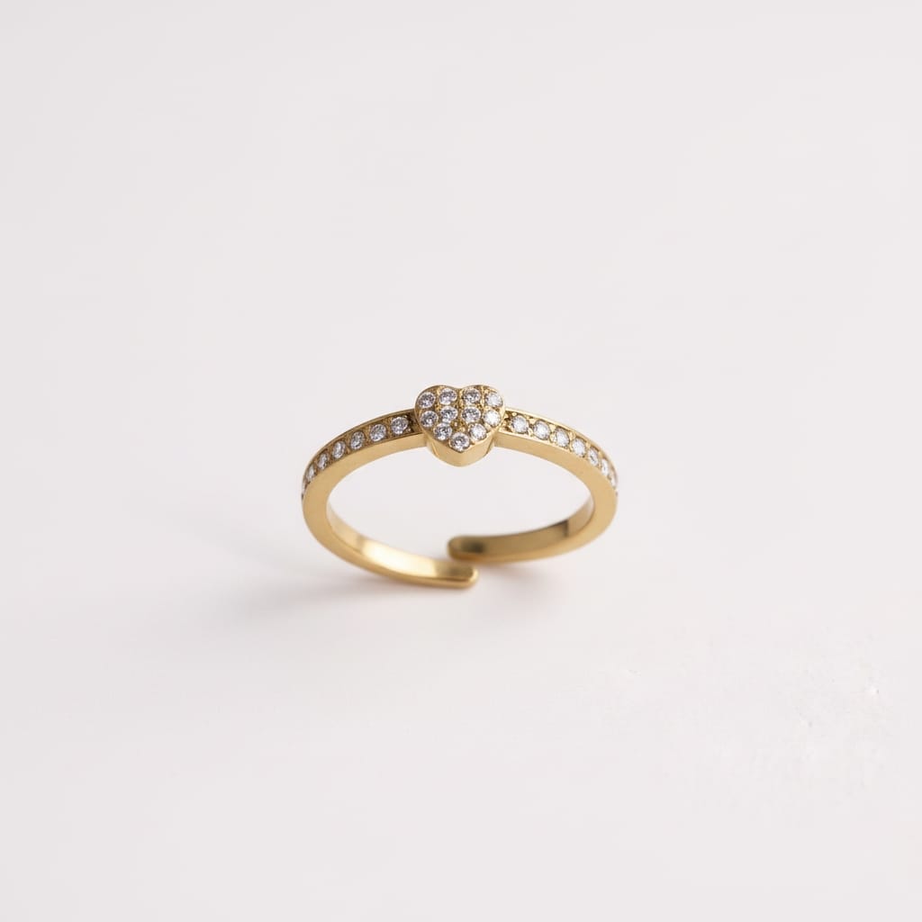 • Bague ajustable au design fin et délicat, composée d’un anneau lisse légèrement ouvert, surmonté d’un motif cœur pavé de petits zircons blancs, apportant un volume subtil et un style romantique
