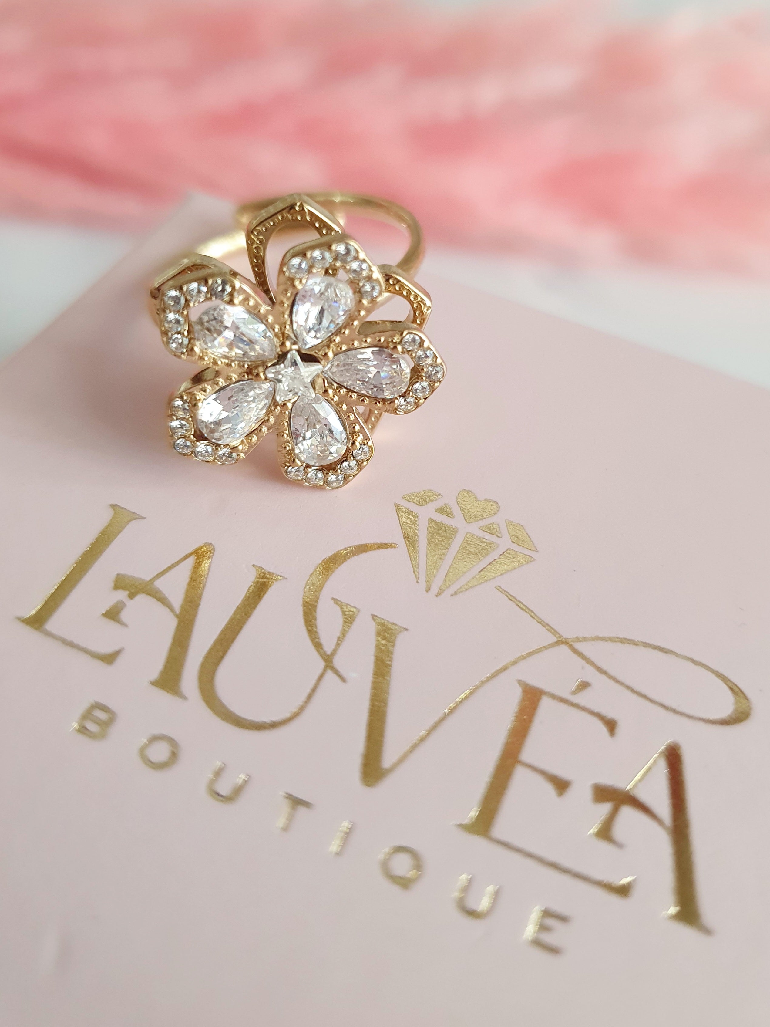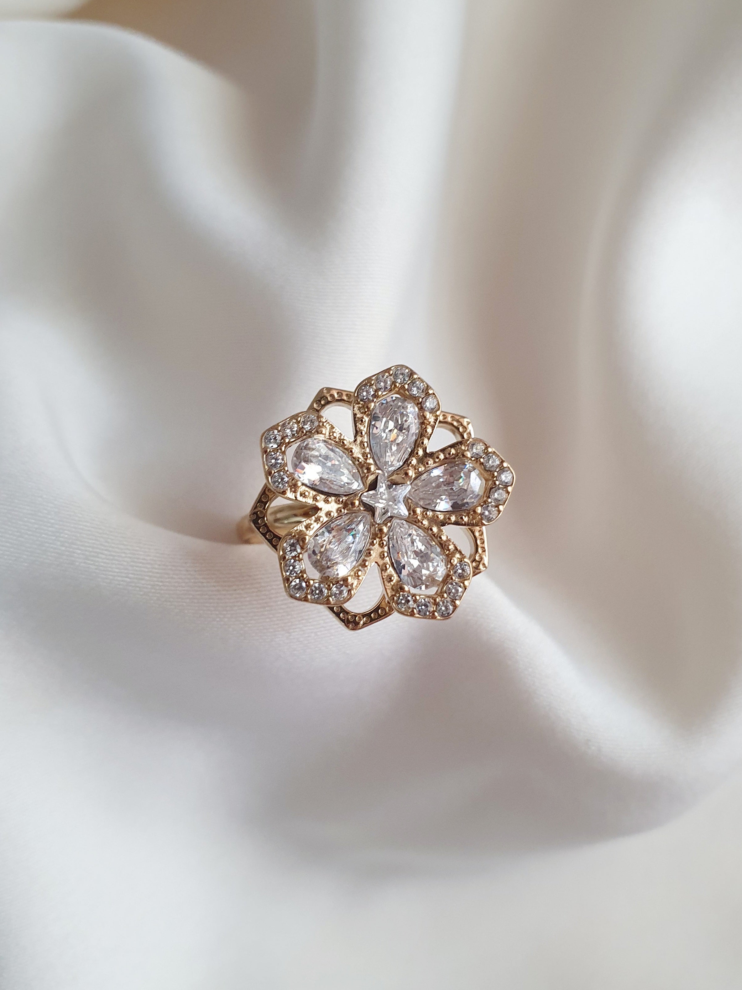 - Design floral élégant : une fleur à cinq pétales serties de pierres brillantes