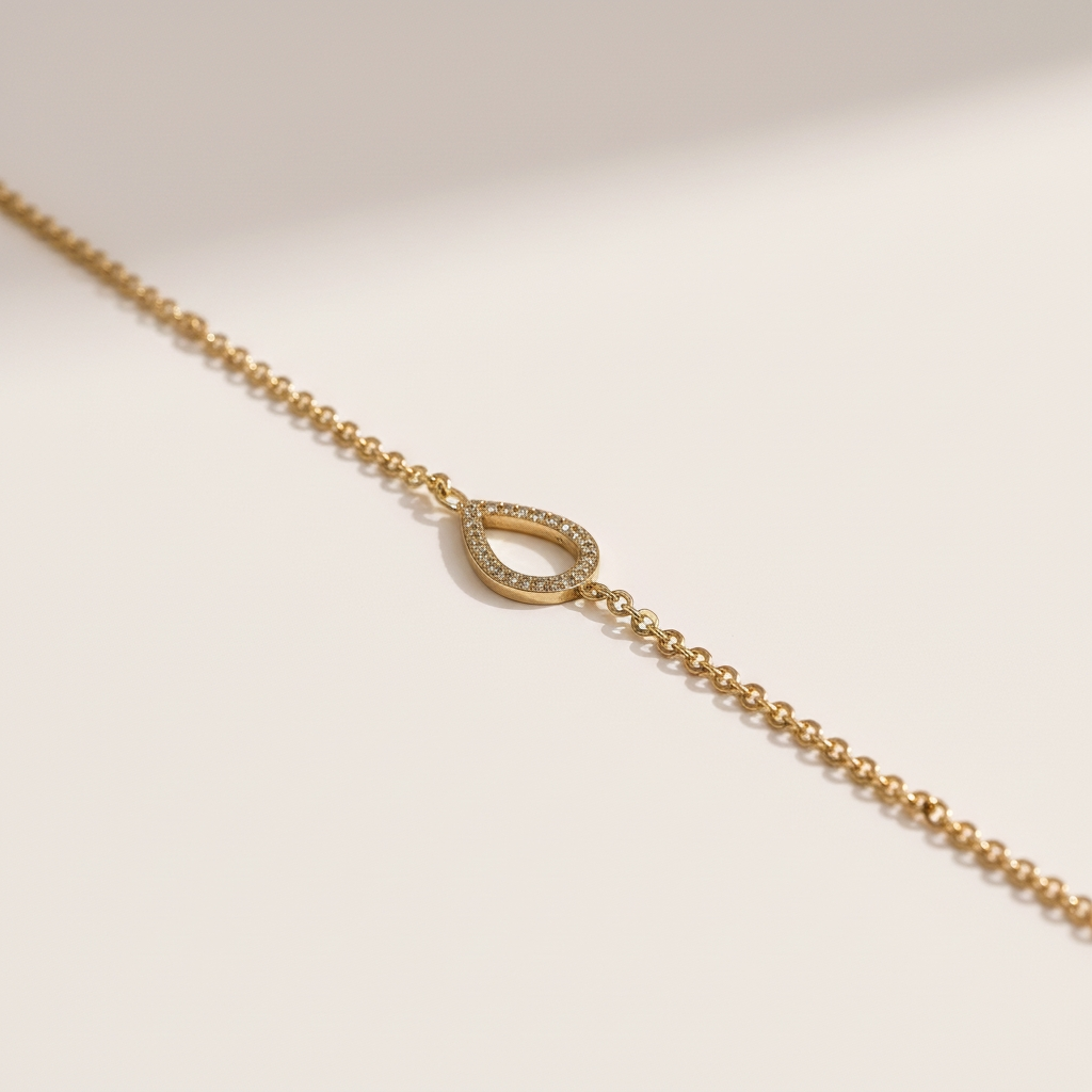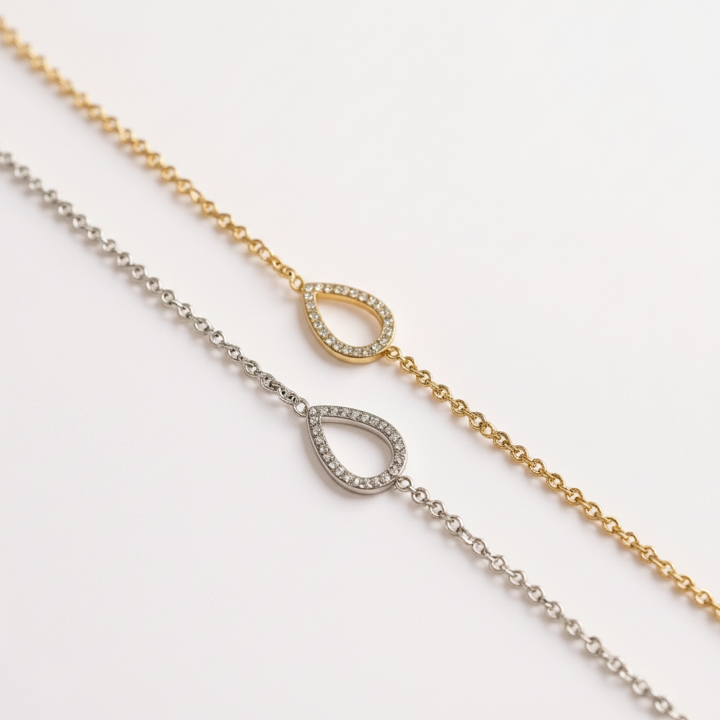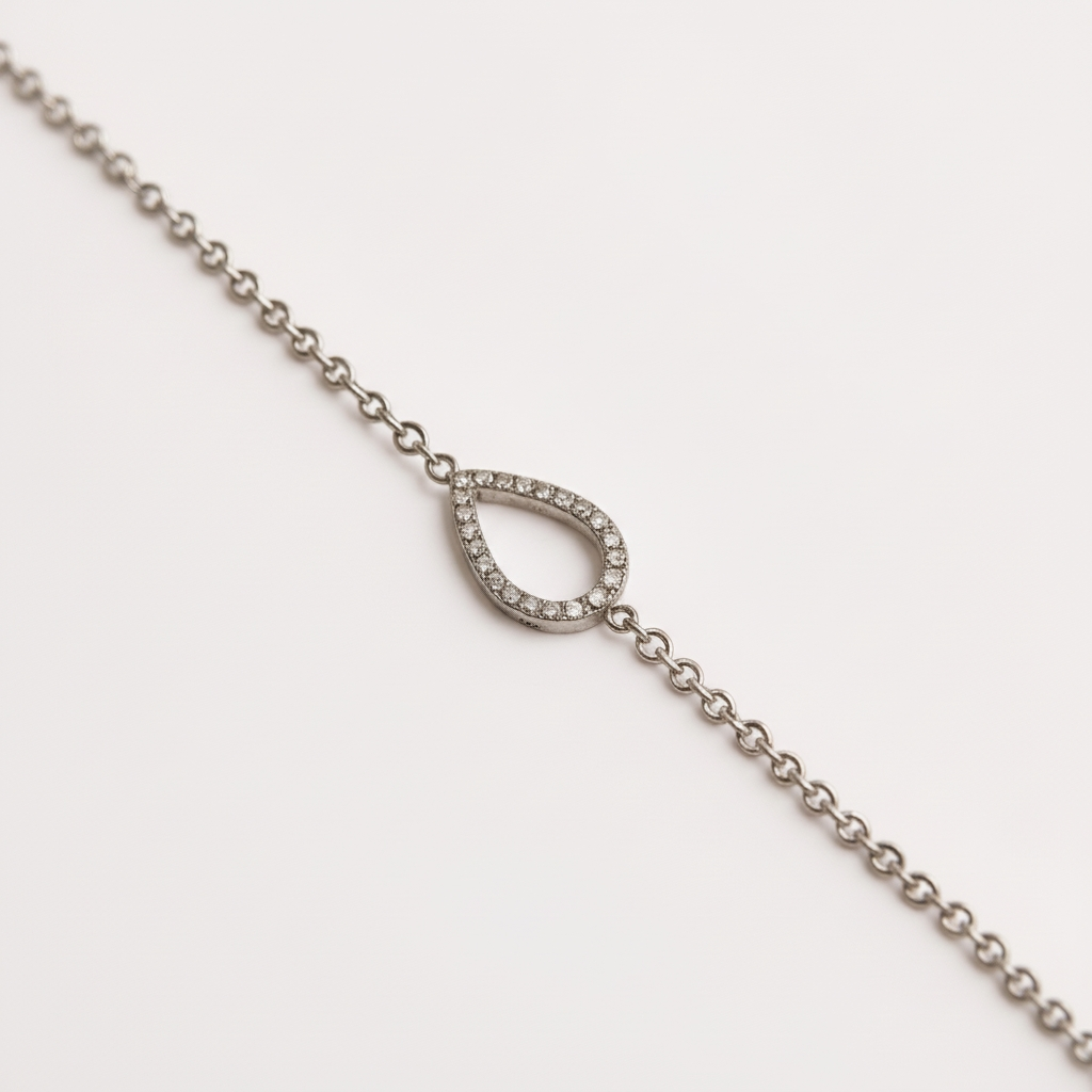 • Collier et bracelet ornés d’un motif goutte serti de pierres lumineuses, dont la forme évoque une larme délicate, symbole d’émotion et de douceur