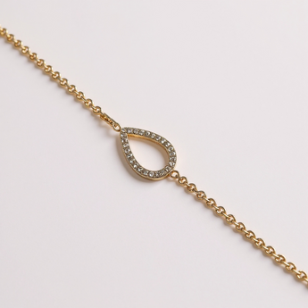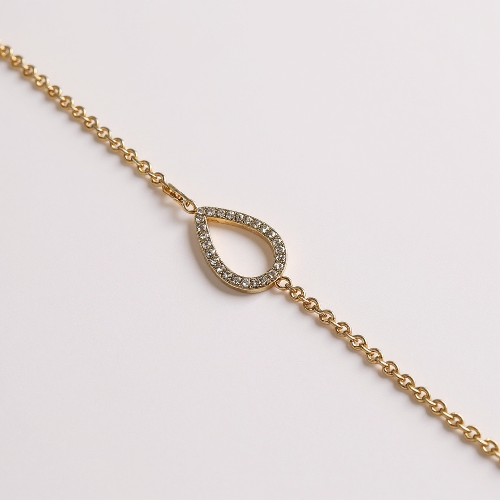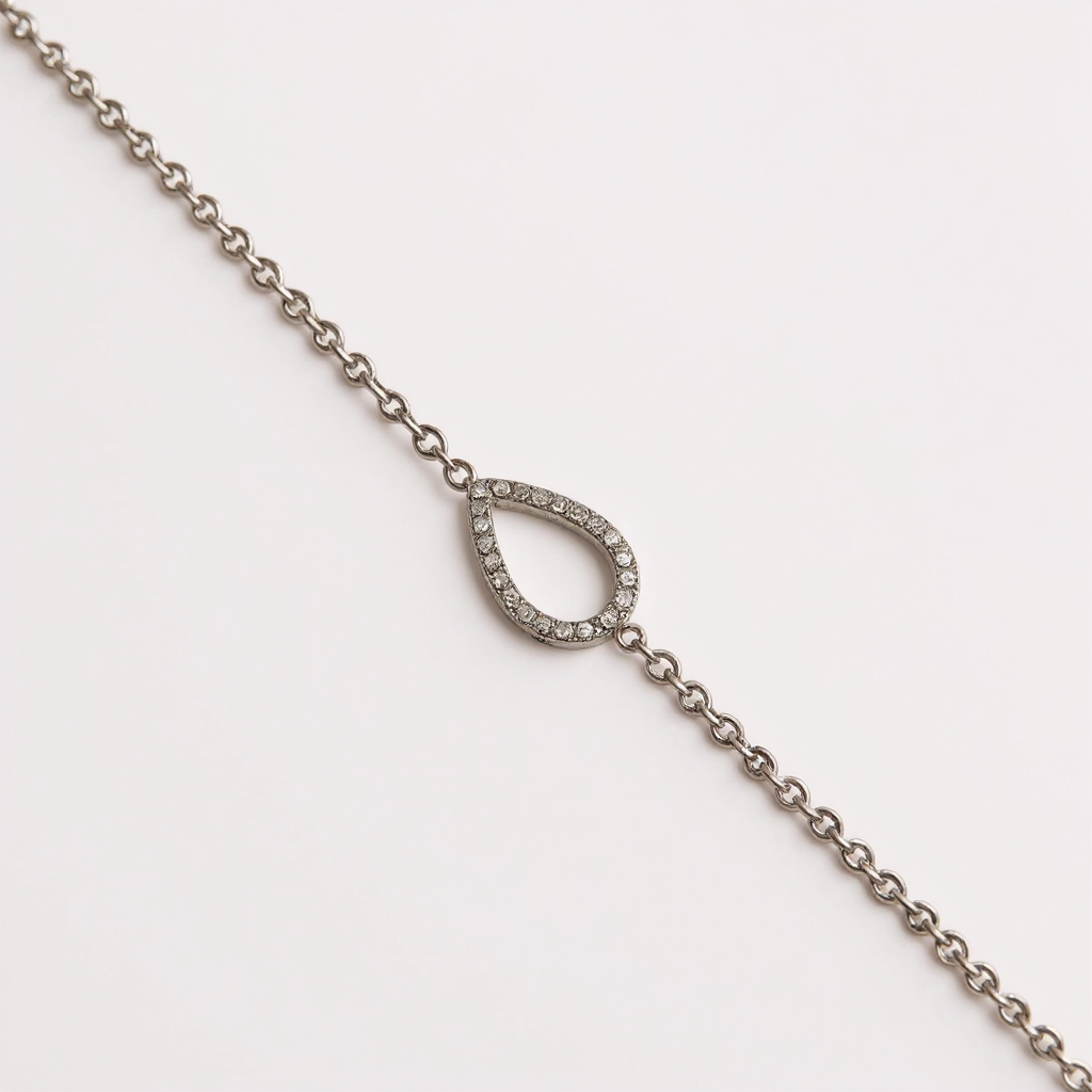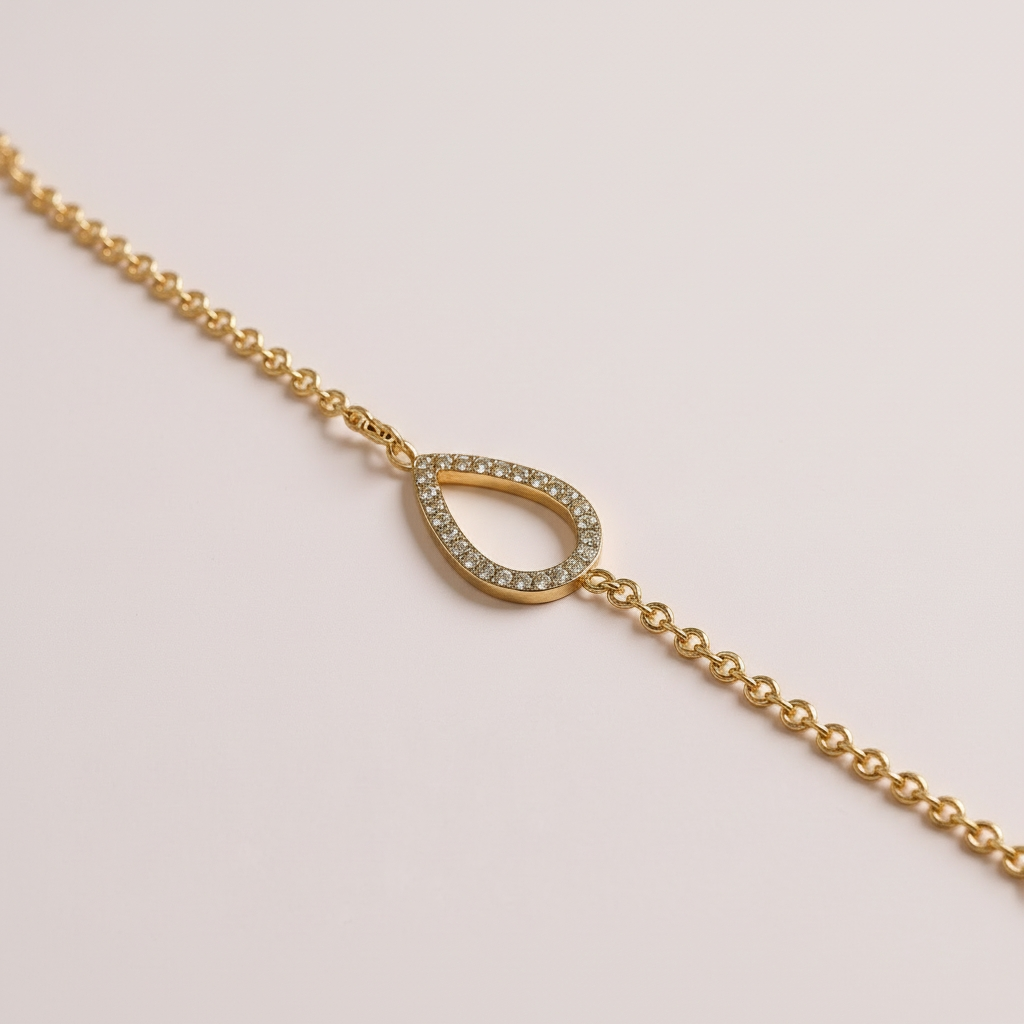 • Collier et bracelet ornés d’un motif goutte serti de pierres lumineuses, dont la forme évoque une larme délicate, symbole d’émotion et de douceur