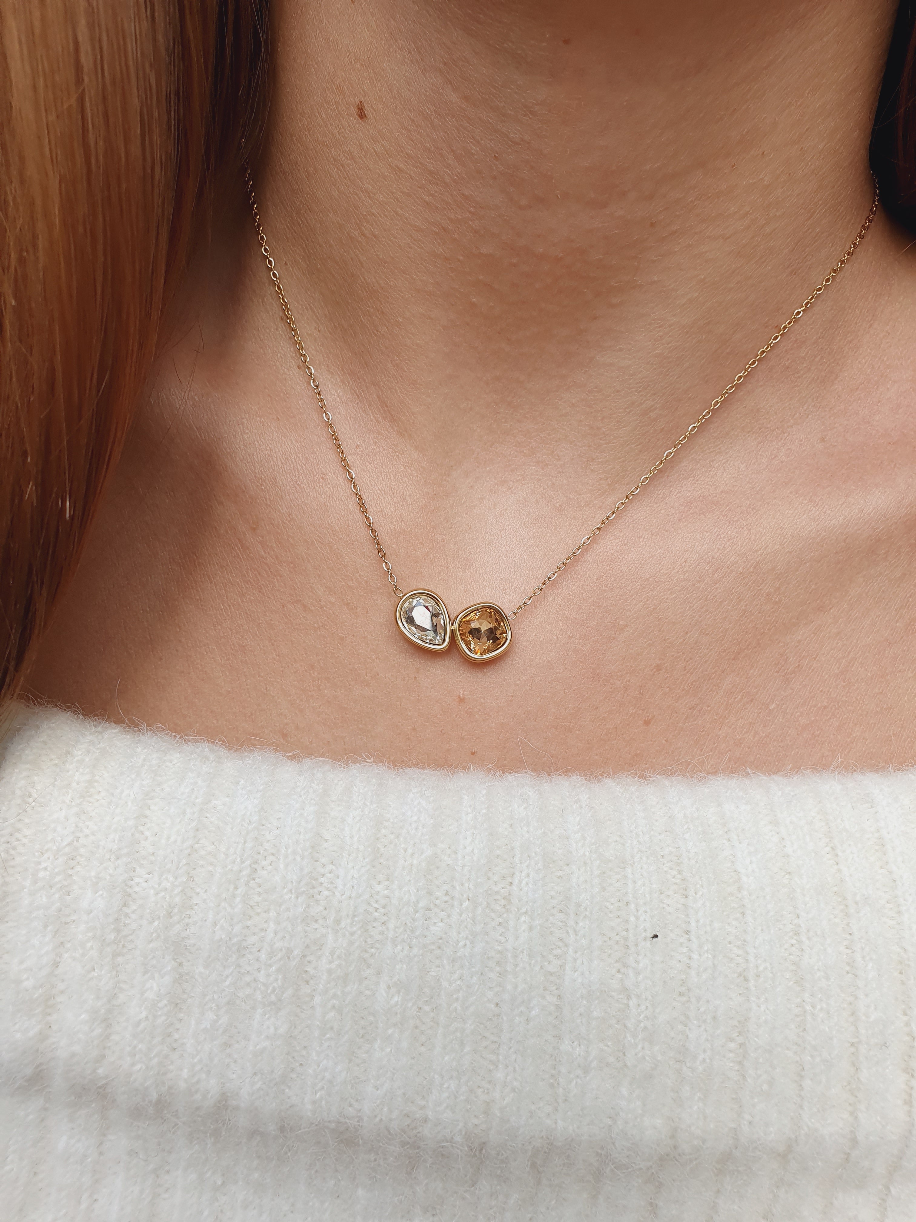 Le bracelet et le collier Cristaux d’Hiver dévoilent deux cristaux délicatement sertis dans une monture dorée, créant un jeu de lumières subtil et harmonieux.