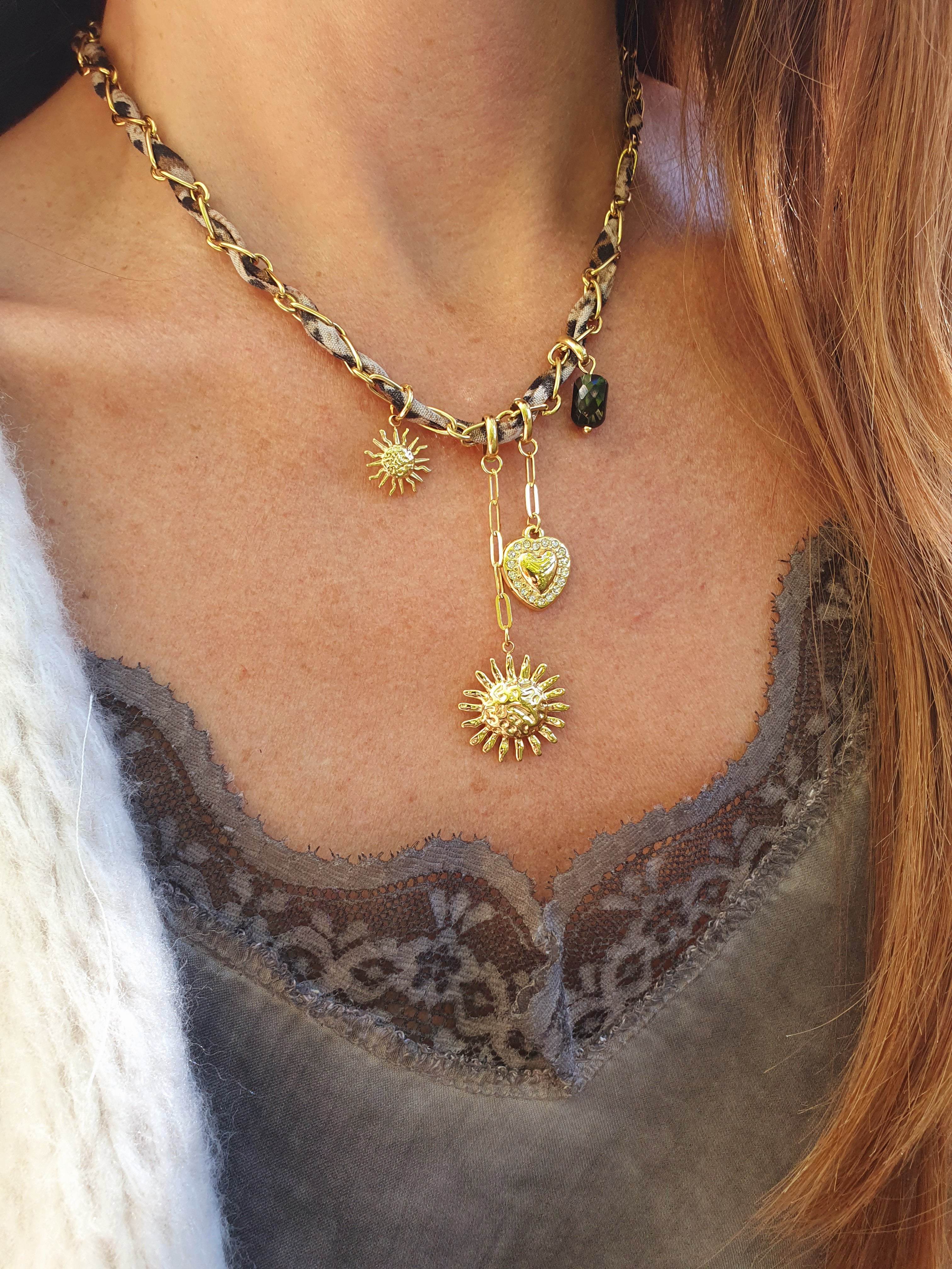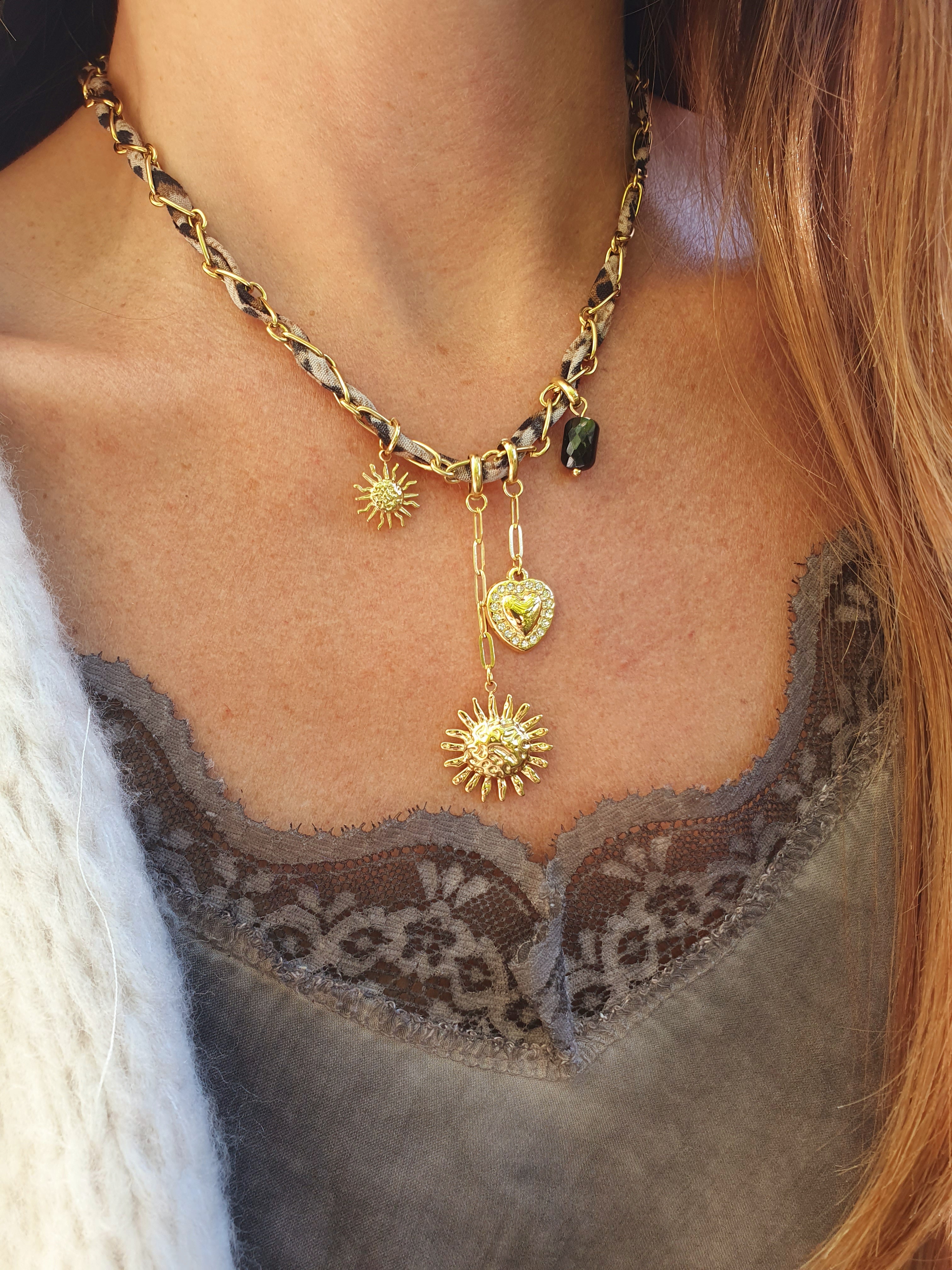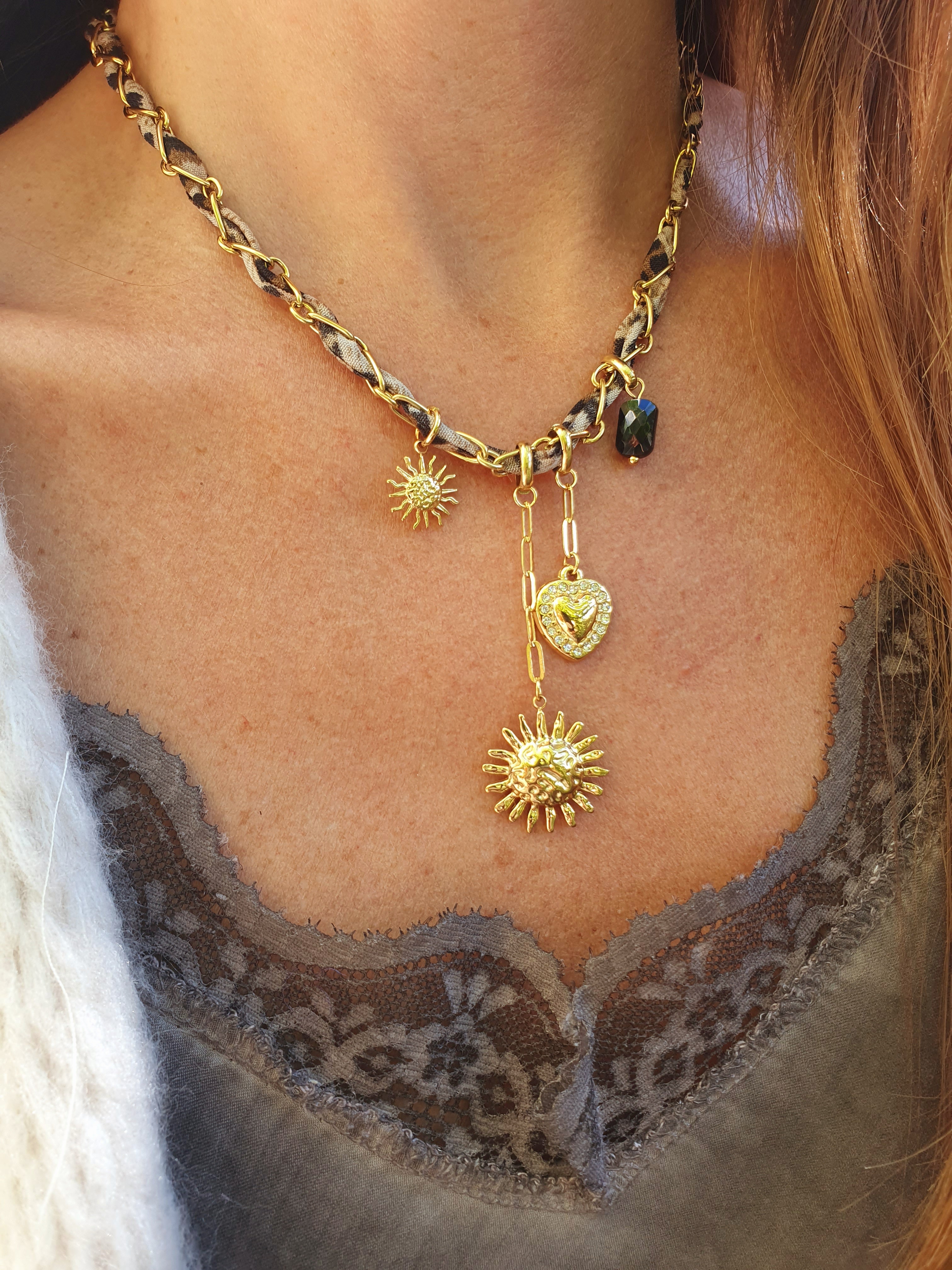 Ces colliers sont composés d’un cordon rigide imprimé Léopard, pensé pour garder sa forme et maintenir les breloques en valeur.