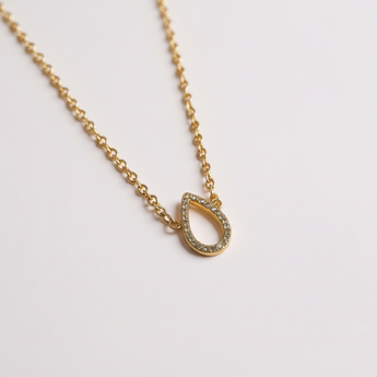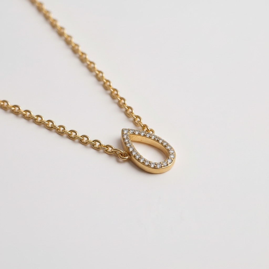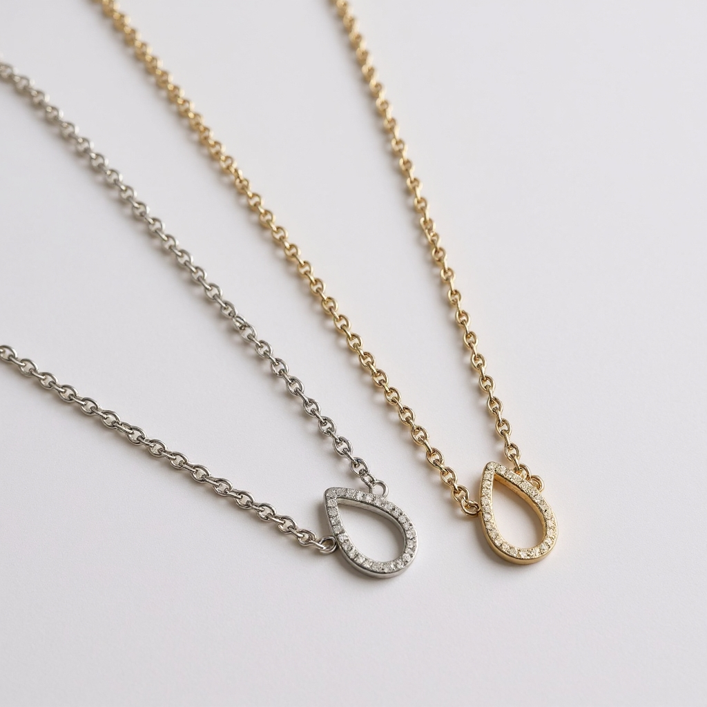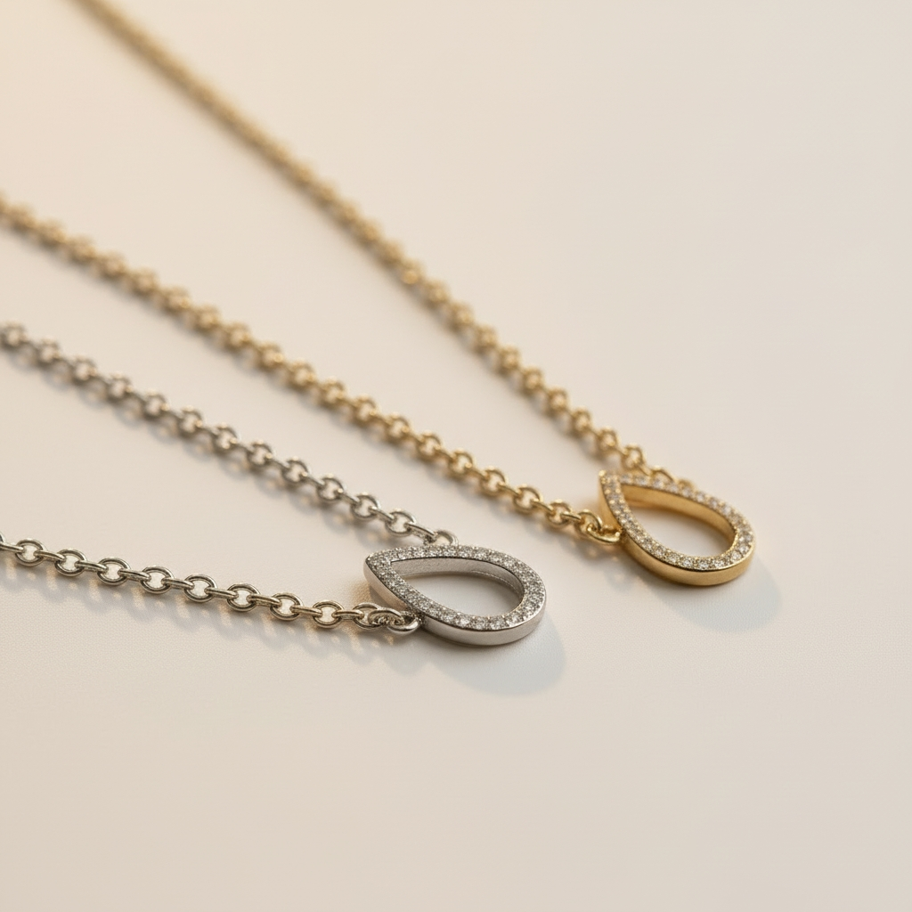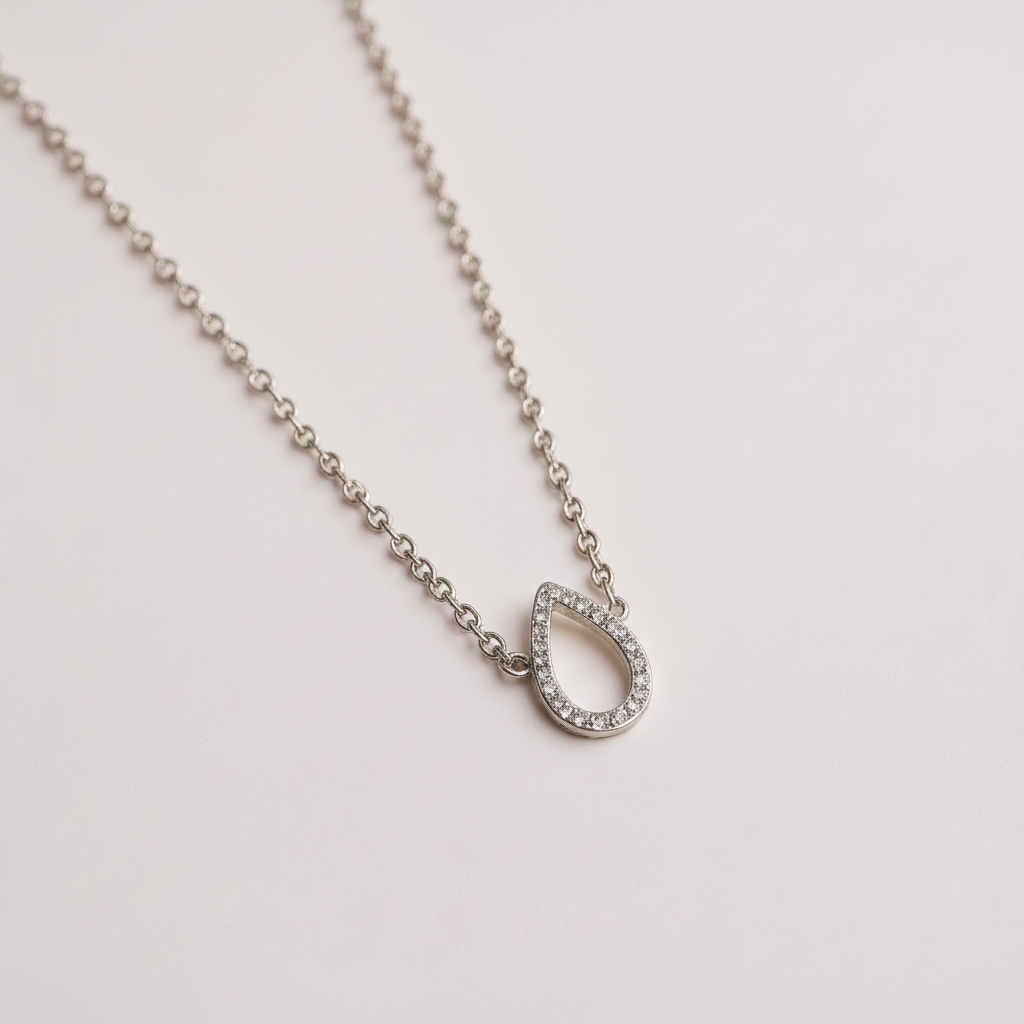 • Collier et bracelet ornés d’un motif goutte serti de pierres lumineuses, dont la forme évoque une larme délicate, symbole d’émotion et de douceur