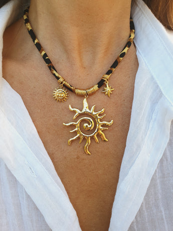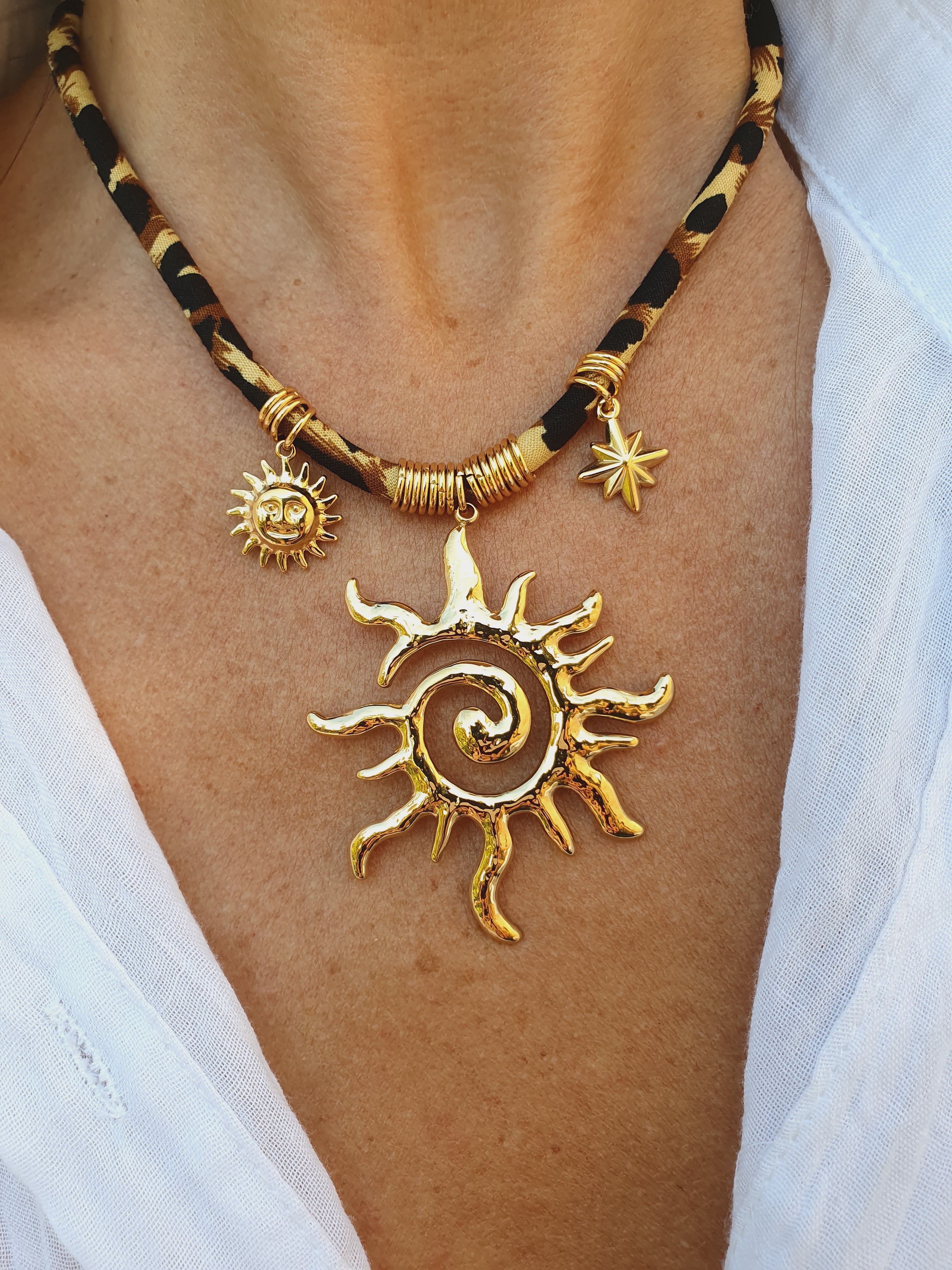 Ces colliers sont composés d’un cordon rigide imprimé Léopard, pensé pour garder sa forme et maintenir les breloques en valeur.