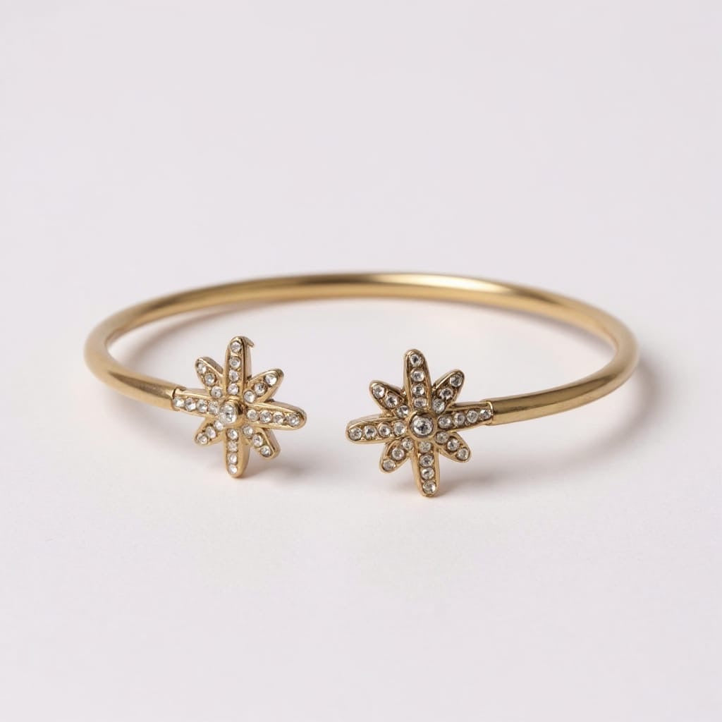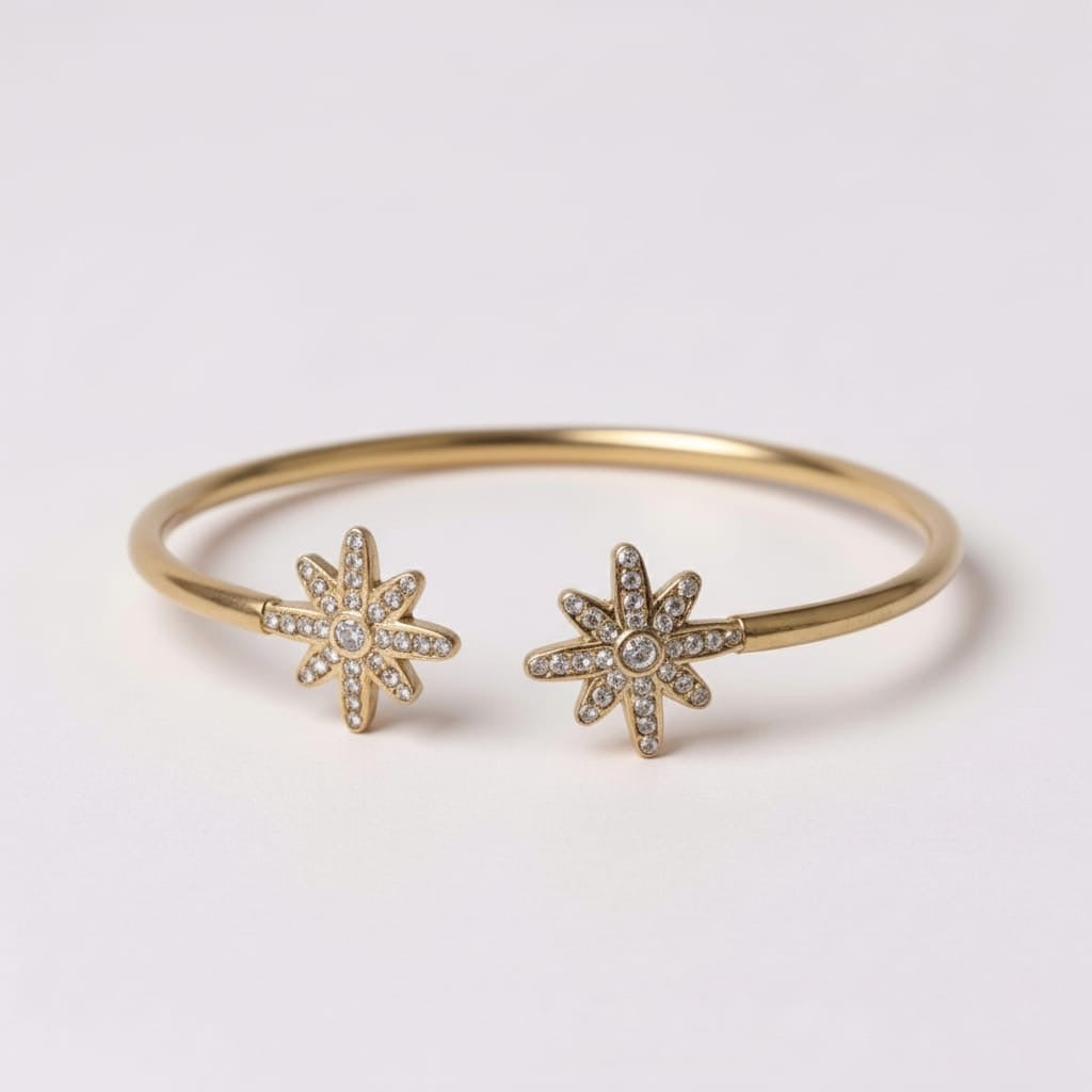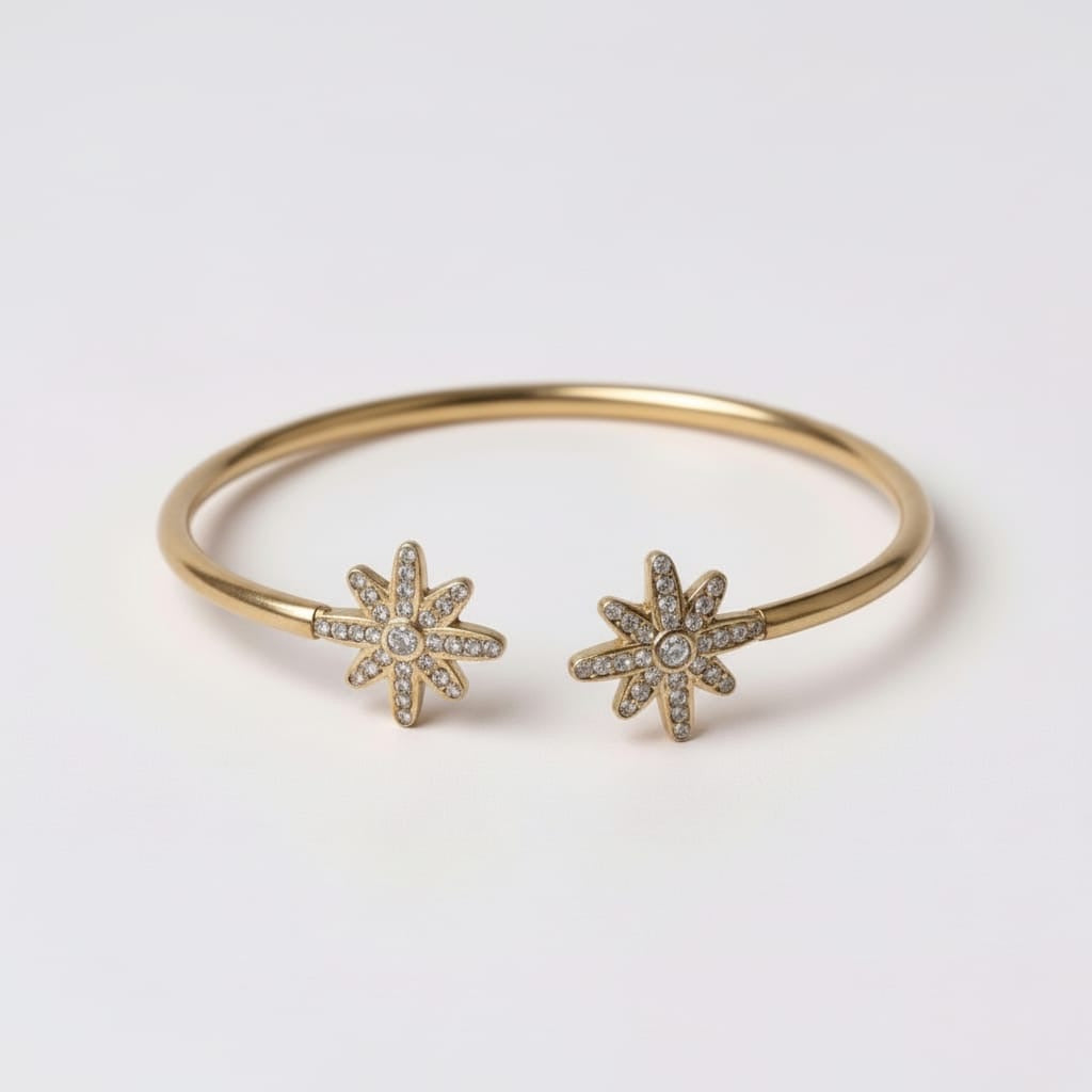 • Jonc ouvert au design fin et délicat, composé de deux motifs étoilés pavés de zircons blancs se faisant face, créant un équilibre harmonieux et une symbolique de lien et de connexion