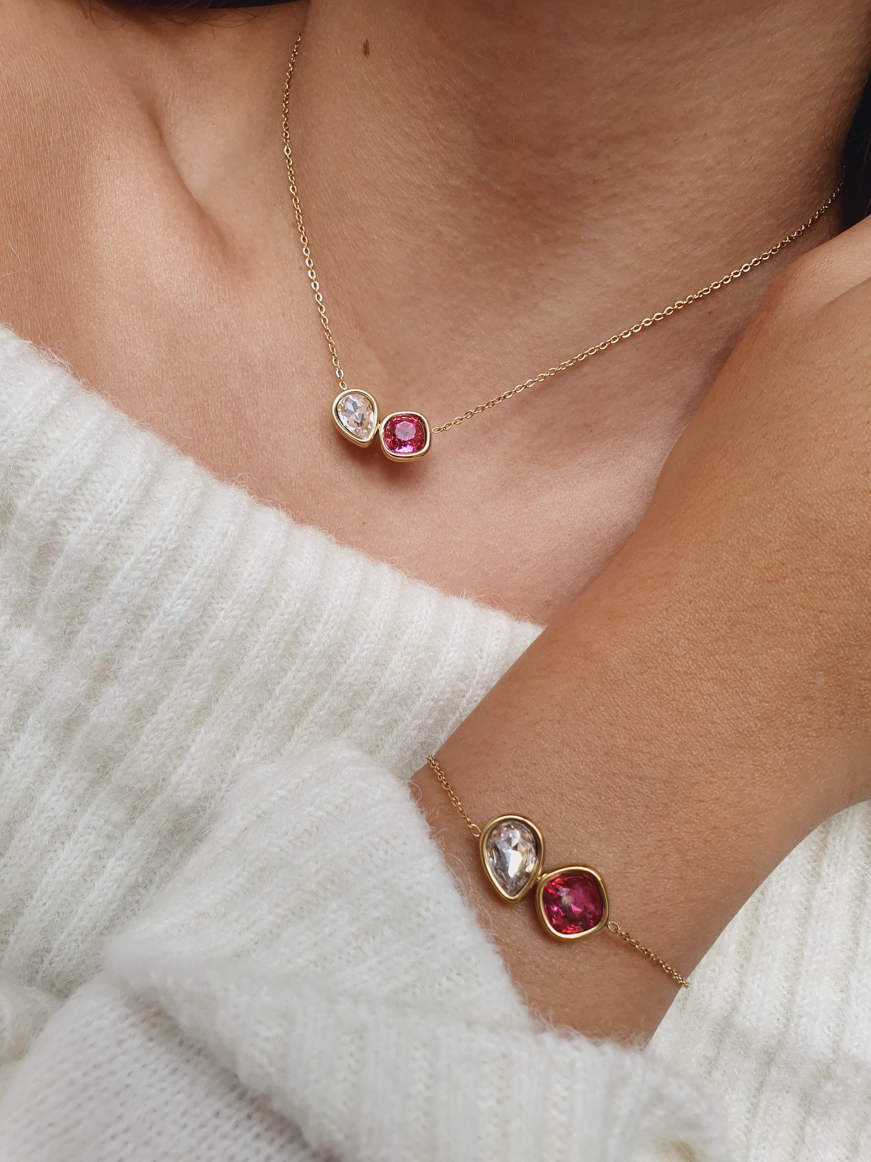 Le bracelet et le collier Cristaux d’Hiver dévoilent deux cristaux délicatement sertis dans une monture dorée, créant un jeu de lumières subtil et harmonieux.